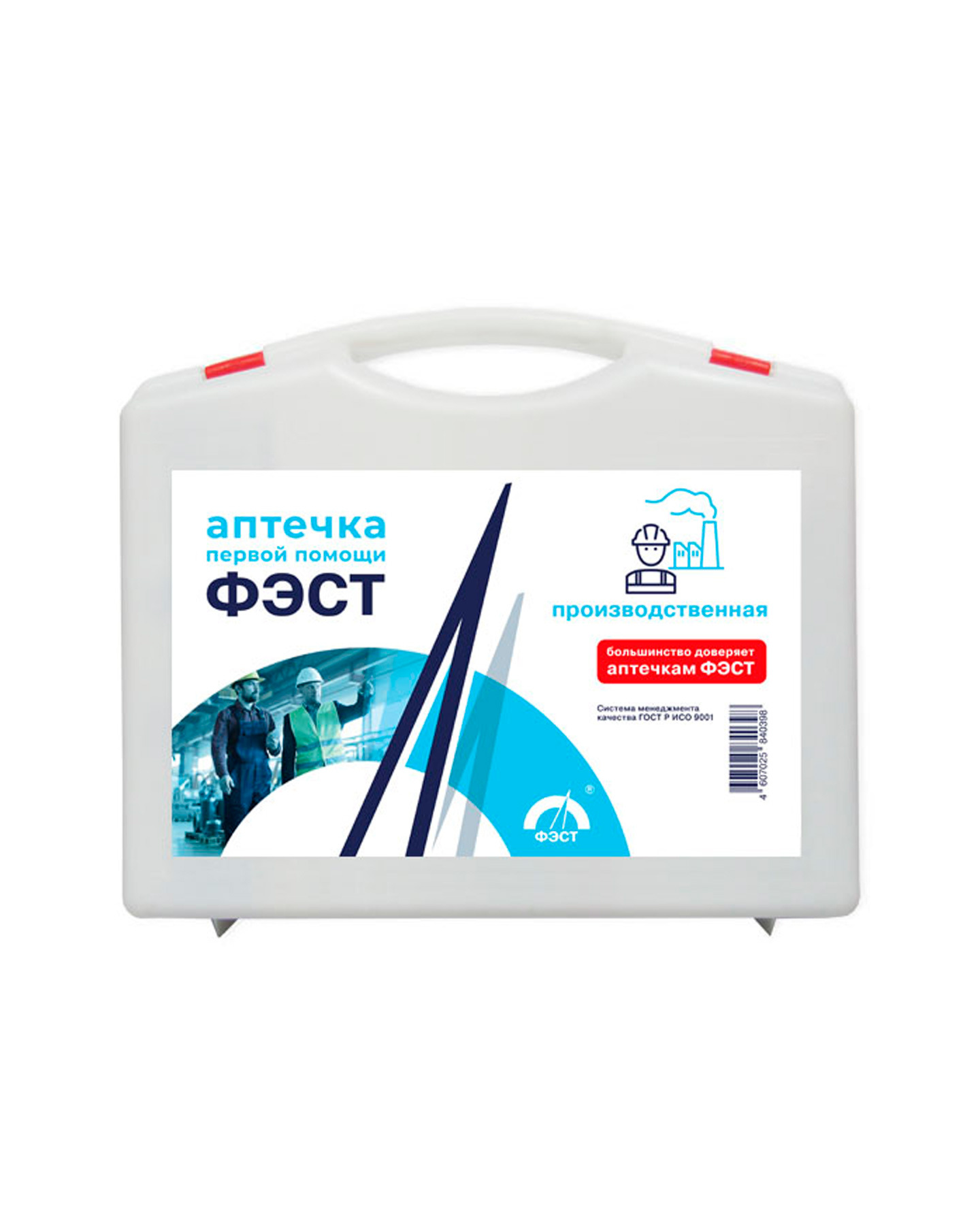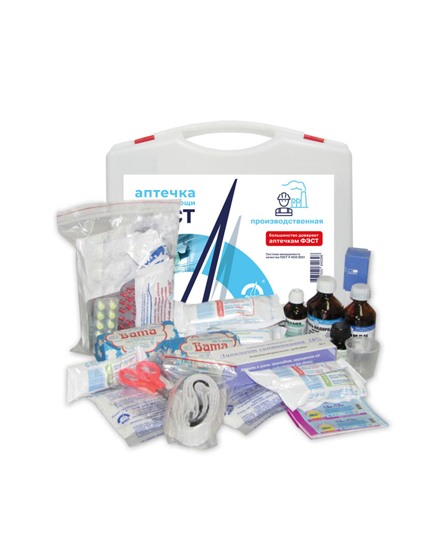 Для оснащения промышленных предприятий — 30 человек. ТУ 9398-037-10973749-20151 Анальгин, табл. 500 мг №10 2 уп. футляр из полистирола — 285x255x100 мм Состав: 1. Анальгин, табл. 500 мг №10 2 уп. 2. Ацетилсалициловая кислота, табл. 500 мг №10 2 уп. 3. Гипотермический (охлаждающий) пакет 2 шт. 4. Дротаверин (но-шпа), табл. 40 мг №10 1 уп. 5. Жгут кровоостанавливающий 1 шт. 6. Бинт стерильный 5 м × 10 см или 5 м × 7 см 2 шт. 7.Бинт нестерильный 5 м × 10 см 2 шт. 8. Бинт нестерильный 5 м × 5 см 2 шт. 9. Салфетки или покрытия стерильные, не менее 6 × 10 см (антимикробные) 2 уп. 10. Лейкопластырь бактерицидный 1,9 см x 7,2 см 10 уп. 11. Салфетки или покрытия стерильные, 6 × 10 см (кровоостанавливающие) 1 уп. 12. Бриллиантового зеленого раствор 1%, 10 мл 1 фл. 13. Лейкопластырь 1 × 250 см 1 уп. 14. Бинт эластичный трубчатый медицинский нестерильный №1, 3, 6 по 1 шт. 15. Вата нестерильная, 50 г 2 уп. 16. Сульфацила натрия раствор 20%, 1 мл №2 тюбик-капельница или 5 мл флакон-капельница 1 уп. / 1 фл. 17. Перекиси водорода раствор 3%, 40 мл 1 фл. 18. Линимент синтомицина 5% или 10%, 25 г 1 туб. 19. Нитроглицерин, капс. 0,5 мг №20 или табл. 0,5 мг №40 1 уп. 20 Валидол, табл. 60 мг №6 или №10 3 уп. 21. Устройство для проведения искусственного дыхания “Рот-Устройство-Рот” 1 шт. 22. Аммиака раствор 10%, 40 мл 1 фл. 23. Уголь активированный, табл. 250 мг №10 2 уп. 24. Корвалол, 15 мл 1 фл. 25. Ножницы 1 шт. 26. Стаканчик для приема лекарств 1 шт. 27. Футляр для аптечки 1 шт.