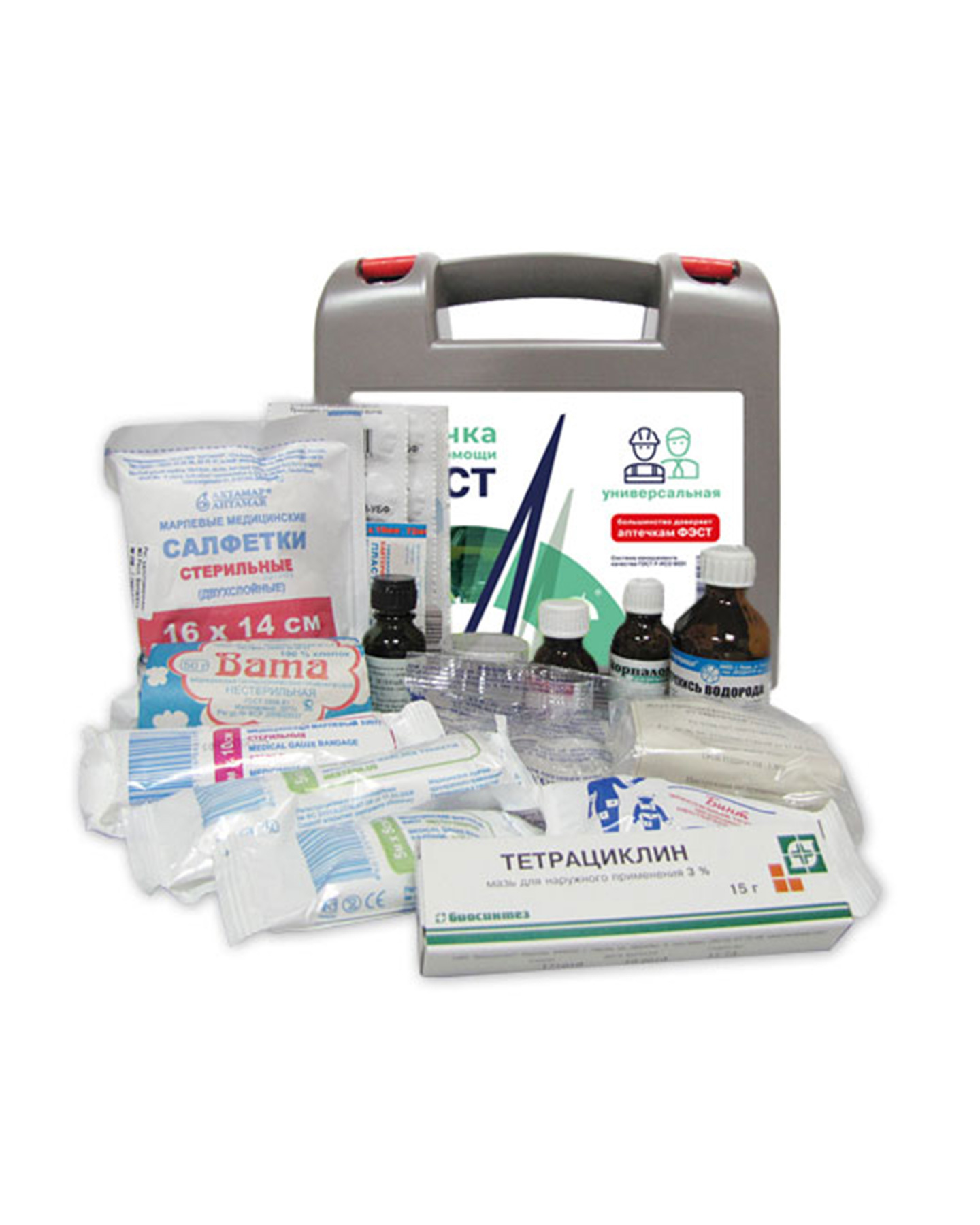 Для оказания неотложной медицинской помощи в производственных условиях (для коллектива до 7 человек). Размер футляра: 210×210×75 мм Состав: 1 Анальгин, табл. 0,5 №10 1 уп. 2 Валидол, табл. 0,06 №6 1 уп. 3 Уголь активированный, табл. 0,25 №10 2 уп. 4 Бинт стерильный 5 м х 10 см или 5 м x 7 см 1 шт. 5 Бинт нестерильный 5 м х 10 см 1 шт. 6 Бинт нестерильный 5 м х 5 см 1 шт. 7 Бинт эластичный трубчатый медицинский нестерильный №1, 3, 6 по 1 шт. 8 Вата, 50 г 1 уп. 9 Бриллиантового зеленого раствор 1%, 10 мл 1 фл. 10 Аммиака раствор 10%, 10 мл 1 фл. 11 Экстракт валерианы, табл. 0,02 №10 1 уп. 12 Лейкопластырь бактерицидный 1,9 x 7,2 см 4 уп. 13 Жгут кровоостанавливающий 1 шт. 14 Гипотермический (охлаждающий) пакет 1 шт. 15 Стаканчик для приема лекарств 1 шт. 16 Перекиси водорода раствор 3%, 40 мл 1 фл. 17 Салфетки марлевые медицинские стерильные 16 x 14 см, №20 1 уп. 18 Тетрациклиновая мазь 3%, 15 г 1 уп.