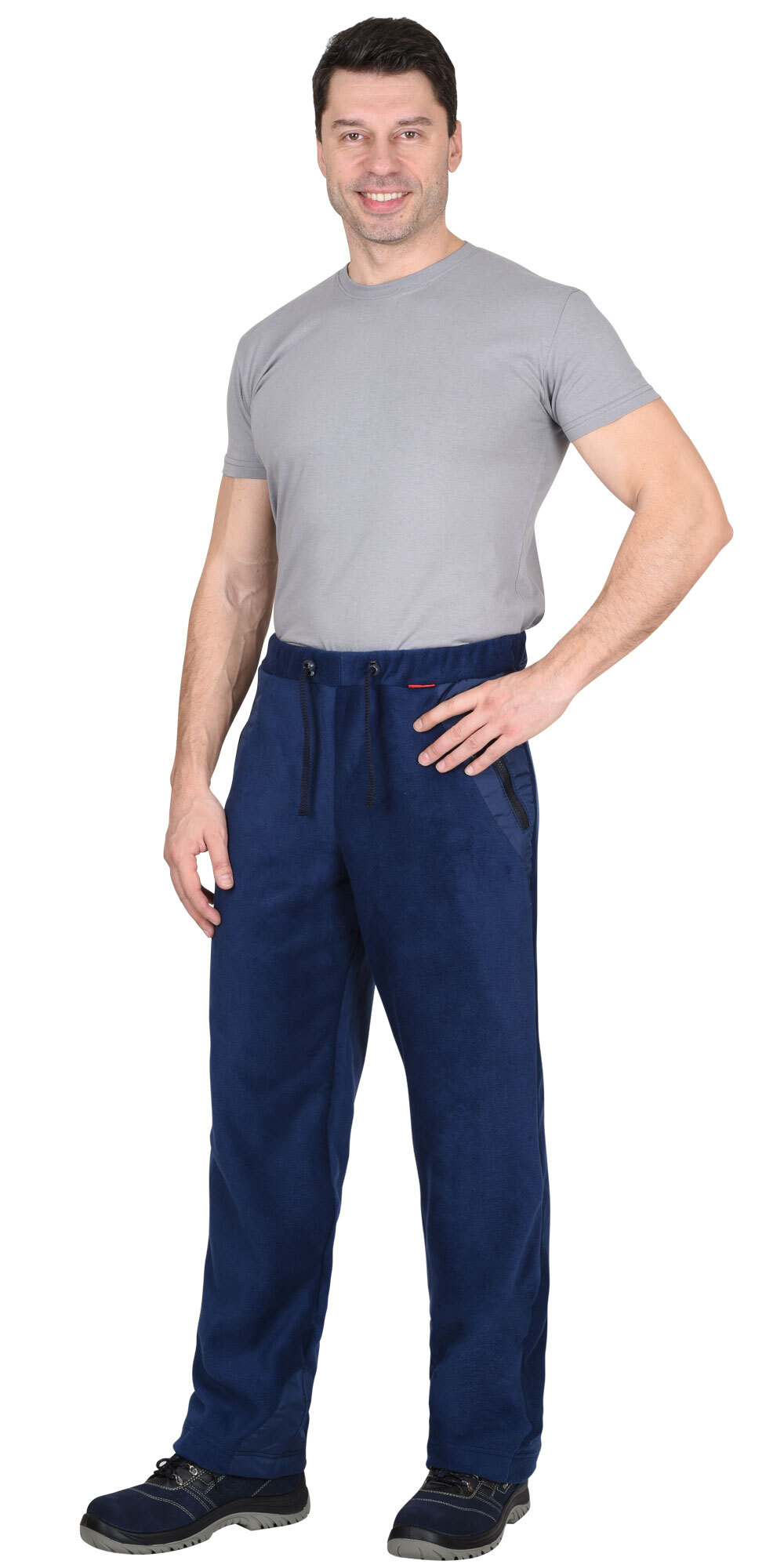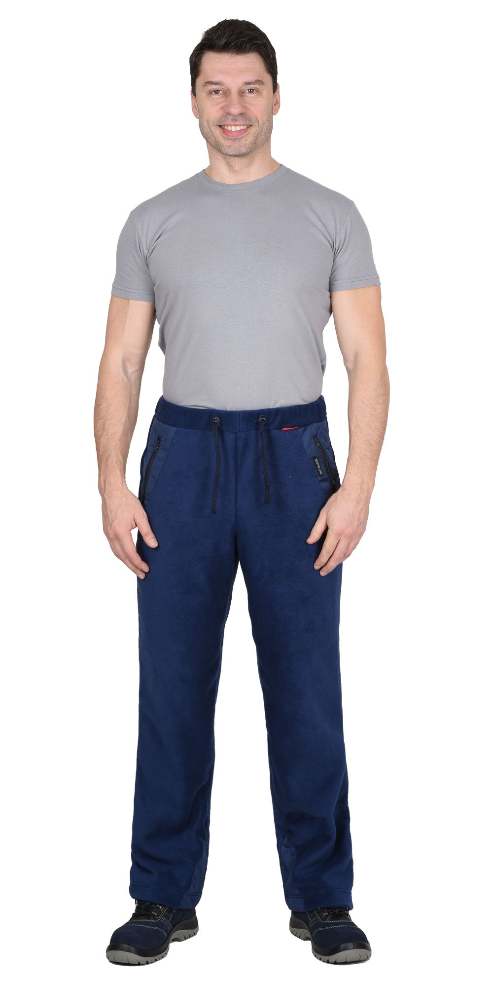 Брюки прямого покроя; с притачным поясом стянутым эластичной тесьмой и шнуром с фиксаторами, с боковыми вертикальными карманами, застегивающимися на молнию. На брюках располагаются декоративные вставки из ткани Дюспо, сверху в области бокового шва и снизу по шаговому шву. ГОСТ 25295-2003