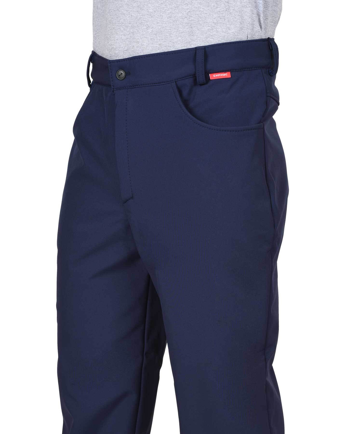 Брюки прямые, на притачном поясе, с застёжкой спереди гульфик на тесьму «молния». Брюки с боковыми внутренними карманами фигурным входом, на задних половинках с отрезной кокеткой. Ткань верха - «Софтшелл» состав: 100% п/э.; пл. 350 г/м ГОСТ 25295-2003