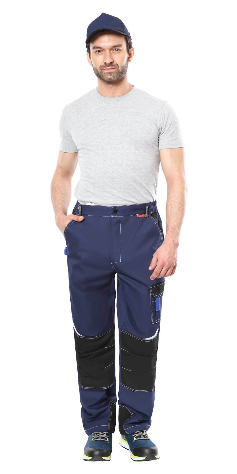 ГОСТ 12.4.280-2014, ТР ТС 019/2011 Брюки прямые, с застёжкой спереди на гульфик с молнией, с отрезным поясом, с боковыми внутренними карманами на передних половинках и накладными карманами на задних половинках и на левом боковом шве, с объемными наколенниками с нижним входом для амортизационного вкладыша. В брюках предусмотрены светоотражающие элементы. Материал верха основой: ткань смесовая с пропиткой ВО, пл. 245 г/м², состав 65%ПЭ, 35%ХБ, цвет: темно-синий Материал отделки: ткань смесовая с пропиткой ВО, пл. 245 г/м², состав 65%ПЭ, 35%ХБ цвет: черный Светоотражающий материал: декоративный СОП