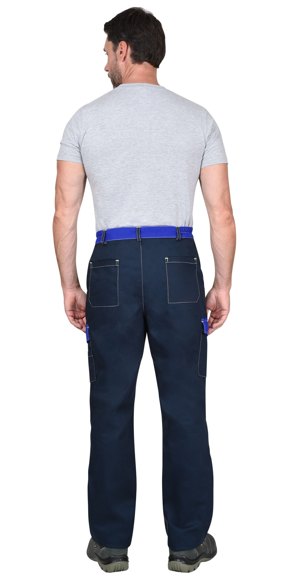 Брюки с застёжкой гульфика на молнию, внутренними боковыми карманами, с накладными объемными карманами на боковых швах с фигурными клапанами на липучке. Изделие с двумя накладными карманами на задних половинках, с объемными наколенниками и притачным поясом, застегивающимся на пуговицу, частично стянутым резинкой. В брюках на внутренних боковых карманах предусмотрен светоотражающий кант.