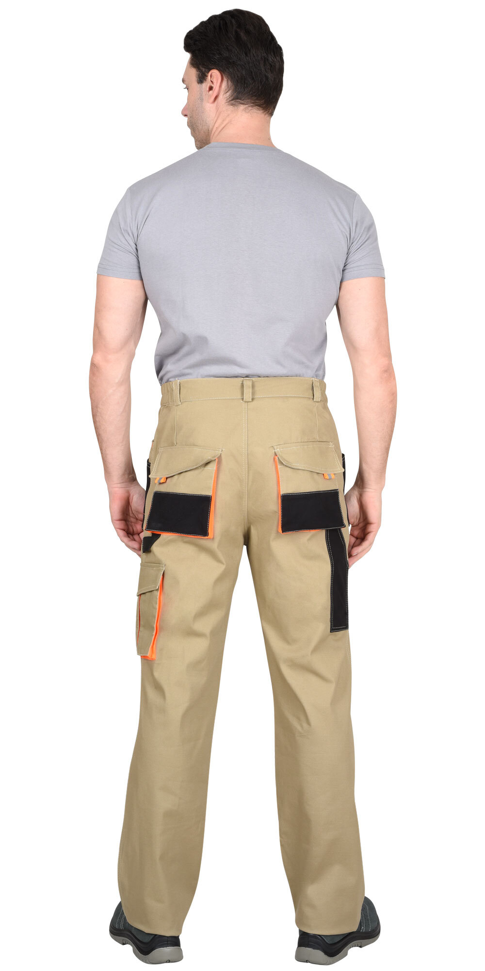 Брюки с застёжкой гульфика на молнию, с поясом на резинке, со шлевками, с накладными боковыми объемными карманами, с объемными наколенниками, с накладным объемным карманом на боковом шве с клапаном на липучке, двумя объемными карманами с клапанами на задних половинках, и карманами для инструментов.