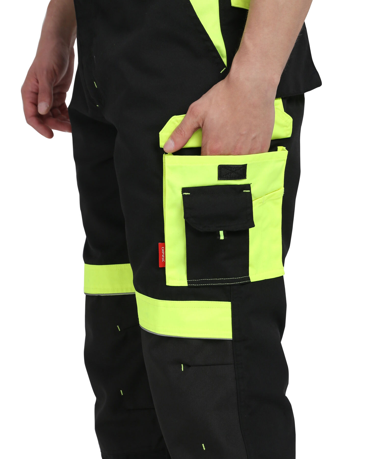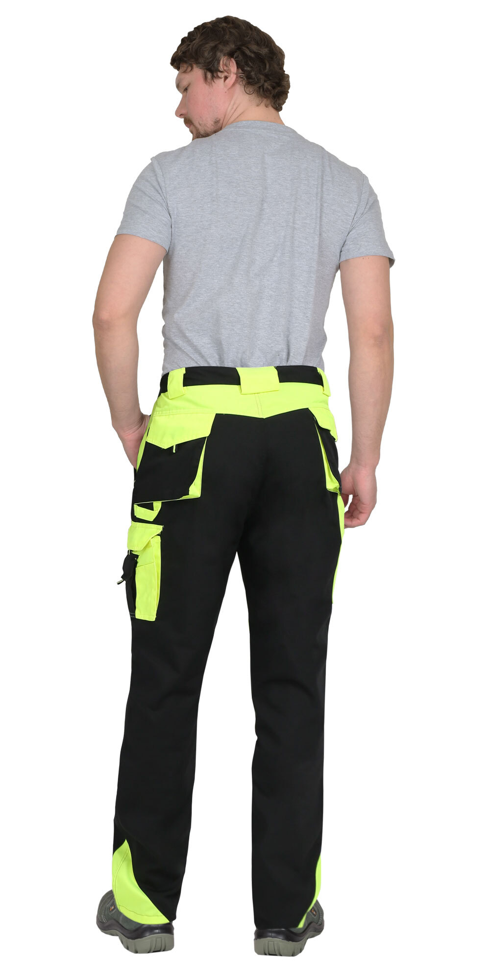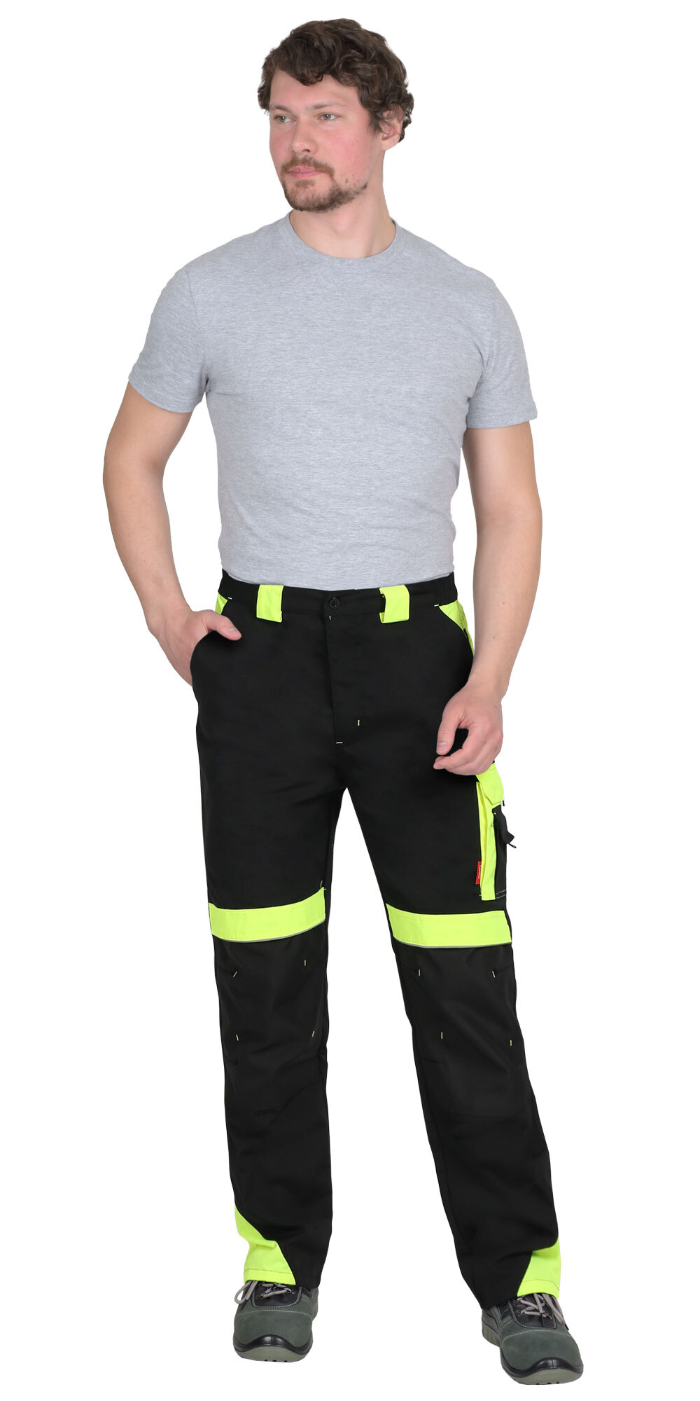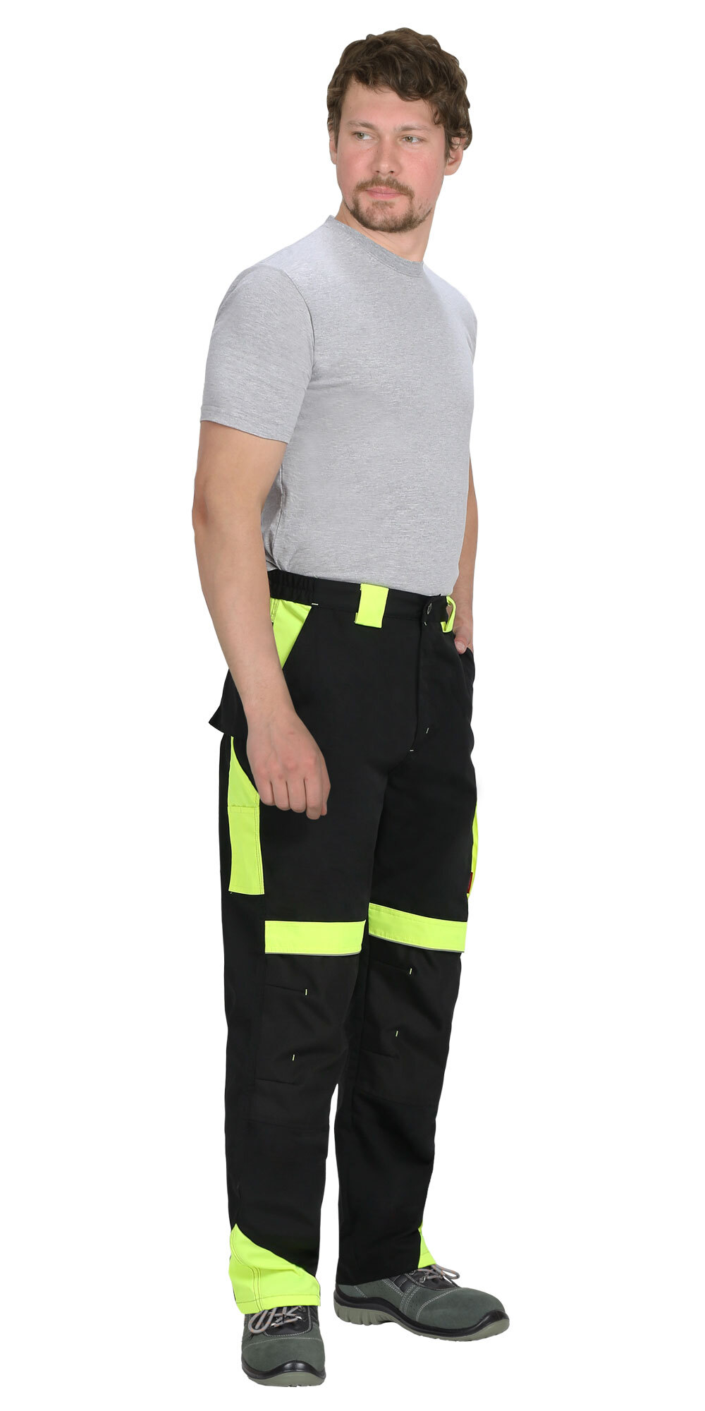 Брюки прямые с застёжкой спереди на гульфик с молнией, с отрезным поясом, с накладными карманами сзади и на левом боковом шве, с объёмными наколенниками из плотной, непромокаемой ткани с верхним входом для амортизационного вкладыша. В брюках предусмотрен светоотражающий кант. Материал верха основой: ткань смесовая с пропиткой ВО, пл. 255 г/м², состав 65%ПЭ, 35%ХБ, цвет: черный Материал отделки 1: ткань смесовая с пропиткой ВО, пл. 255 г/м², состав 65%ПЭ, 35%ХБ, цвет: лимонный Материал отделки 2: ткань полиэфирная, с пропиткой ВО, состав: 100% ПЭ, пл. 300 г/м², цвет: черный Материал подкладки карманов: состав 100%ПЭ, пл. 60 г/м², цвет: черный Светоотражающий материал: кант СВ ГОСТ 12.4.280-2014, ТР ТС 019/2011