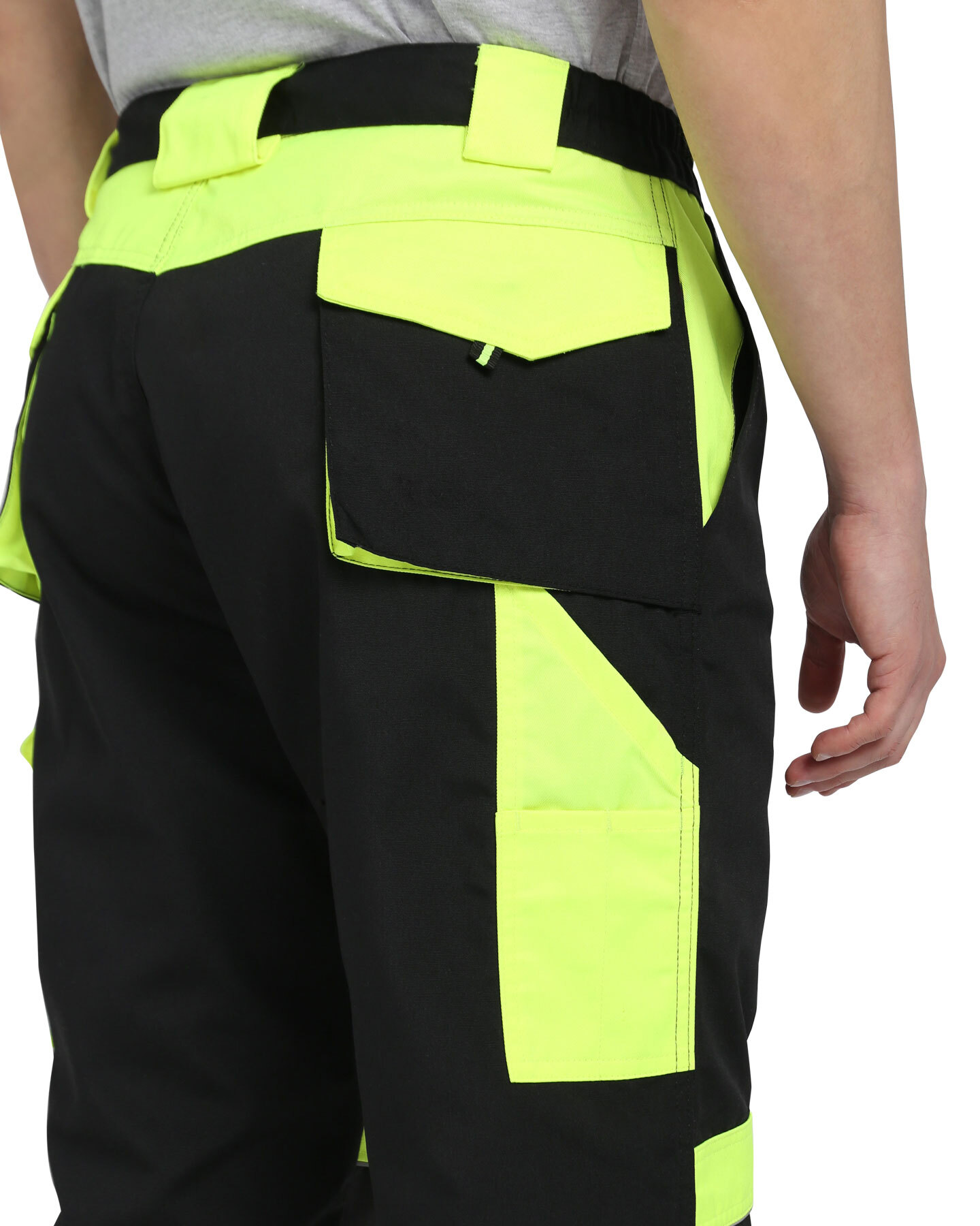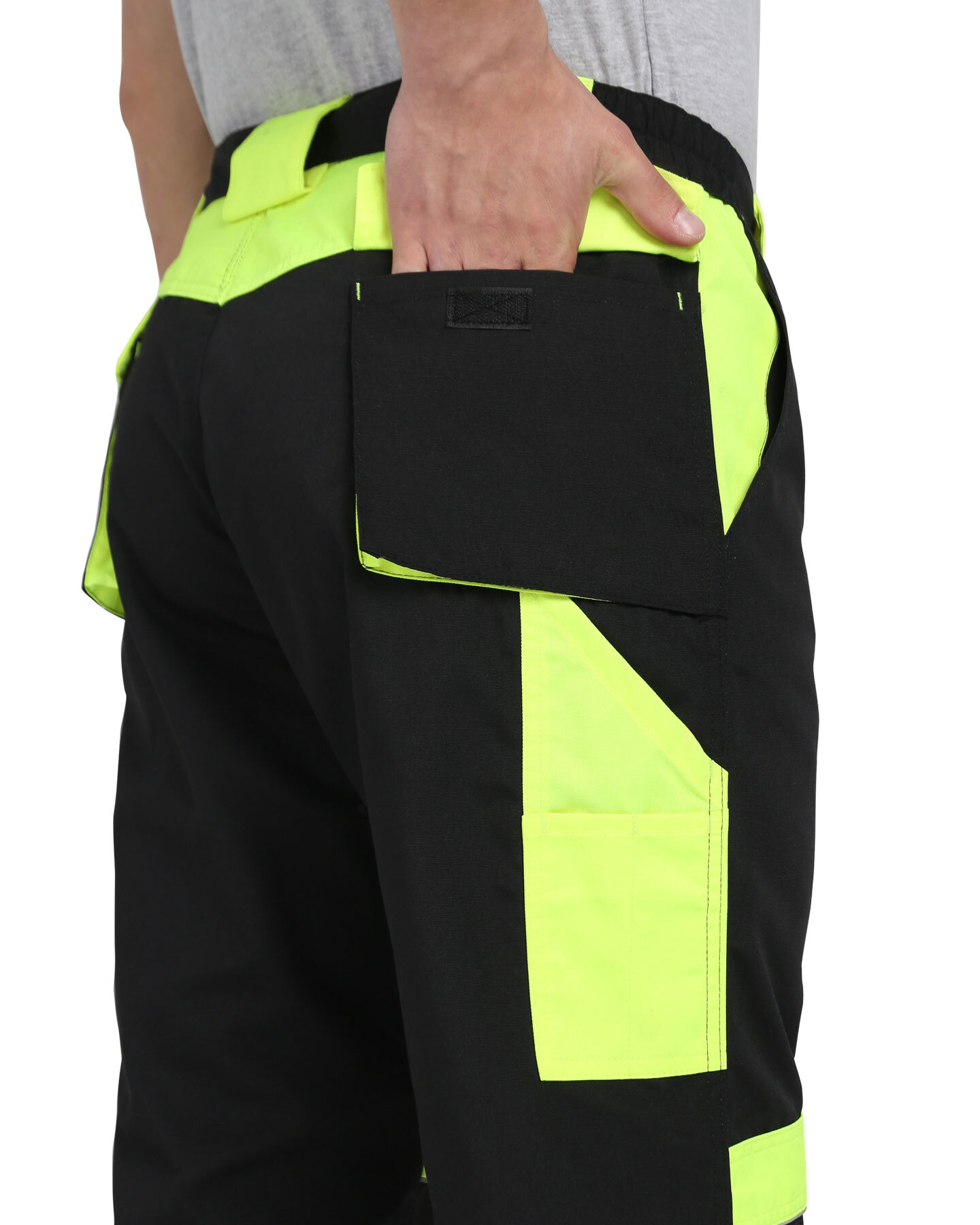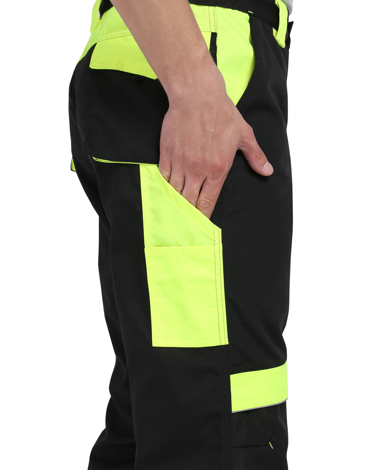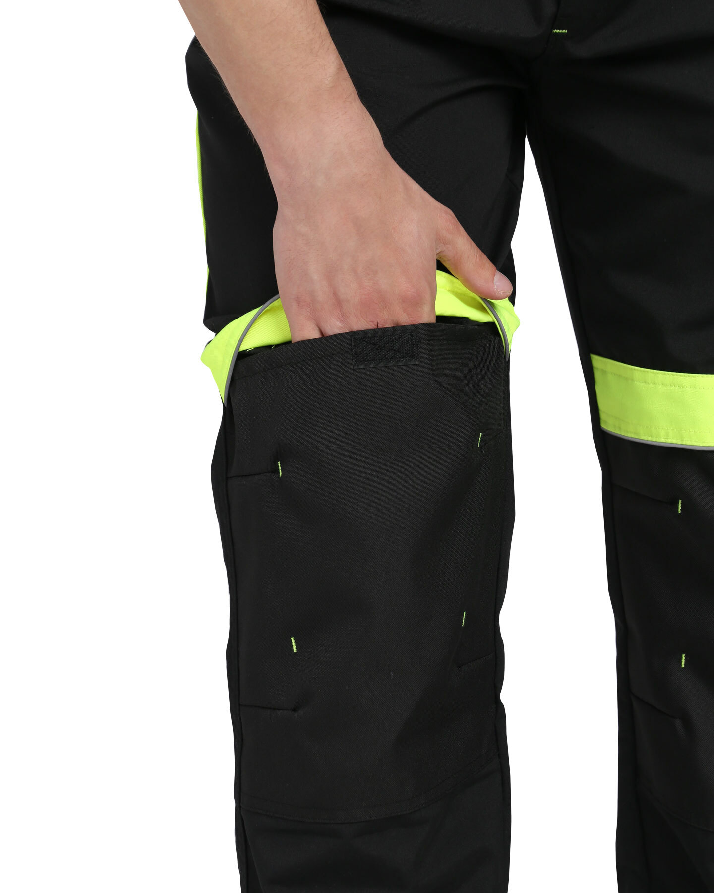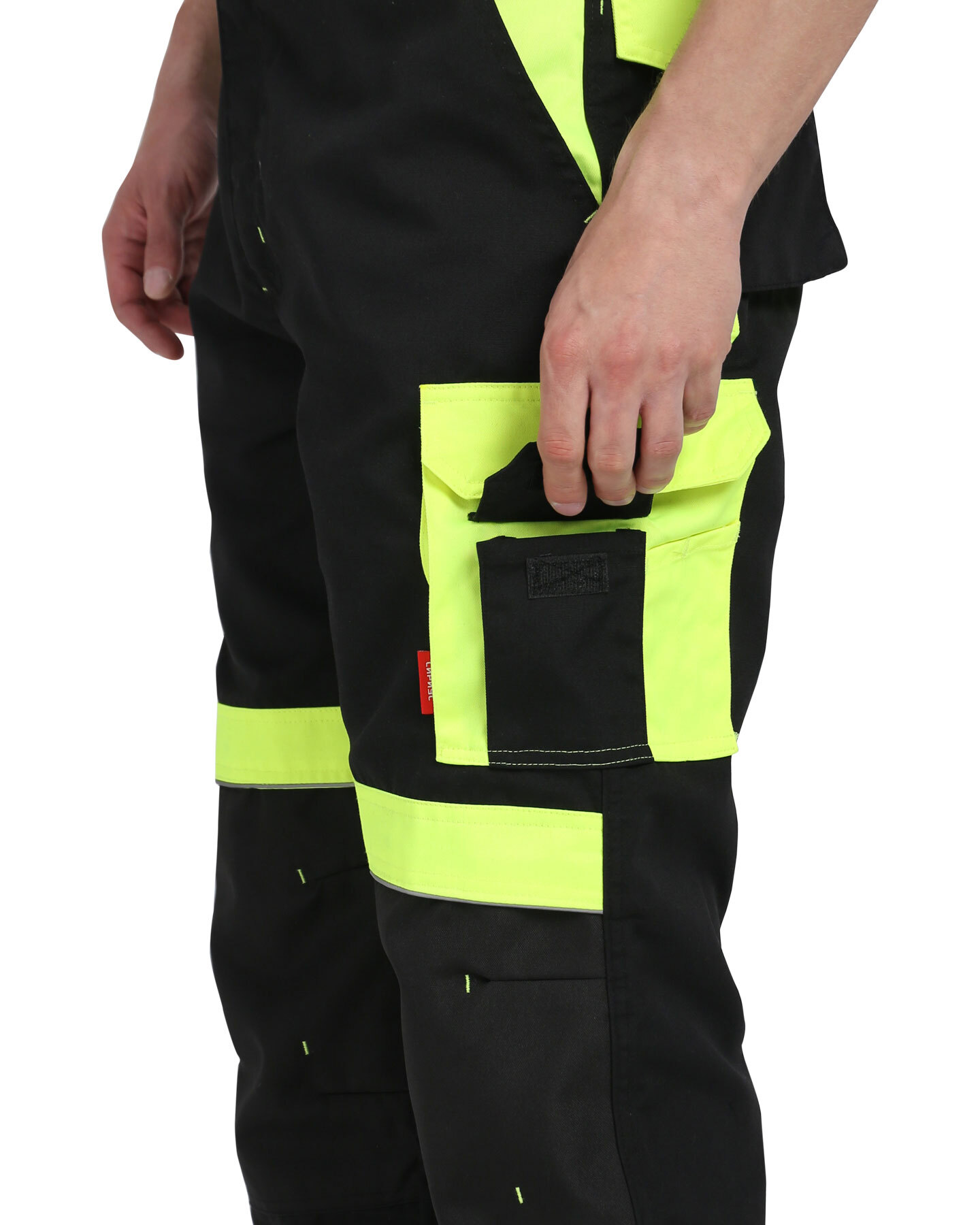 Брюки прямые с застёжкой спереди на гульфик с молнией, с отрезным поясом, с накладными карманами сзади и на левом боковом шве, с объёмными наколенниками из плотной, непромокаемой ткани с верхним входом для амортизационного вкладыша. В брюках предусмотрен светоотражающий кант. Материал верха основой: ткань смесовая с пропиткой ВО, пл. 255 г/м², состав 65%ПЭ, 35%ХБ, цвет: черный Материал отделки 1: ткань смесовая с пропиткой ВО, пл. 255 г/м², состав 65%ПЭ, 35%ХБ, цвет: лимонный Материал отделки 2: ткань полиэфирная, с пропиткой ВО, состав: 100% ПЭ, пл. 300 г/м², цвет: черный Материал подкладки карманов: состав 100%ПЭ, пл. 60 г/м², цвет: черный Светоотражающий материал: кант СВ ГОСТ 12.4.280-2014, ТР ТС 019/2011