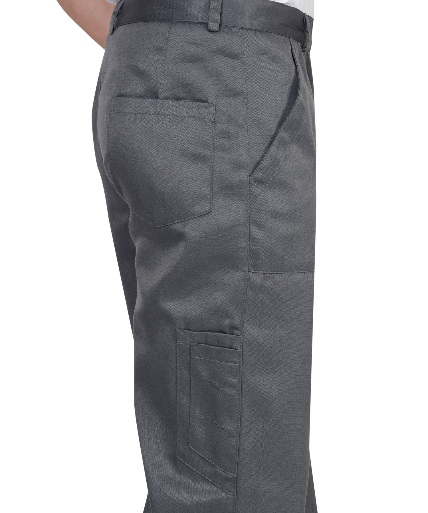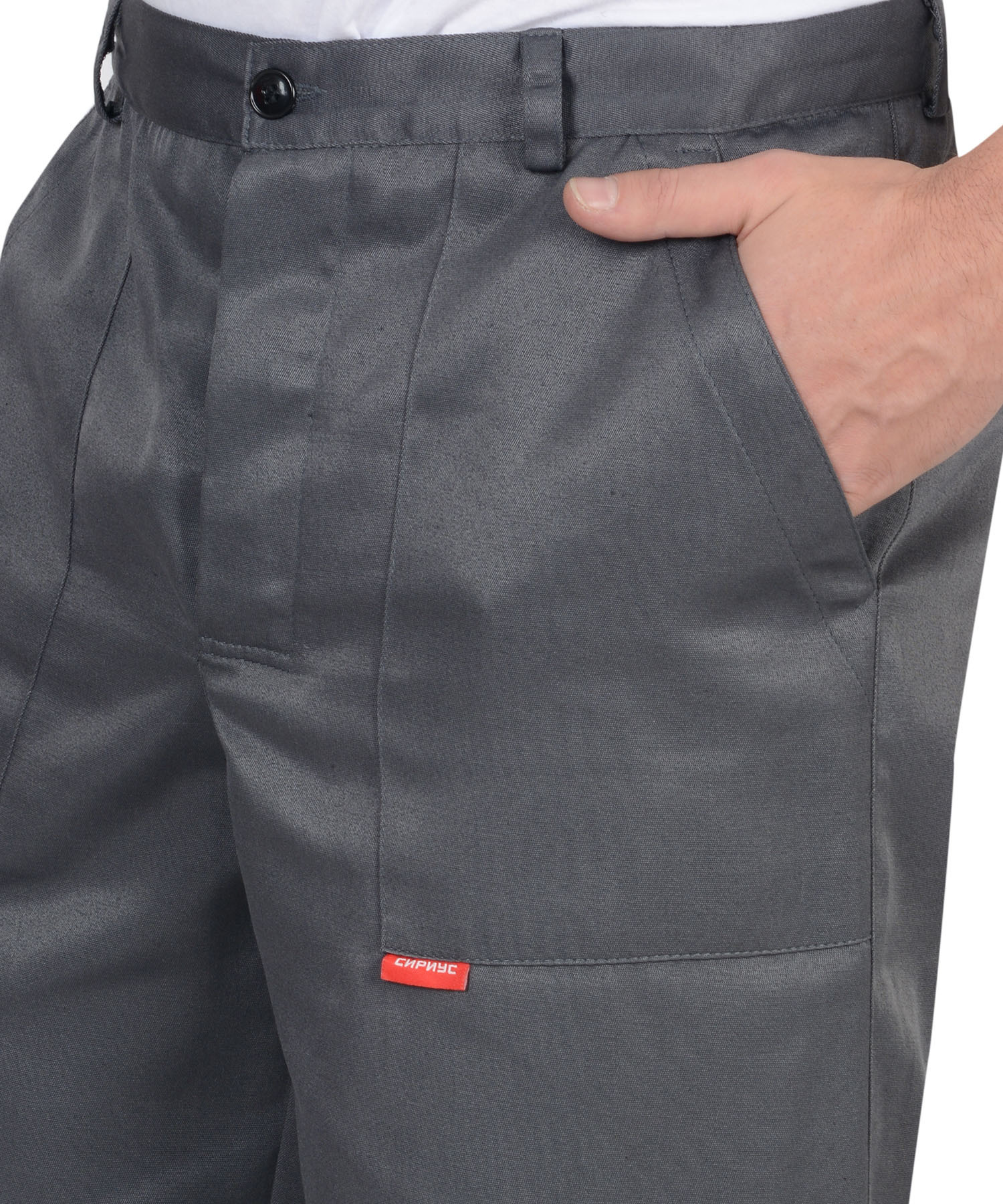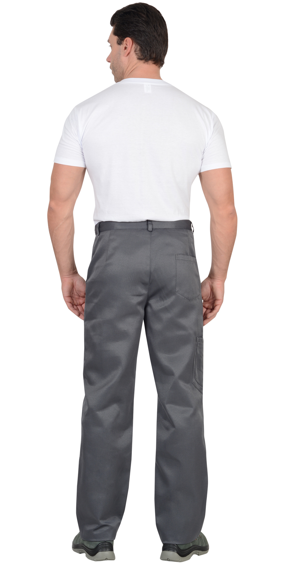 Брюки с заст.жкой спереди на 3 петли и 3пуговицы, с притачным поясом с 5 шлевками и заст.жкой на 1 петлю и пуговицу, с накладными боковыми карманами с наклонным входом, с накладным фигурным карманом и двумя (расположенными один на другом) накладными фигурными кармашками для инструментов на правой задней половинке. На маленьком кармашке 2 наклонные петли. ГОСТ 12.4.280-2014