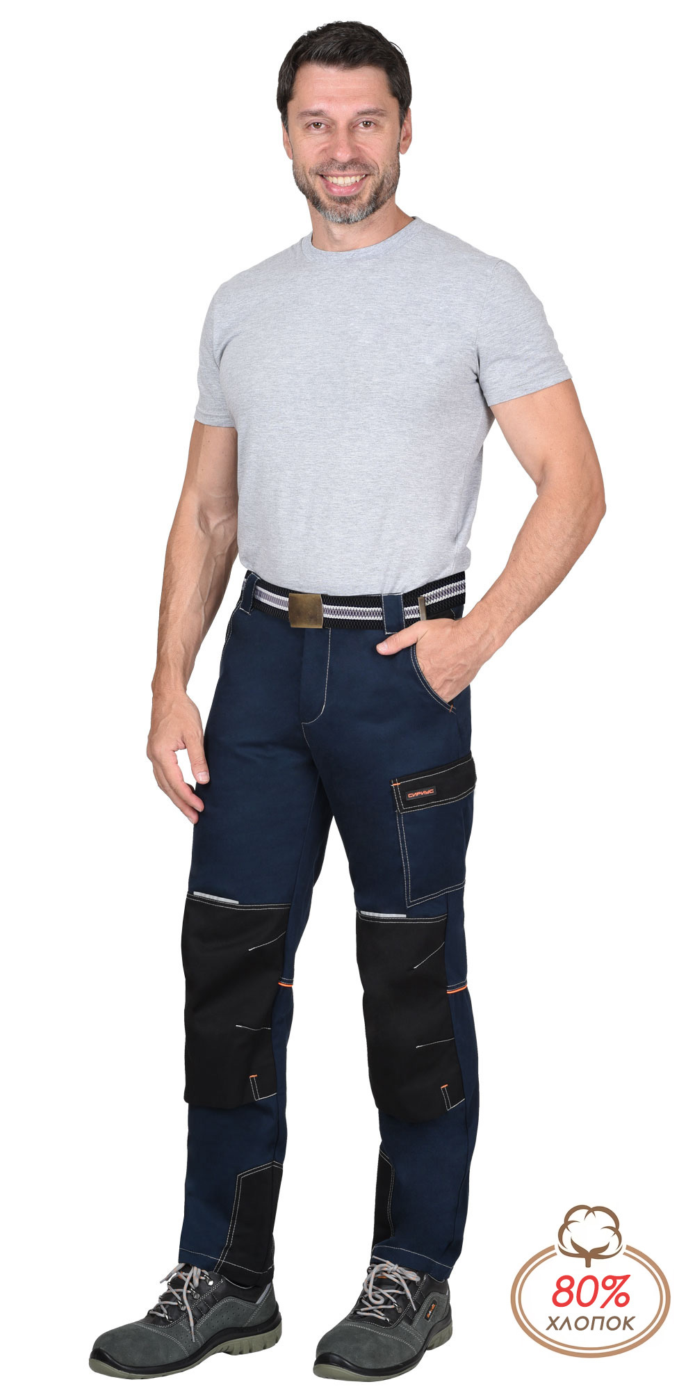 Брюки летние со съемным ремнем из смешанной ткани «Карелии-260» с водоотталкивающей пропиткой. Брюки с застежкой гульфика на молнию. Передние половинки с боковыми внутренними карманами и объемными наколенниками. На левом боковом шве накладной полуобъемный карман с фигурным клапаном на липучку. Задние половинки с кантом контрастного цвета, кокеткой и накладными фигурными карманами. По шаговым швам брюк усиленные фигурные накладки. Пояс брюк с широкими шлевками. Материал основой: ткань смесовая с пропиткой ВО, пл. 260 г/м², состав 80 ХБ %, 20% ПЭ, цвет: синий Материал отделки: ткань смесовая с пропиткой ВО, пл. 260 г/м², состав 80 ХБ %, 20% ПЭ, цвет: чёрный Светоотражающий материал: лента СОП