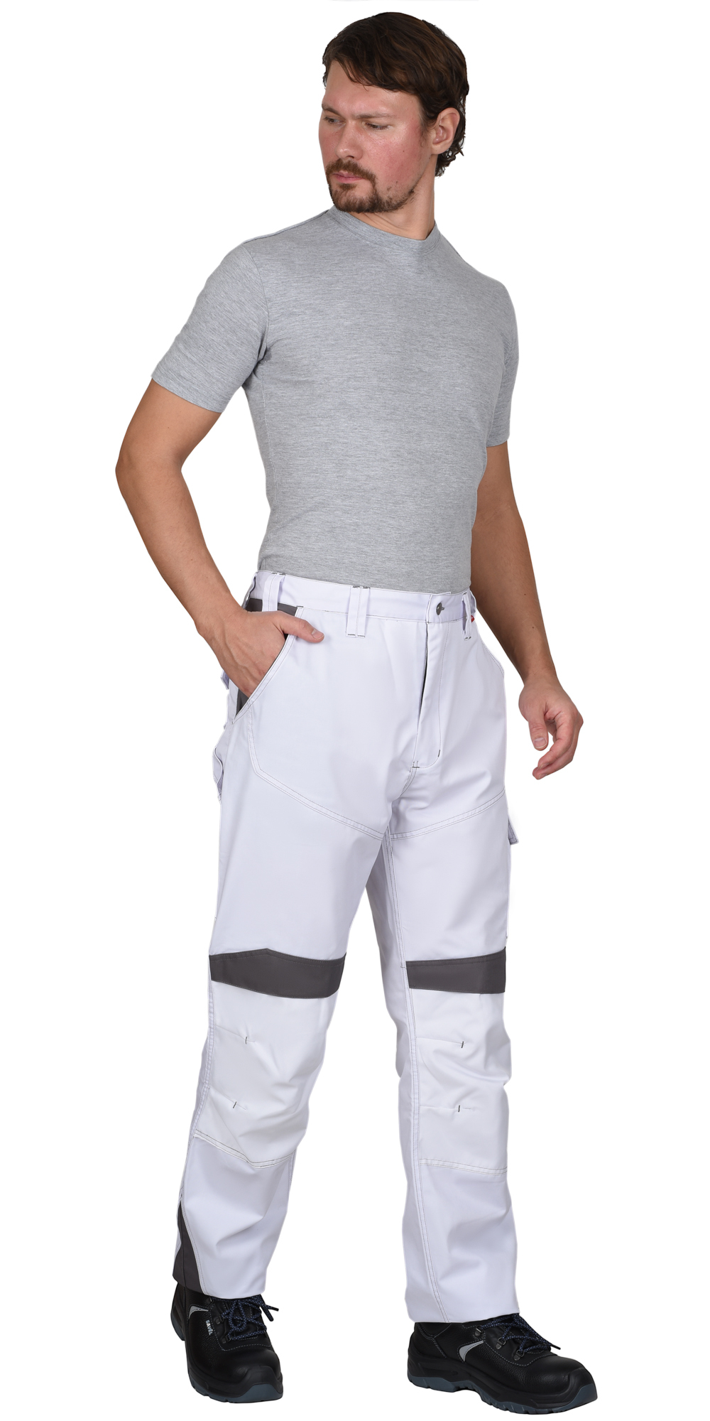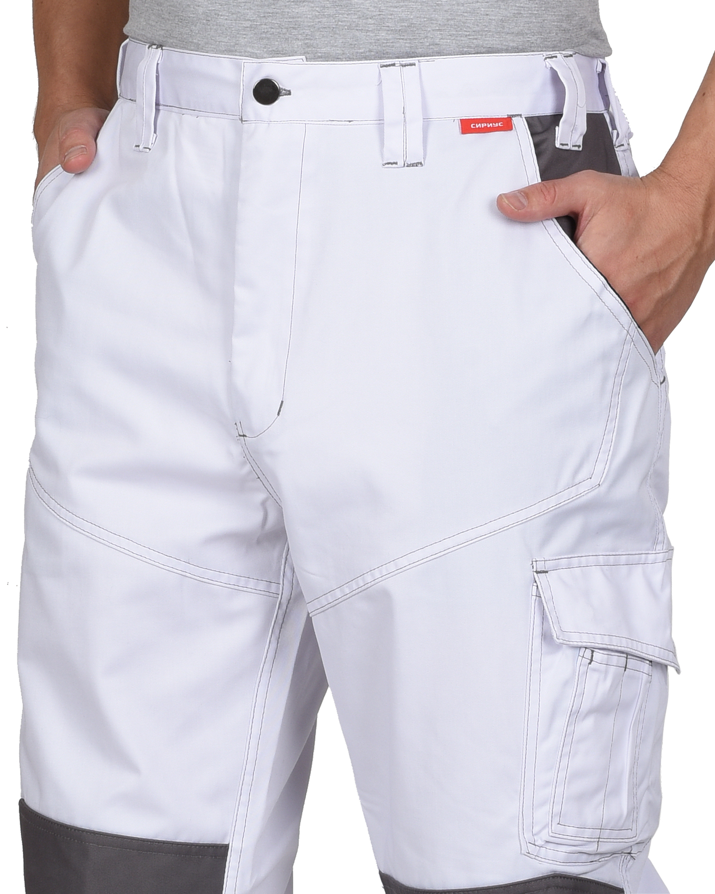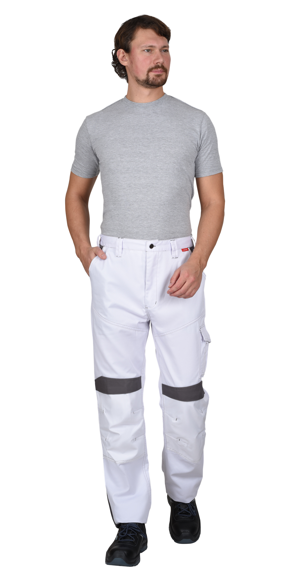 ГОСТ 12.4.280-2014, ТР ТС 019/2011 Брюки прямые с застёжкой спереди - гульфик с молнией, с отрезным поясом, с карманами спереди, сзади и на боковых швах, с объёмными наколенниками из плотной, полиэфирной, непромокаемой ткани с верхним входом для амортизационного вкладыша. Материал верха основой: ткань смесовая, с пропиткой ВО, пл. 240 г/м², состав 65%ПЭ, 35%ХБ, цвет: белый Материал отделки 1: ткань смесовая, с пропиткой ВО, пл. 240 г/м², состав 65%ПЭ, 35%ХБ, цвет: средне-серый Материал отделки 2: ткань полиэфирная, с пропиткой ВО, состав: 100% ПЭ, пл. 300 г/м², цвет: белый.