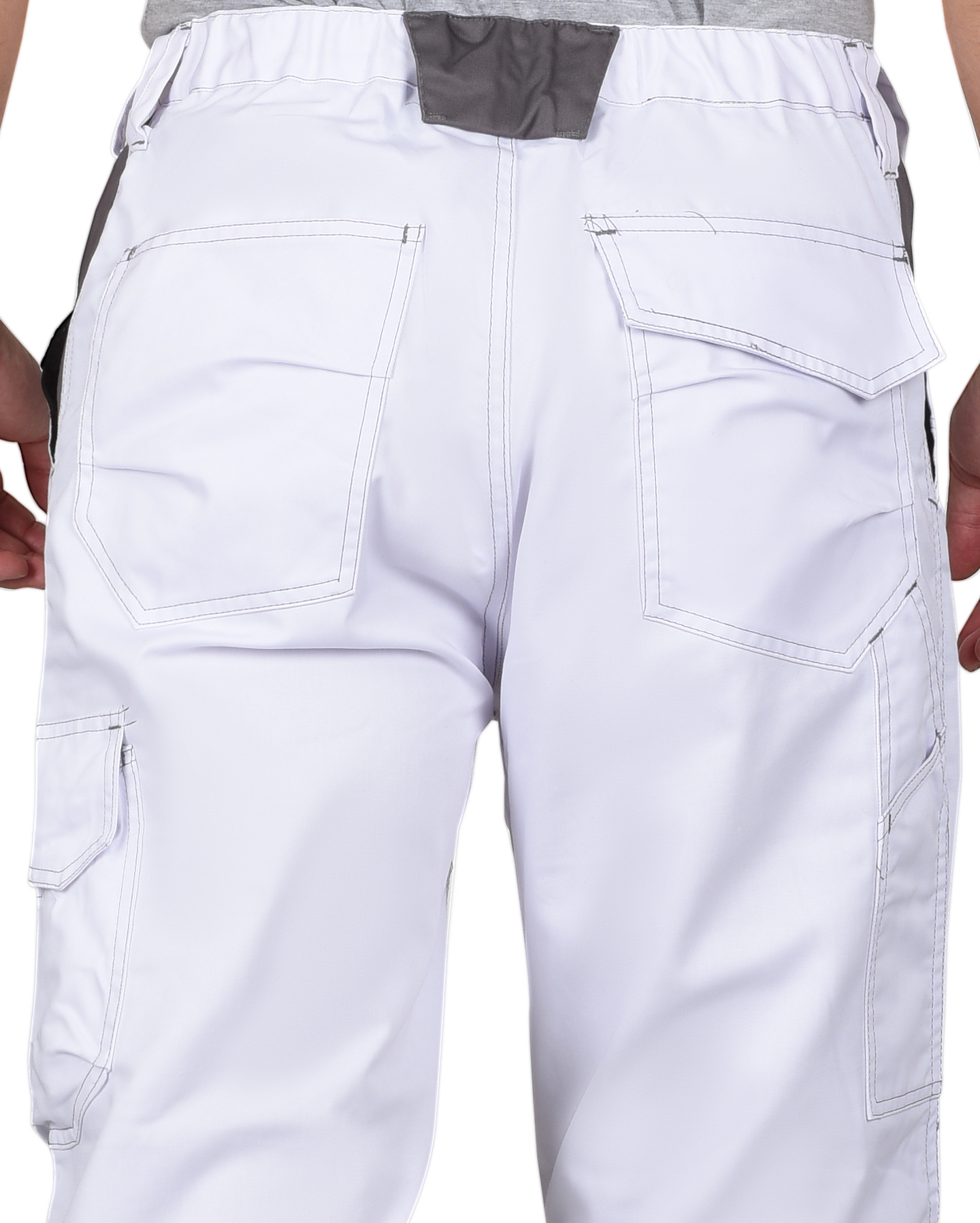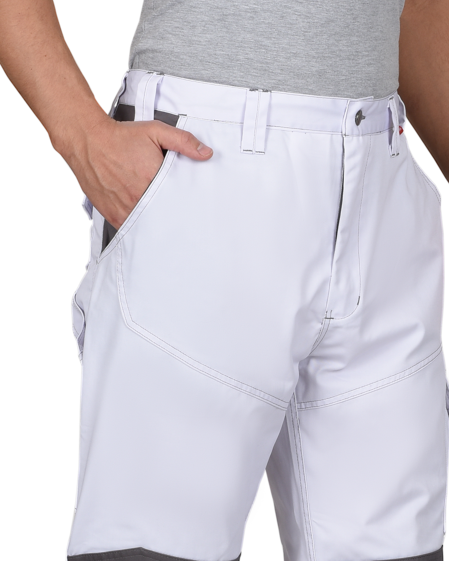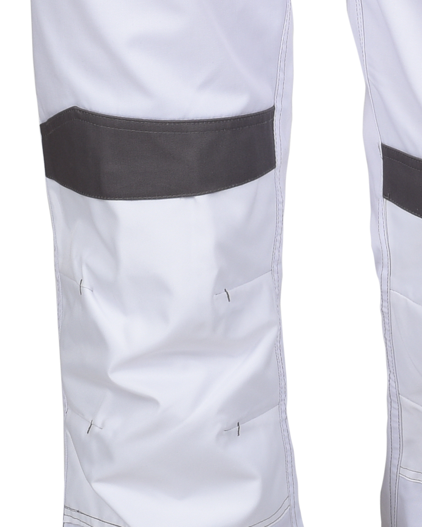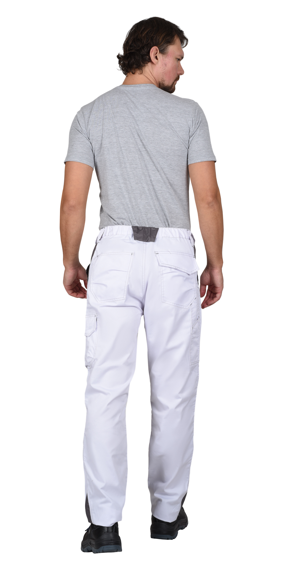 ГОСТ 12.4.280-2014, ТР ТС 019/2011 Брюки прямые с застёжкой спереди - гульфик с молнией, с отрезным поясом, с карманами спереди, сзади и на боковых швах, с объёмными наколенниками из плотной, полиэфирной, непромокаемой ткани с верхним входом для амортизационного вкладыша. Материал верха основой: ткань смесовая, с пропиткой ВО, пл. 240 г/м², состав 65%ПЭ, 35%ХБ, цвет: белый Материал отделки 1: ткань смесовая, с пропиткой ВО, пл. 240 г/м², состав 65%ПЭ, 35%ХБ, цвет: средне-серый Материал отделки 2: ткань полиэфирная, с пропиткой ВО, состав: 100% ПЭ, пл. 300 г/м², цвет: белый.