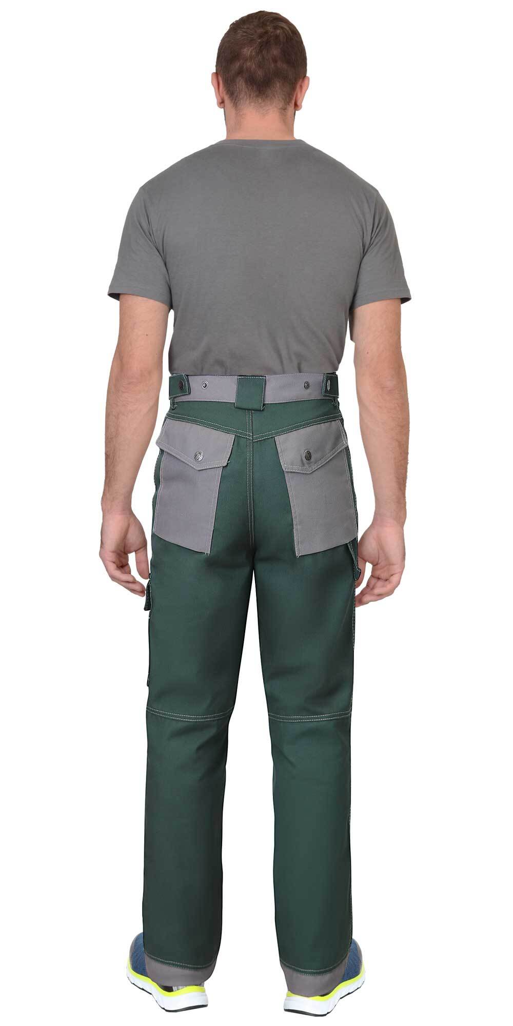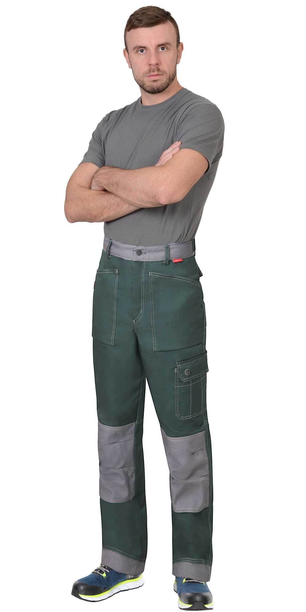 ГОСТ 12.4.280-2014, ТР ТС 019/2011 Брюки прямые, на поясе, с застёжкой спереди - гульфик с молнией, с накладными карманами спереди, сзади и на левом боковом шве, с объёмными наколенниками с нижним входом для амортизационного вкладыша. Объём брюк по талии регулируется при помощи хлястиков с кнопками на поясе. Материал верха основой: ткань смесовая, пл. 280 г/м², состав 65%ПЭ, 35%ХБ, цвет: темно-зеленый Материал отделки: ткань смесовая, пл. 280 г/м², состав 65%ПЭ, 35%ХБ, цвет: средне-серый