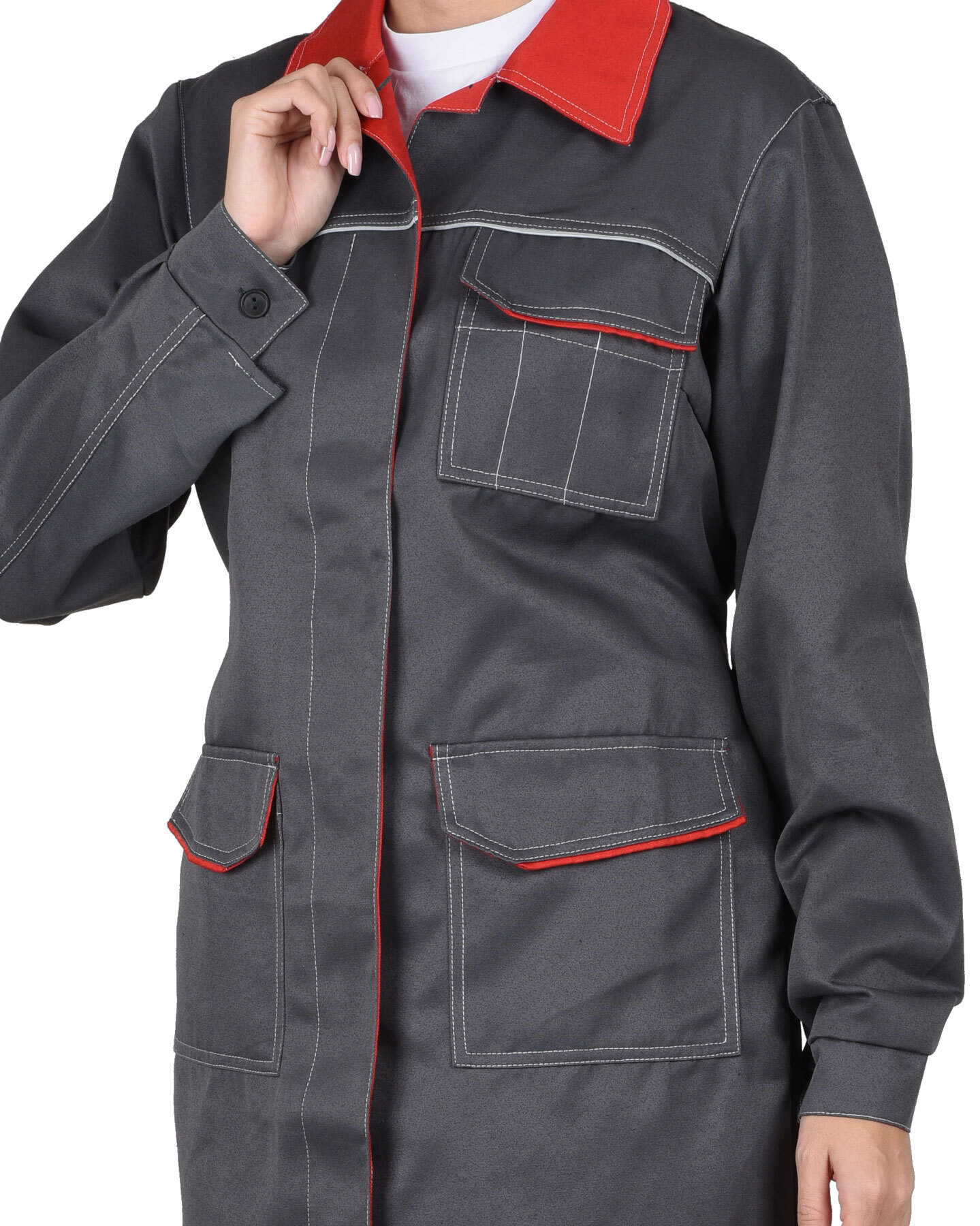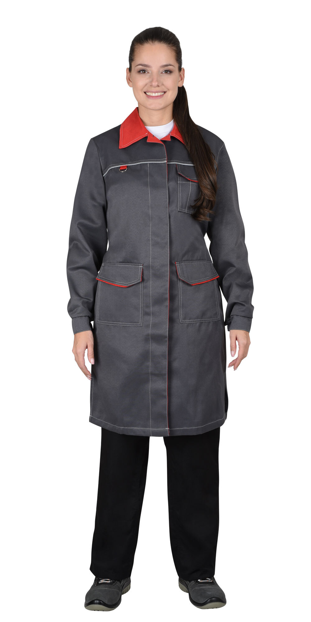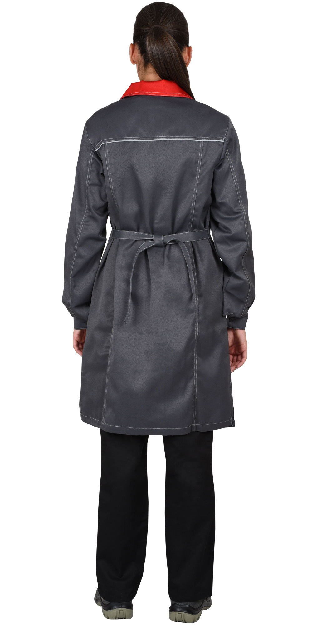 Халат с центральной потайной застёжкой на 5шт. обметанных петель и 5шт. пуговиц; с воротником пиджачного типа; с левым нагрудным накладным карманом с фигурным клапаном; нижними накладными карманами с фигурными клапанами, в боковых швах с поясами завязывающимися в свободный узел и разрезами понизу. Рукава втачные двухшовные с притачными манжетами. В халате предусмотрен кант СВМ д.3мм светоотражающий 100К для обеспечения сигнальной видимости в условиях пониженной видимости.