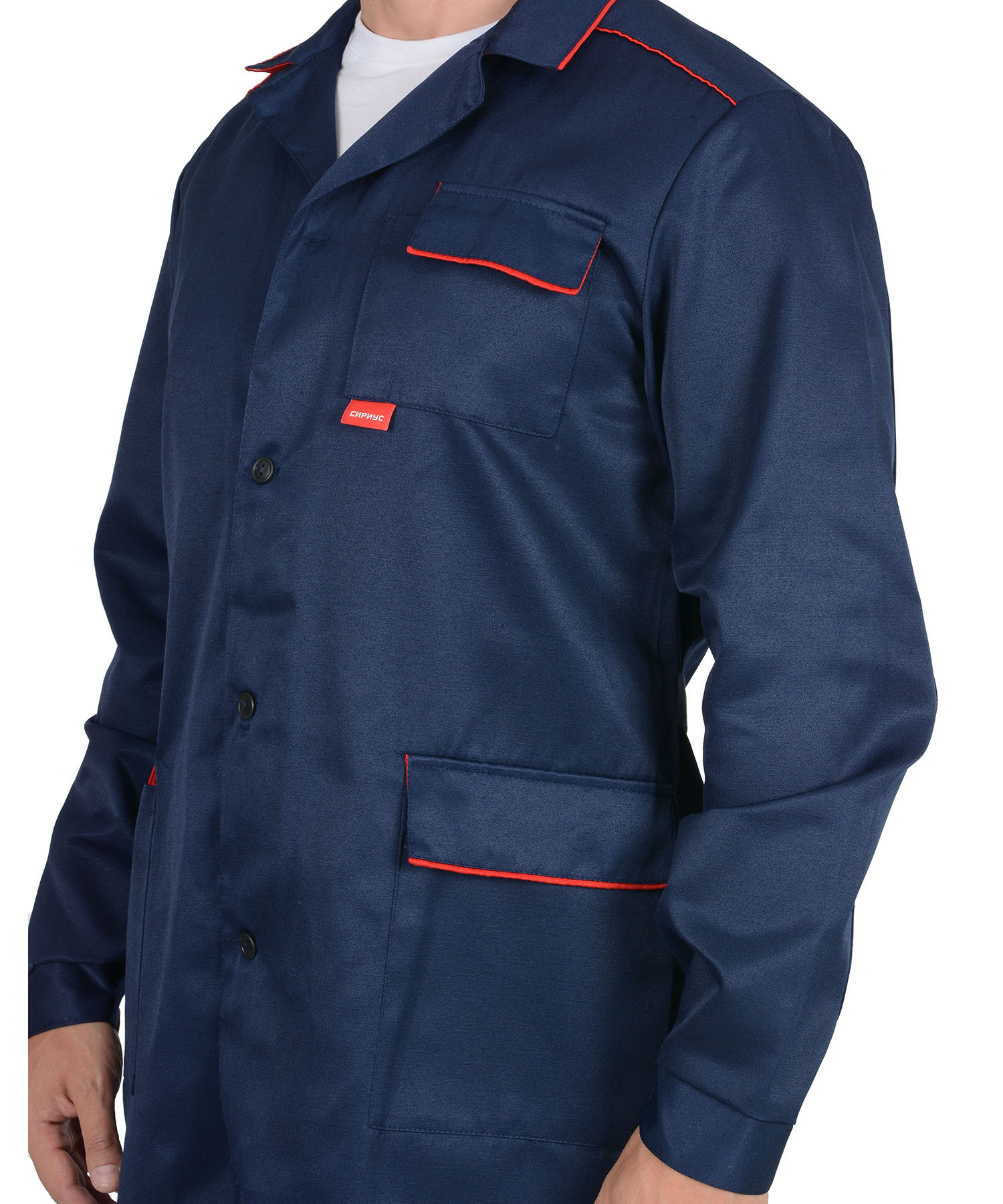 Застёжка на пуговицы, карманы с клапанами. Рукава с манжетами. Красный кант. ГОСТ 12.4.132-83.
