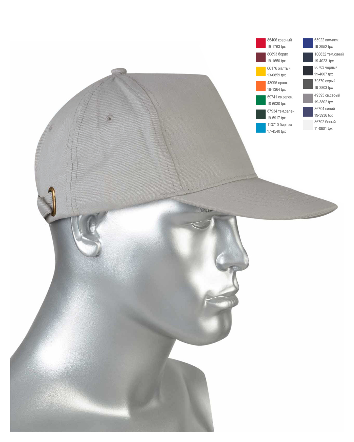 Кепи-бейсболка выполнена из текстильной ткани диагонального переплетения плотностью 200-210 гр/м2, 100% хлопок. Кепи-бейсболка состоит из 5-ти клиньев. Застежка металлическая расположена на правом заднем клине, там же и металлический люверс, для захода хлястика. Купол кепи - бейсболки отделан пуговицей, обтянутой основной тканью.