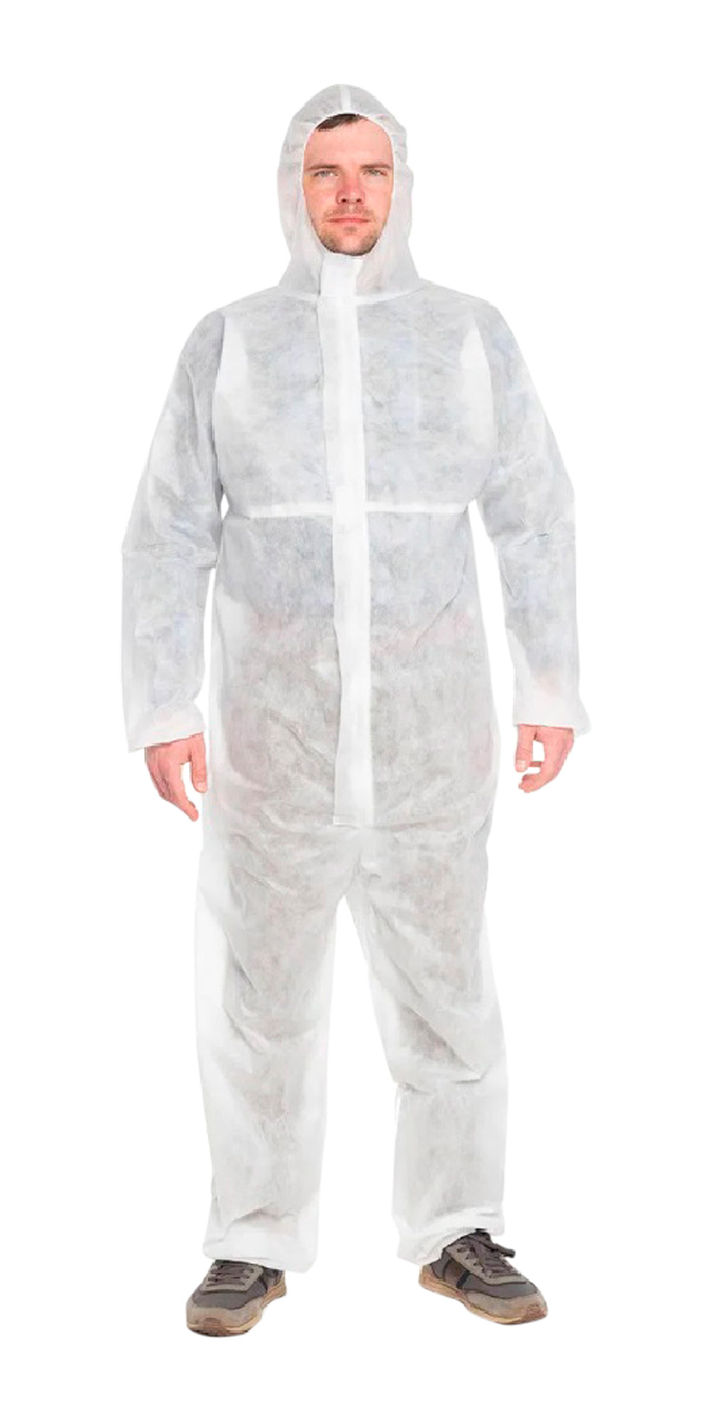 Одноразовый комбинезон белого цвета изготовлен из гипоаллергенного нетканого материала спанбонд плотностью 60гр/м.кв. Защита от твердых переносимых по воздуху веществ, тип защиты 5 (EN 13982). Обеспечивает хорошую воздухопроницаемость. Центральная застёжка на молнию с защитной планкой. Рукава, низ комбинезона и капюшон на резинках, для лучшей защиты от загрязнений. Имеет дополнительную прострочку и обработку швов, а так же эластичную резинку на поясе.