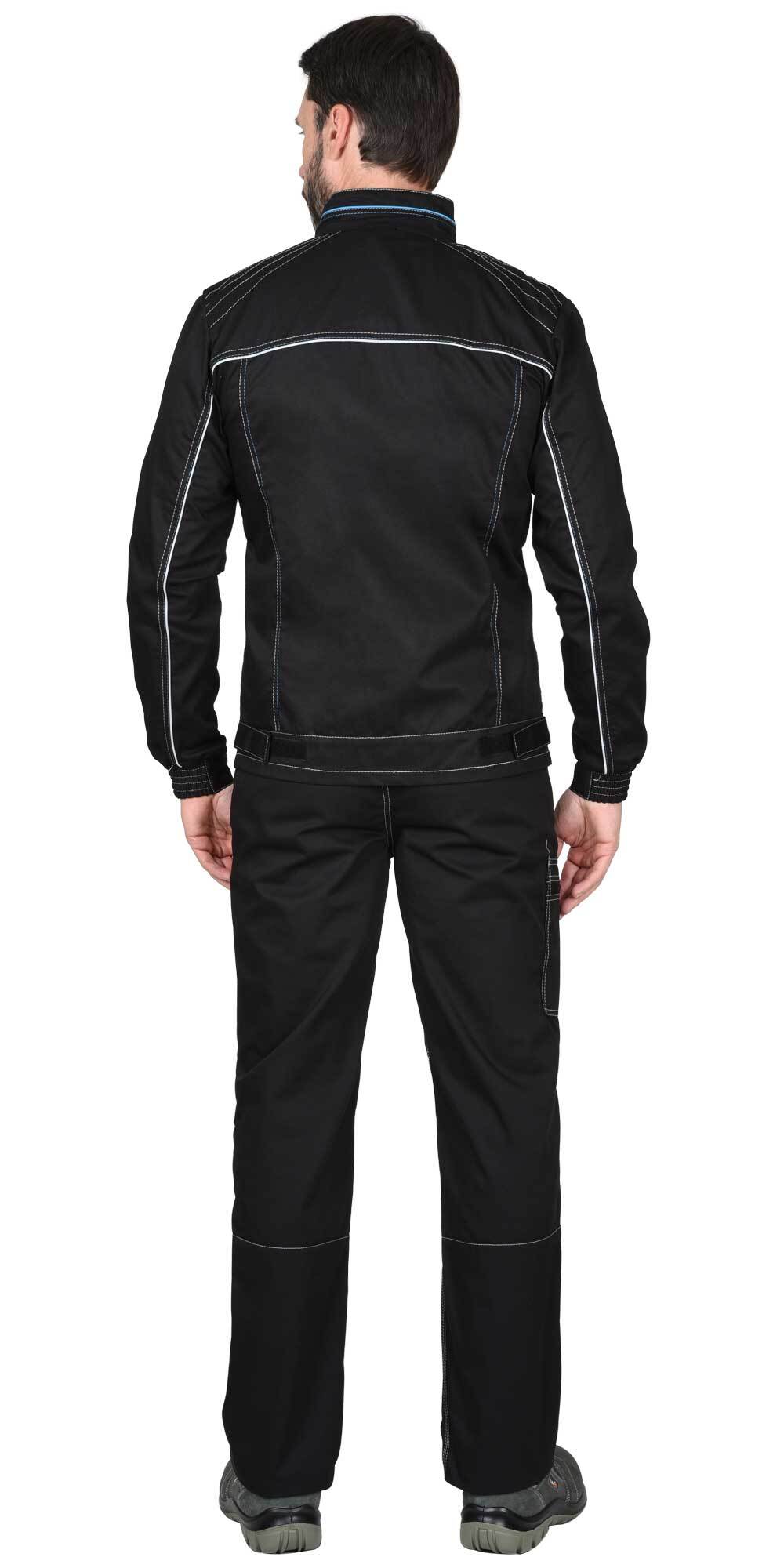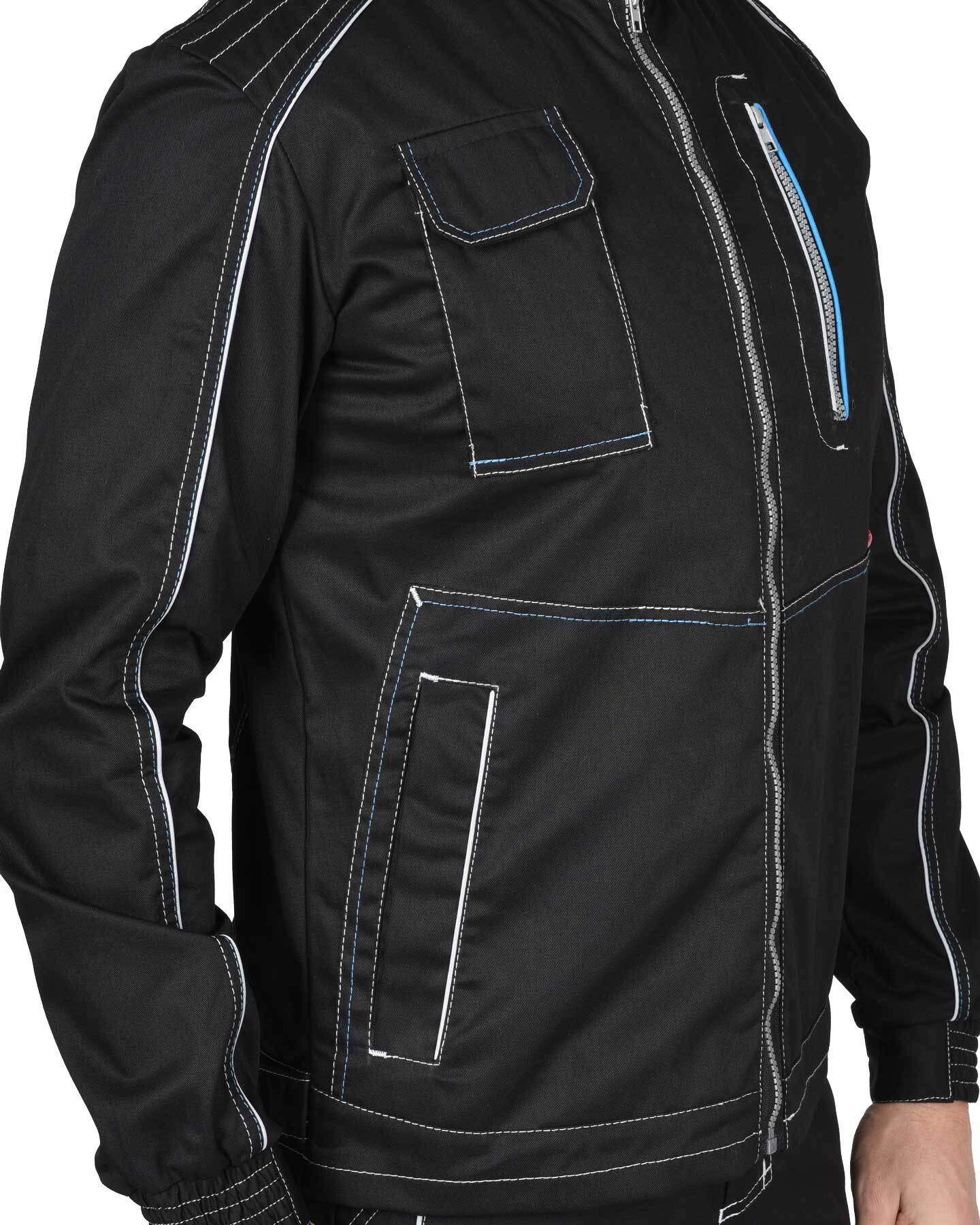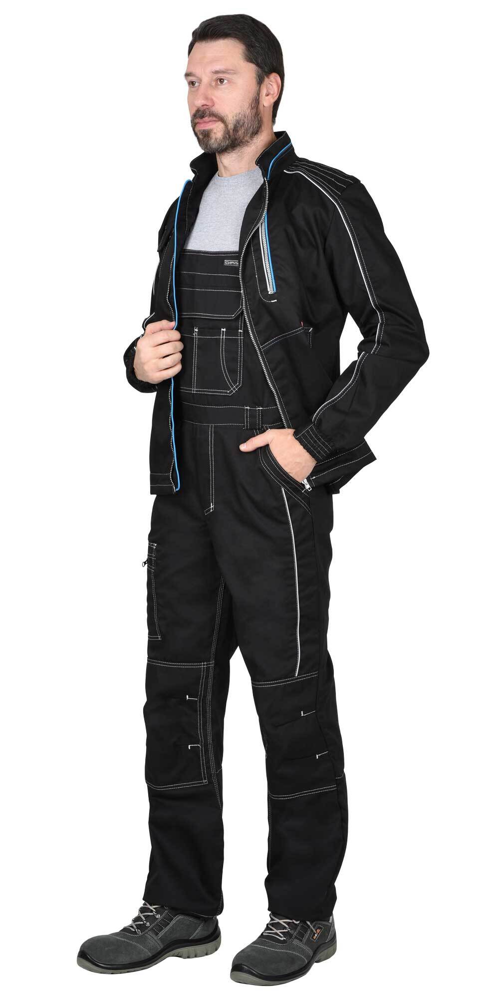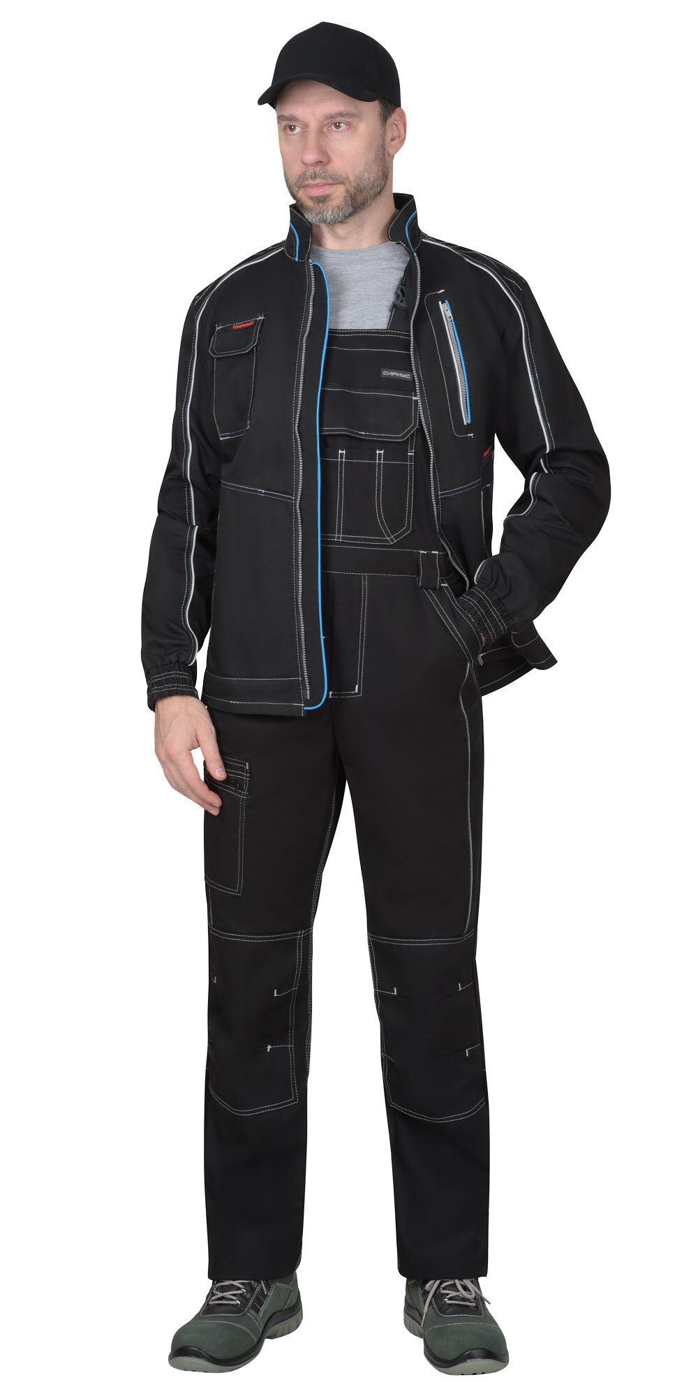 Костюм состоит из арт.119024 и арт.100181 арт.119024 Куртка "СИРИУС-АЛЕКС" летняя мужская черная с голубой отделкой Куртка короткая, воротник стойка; с центральной застёжкой на тракторную тесьму «молнию»; с внутренней подпланкой; с верхним прорезным карманом на тесьму «молнию» на левой полочке, и с верхним накладным полуобъёмным карманом с фигурным клапаном застегивающийся на потайную липучку на правой полочке; с нижними прорезными карманами «листочки», притачной обтачкой низа куртки и манжетами, манжеты частично стянуты резинкой. В куртку предусмотрен СВ кант для обозначения сигнальной видимости. ГОСТ 12.4.280-2014 арт.100181 Полукомбинезон "СИРИУС-ПРЕСТИЖ" Полукомбинезон прямого силуэта, застежкой гульфика на молния, с различными многофункциональными карманами, с застежкой в правом боковом шве на пуговицы, с наколенниками, с бретелями регулируемыми эластичной тесьмой и фастексами, с эластичной тесьмой по линии талии, на передних половинках в рельеф вшивается СВ кант.