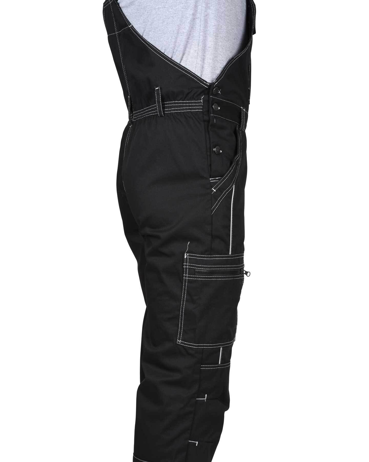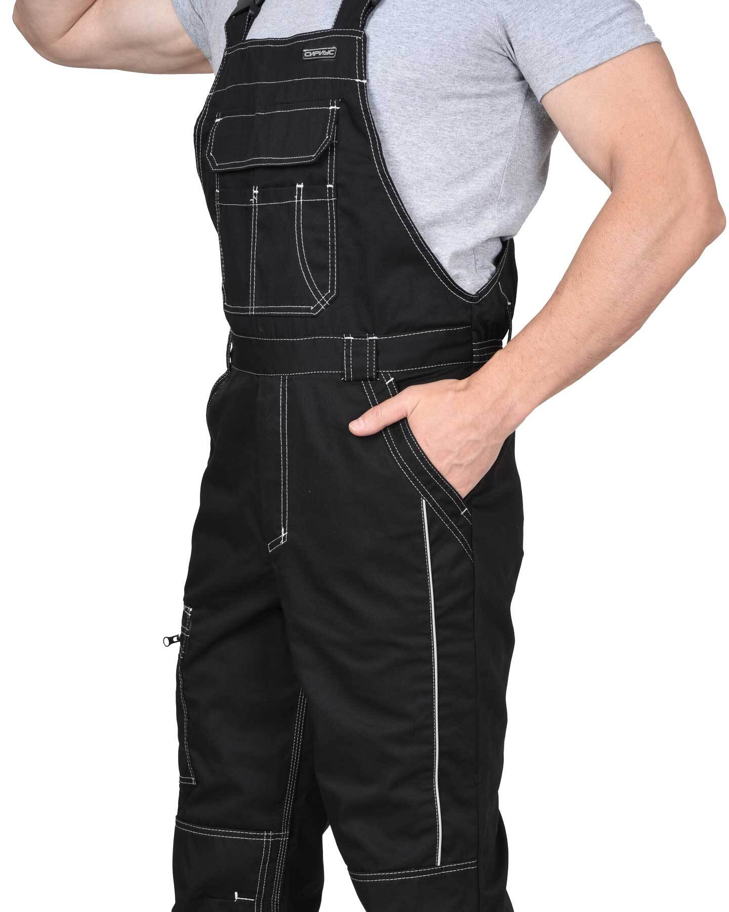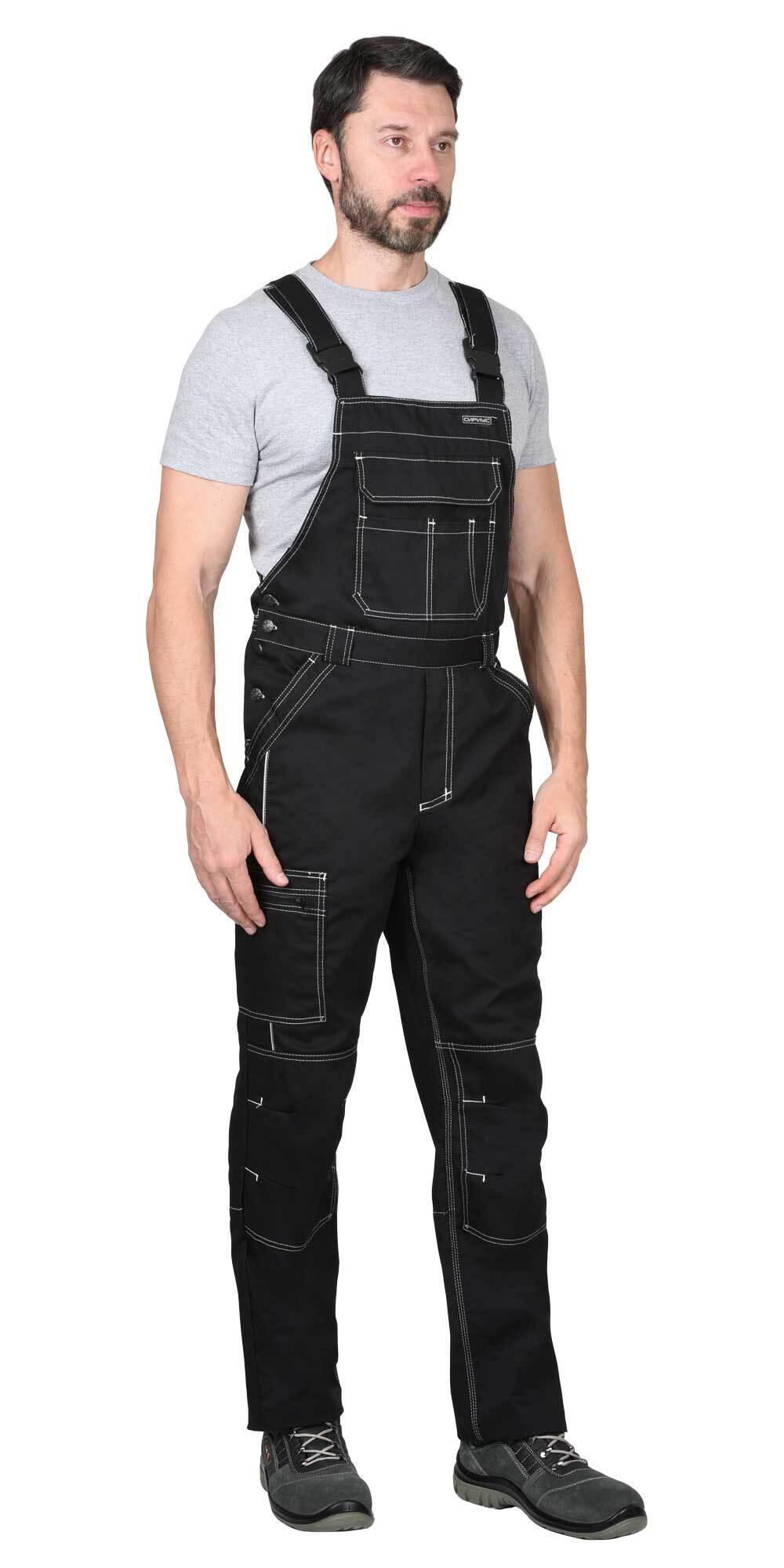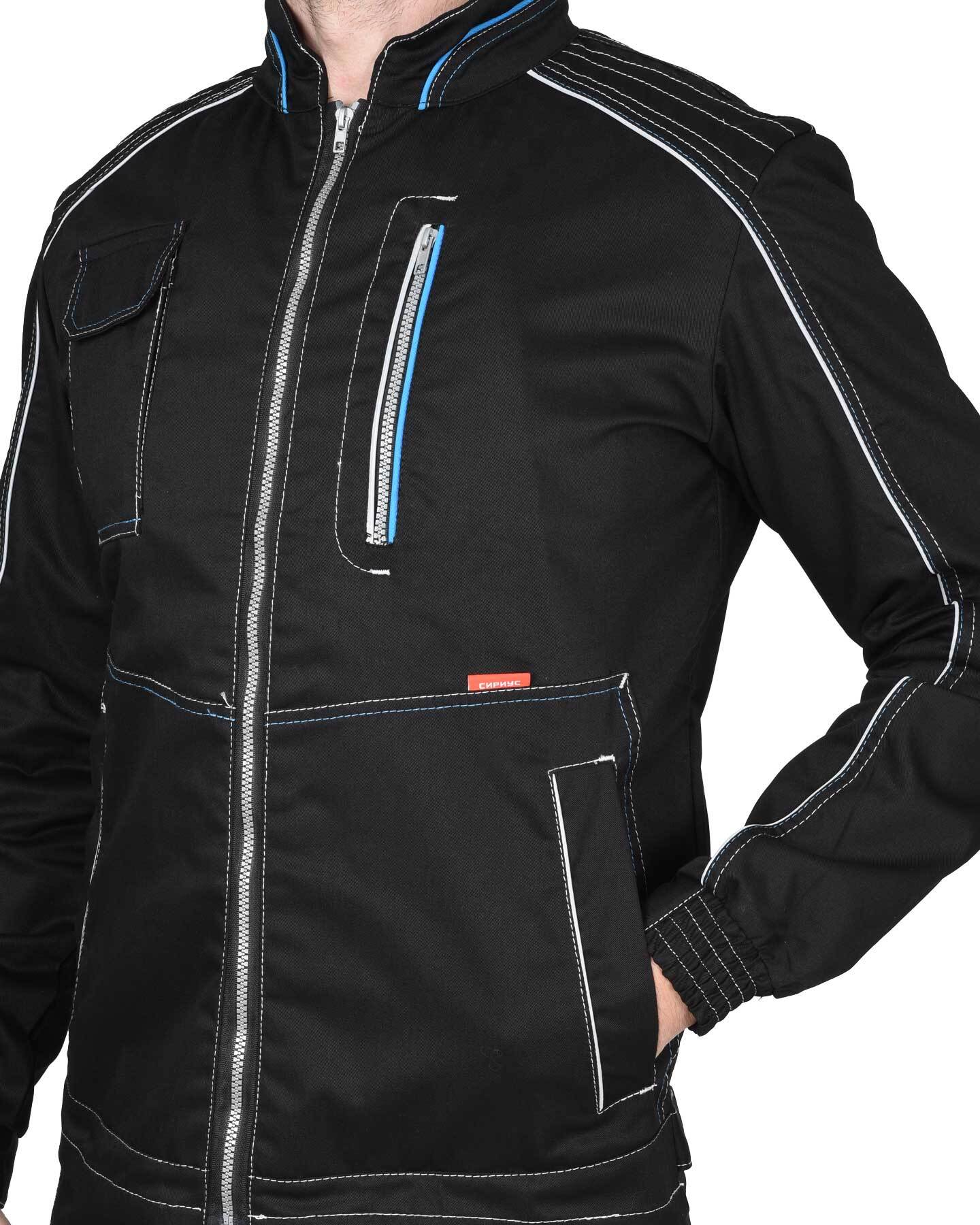 Костюм состоит из арт.119024 и арт.100181 арт.119024 Куртка "СИРИУС-АЛЕКС" летняя мужская черная с голубой отделкой Куртка короткая, воротник стойка; с центральной застёжкой на тракторную тесьму «молнию»; с внутренней подпланкой; с верхним прорезным карманом на тесьму «молнию» на левой полочке, и с верхним накладным полуобъёмным карманом с фигурным клапаном застегивающийся на потайную липучку на правой полочке; с нижними прорезными карманами «листочки», притачной обтачкой низа куртки и манжетами, манжеты частично стянуты резинкой. В куртку предусмотрен СВ кант для обозначения сигнальной видимости. ГОСТ 12.4.280-2014 арт.100181 Полукомбинезон "СИРИУС-ПРЕСТИЖ" Полукомбинезон прямого силуэта, застежкой гульфика на молния, с различными многофункциональными карманами, с застежкой в правом боковом шве на пуговицы, с наколенниками, с бретелями регулируемыми эластичной тесьмой и фастексами, с эластичной тесьмой по линии талии, на передних половинках в рельеф вшивается СВ кант.