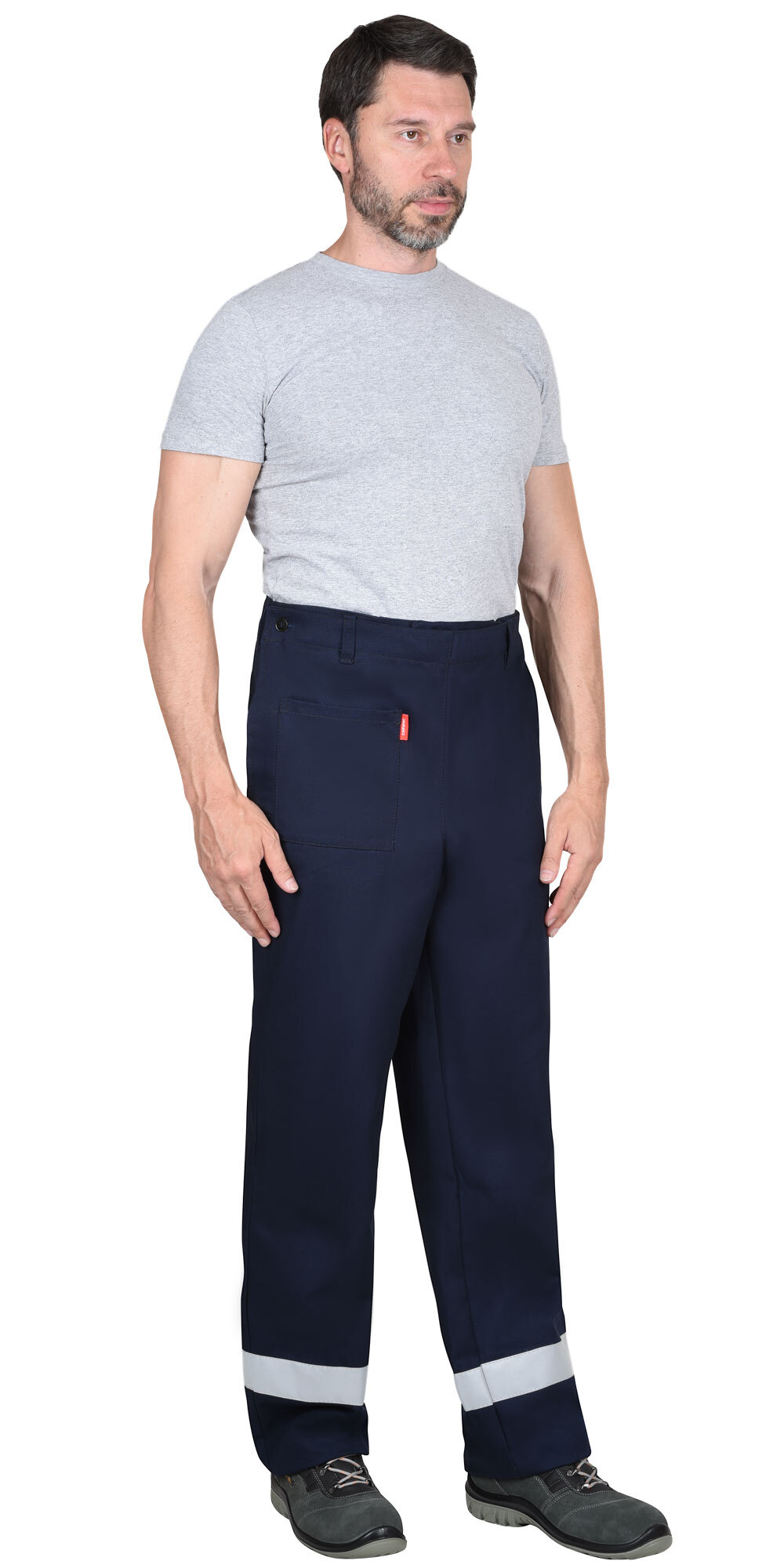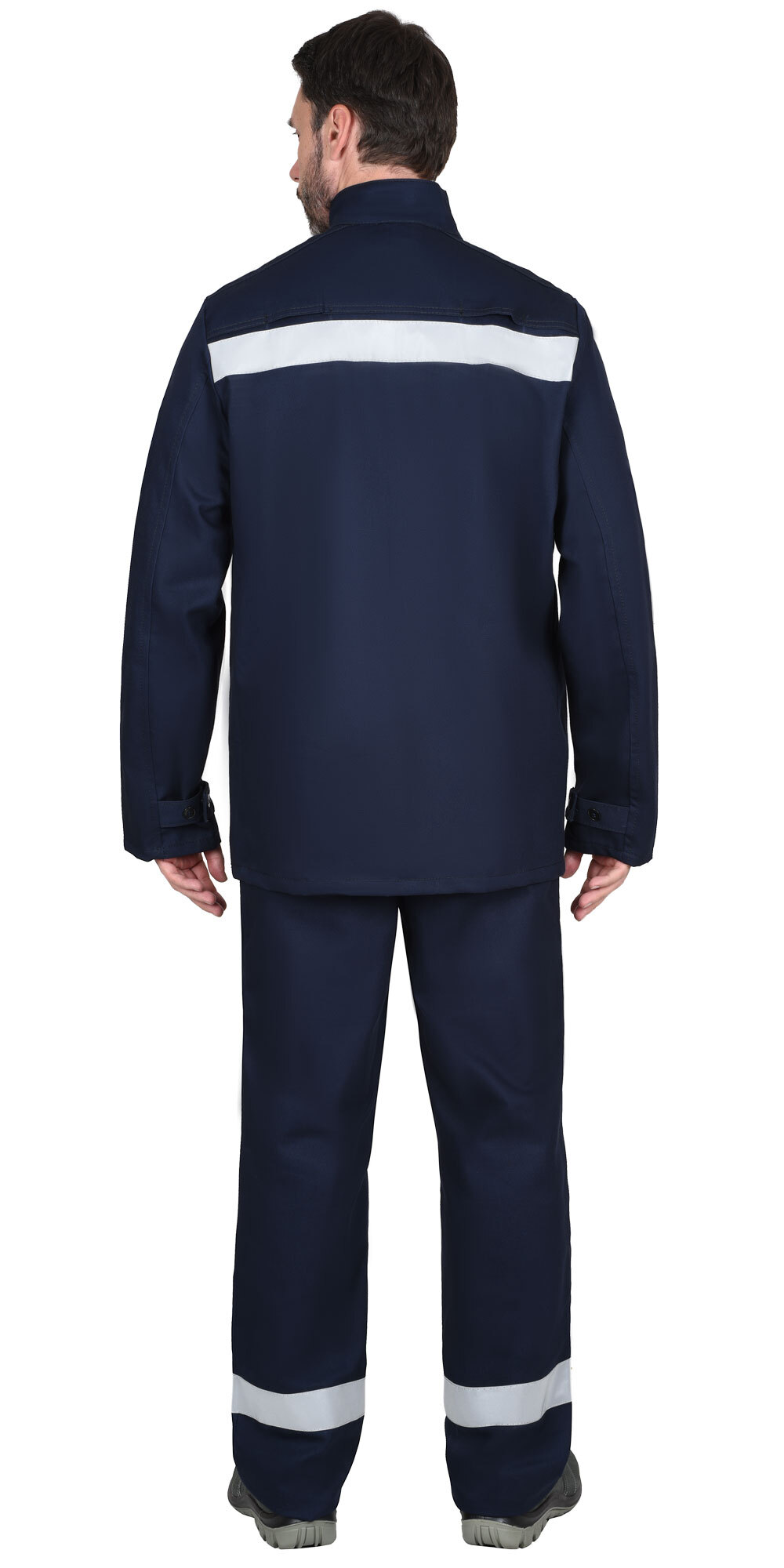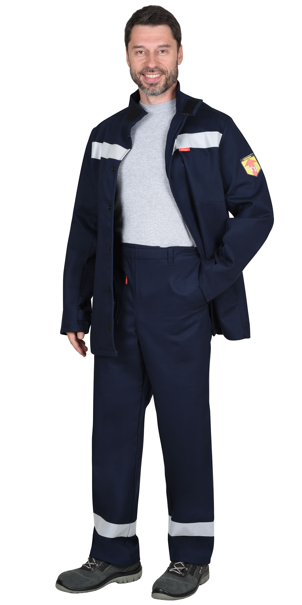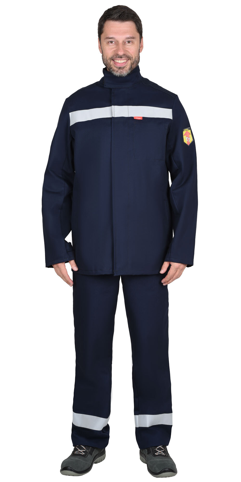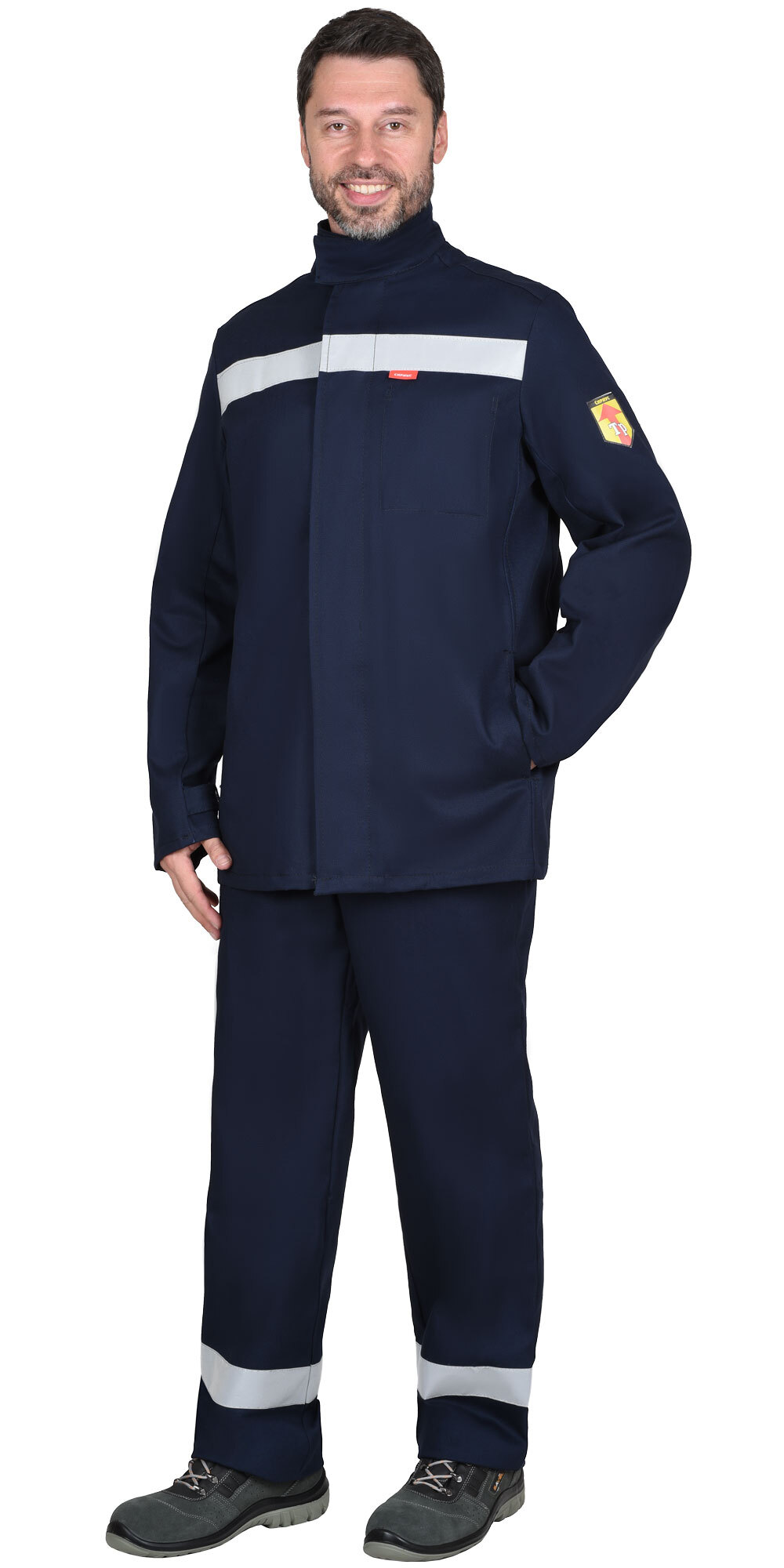ТР ТС 019/2011, ГОСТ 12.4.250-2019. Костюм летний из огнестойкой ткани, состоит из куртки, удлинённой и брюк. В костюме предусмотрена светоотражающая лента шириной 50мм для обозначения сигнальной видимости. Куртка, удлиненная с потайной застёжкой на огнестойкие пуговицы, с внутренними карманами в швах. Воротник-стойка с застежкой на «липучку». На левой полочке с изнаночной стороны внутренний накладной карман с именной лентой. На куртке под проймой вентиляционные отверстия для воздухообмена. Ширина рукавов понизу регулируется хлястиками с пуговицами. Брюки с застежкой в боковых швах на огнестойкие пуговицы. Передние половинки с внутренними карманами в боковых швах и накладным карманом на правой передней половинке. Материал верха: «FIRE RESISTANT» (FR 330) с огнеупорной пропиткой (ОП), пл.330 г/м.кв. состав 100% х/б, цвет: темно-синий. Материал подкладки карманов: «Бязь», состав 100% х/б. Светоотражающий материал: лента светоотражающая 50 мм. Костюм 1-ого класса защиты, предназначен для выполнения работ, при которых расстояние от работящего до источника искр и брызг расплавленного металла более 2-х метров.