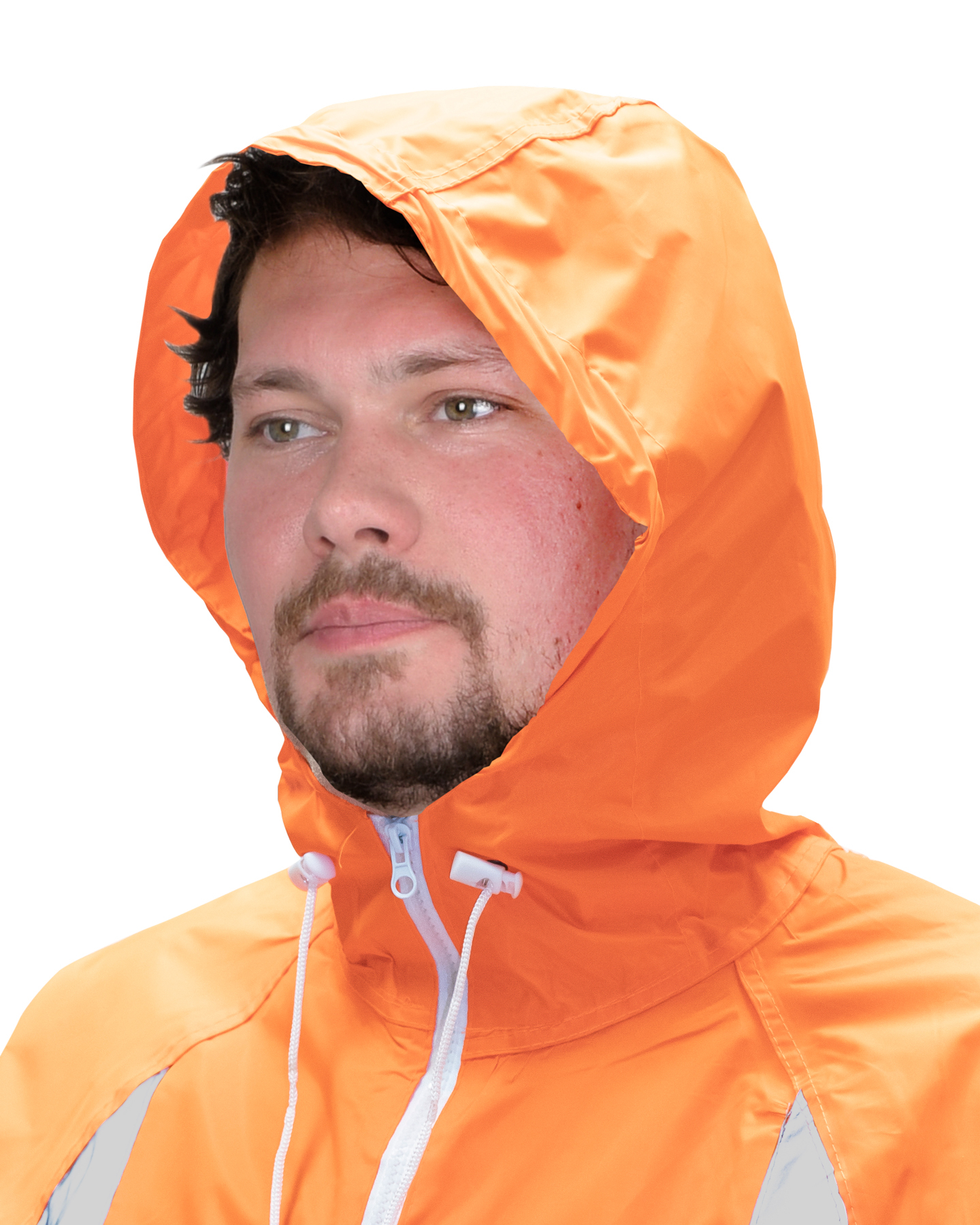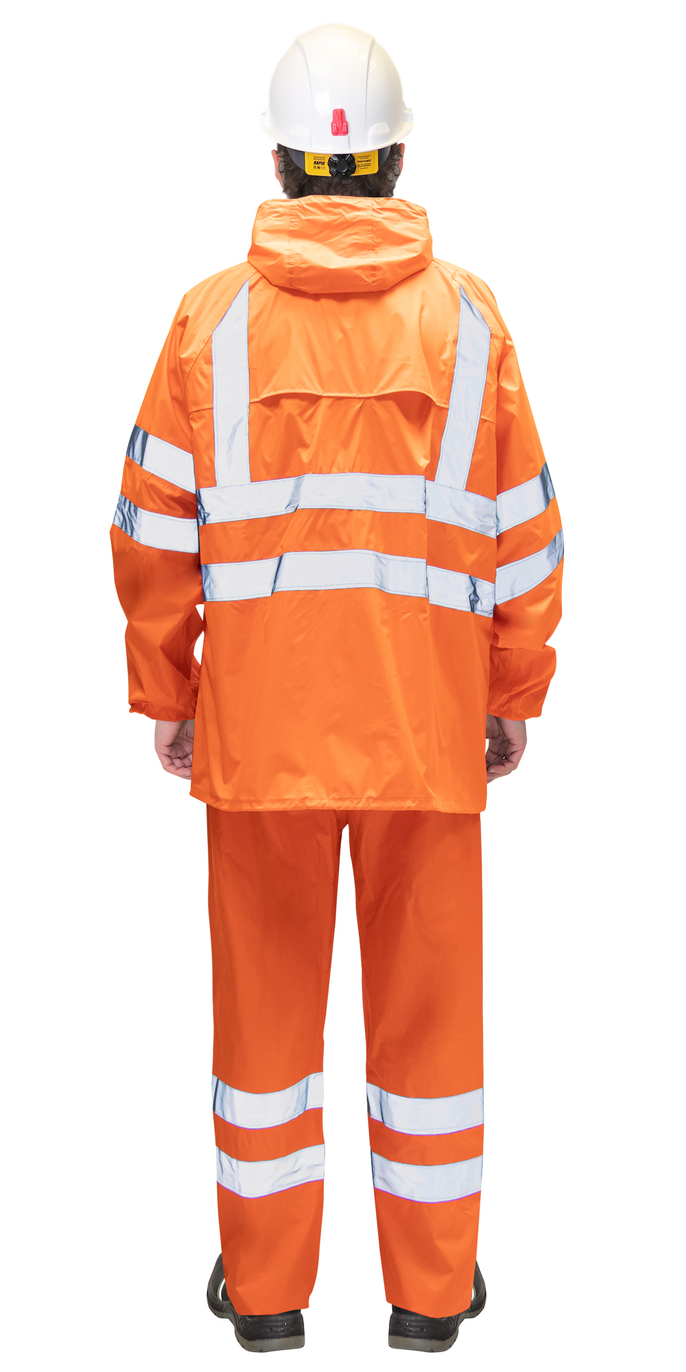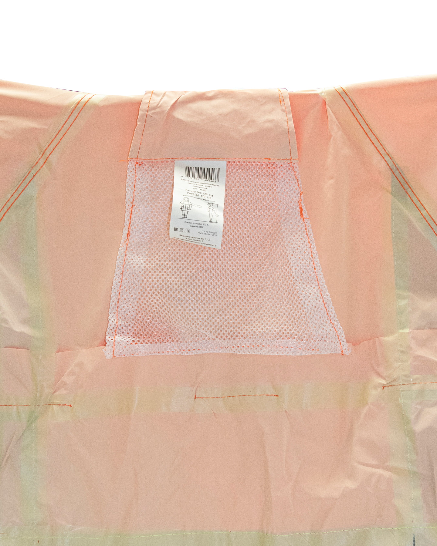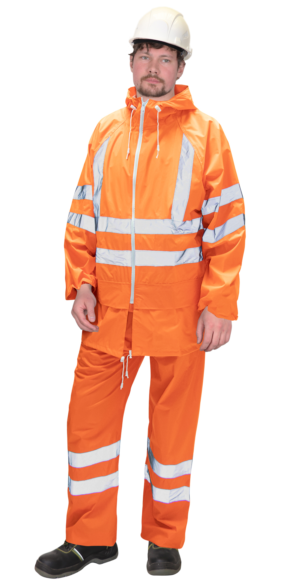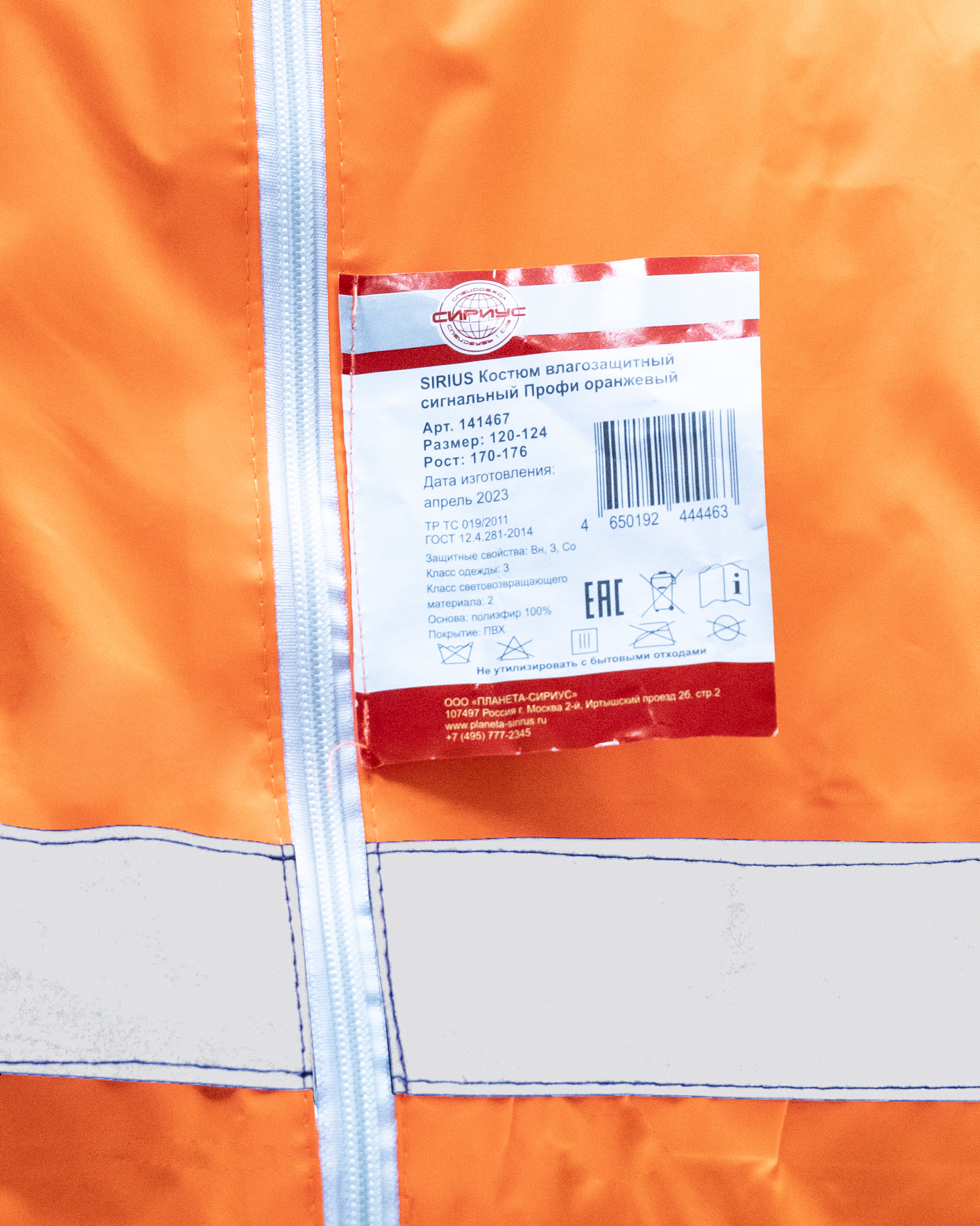Костюм изготавливается из из прочной плащевой ткани ярко-оранжевого цвета с ПВХ покрытием. Вес ткани — 225 гр./метр.кв. Имеет светоотражающие полосы. Соответствует 3-му классу по ГОСТ Р 12.4.219-99 «Одежда специальная сигнальная повышенной видимости», 3-ий класс защиты от воды. - Куртка с застежкой на молнии с ветрозащитной внутренней планкой - Капюшон регулируется шнуром с фиксаторами - Два кармана с клапанами - Рукава с манжетами - Брюки на резинке Каждый костюм упакован в отдельный пакет. Все швы прошиты и загерметизированы специальной лентой.