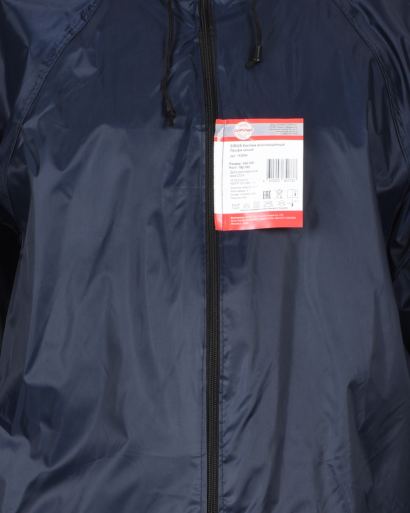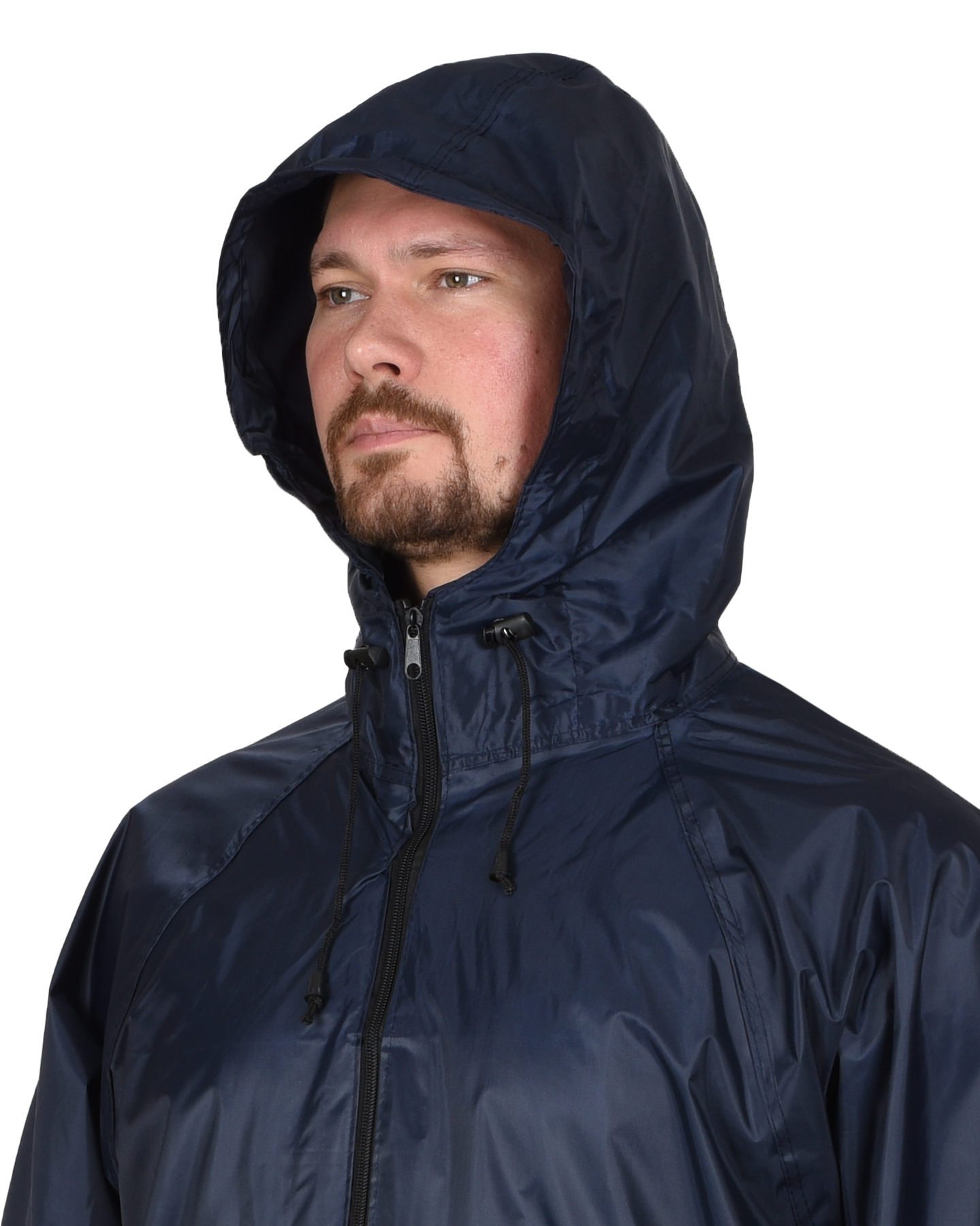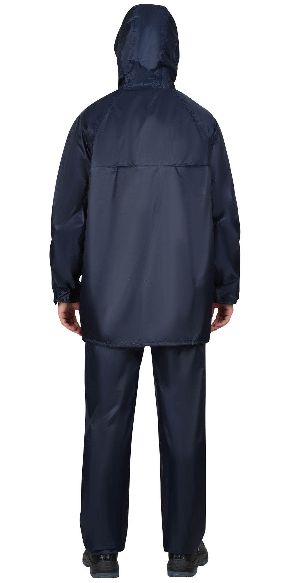 Костюм состоит из куртки и брюк. Куртка имеет два накладных кармана с клапанами. Центральная застежка на молнию со скрытой внутренней ветровой планкой. Все швы прошиты и склеены. Каждый костюм упакован в отдельный прозрачный пакет. Ткань: 190Т полиэфирная тафетта с ПВХ, 225 гр/м2, 2 кармана размер 20см*20см, передняя часть капюшона регулируется шнуром с фиксаторами.