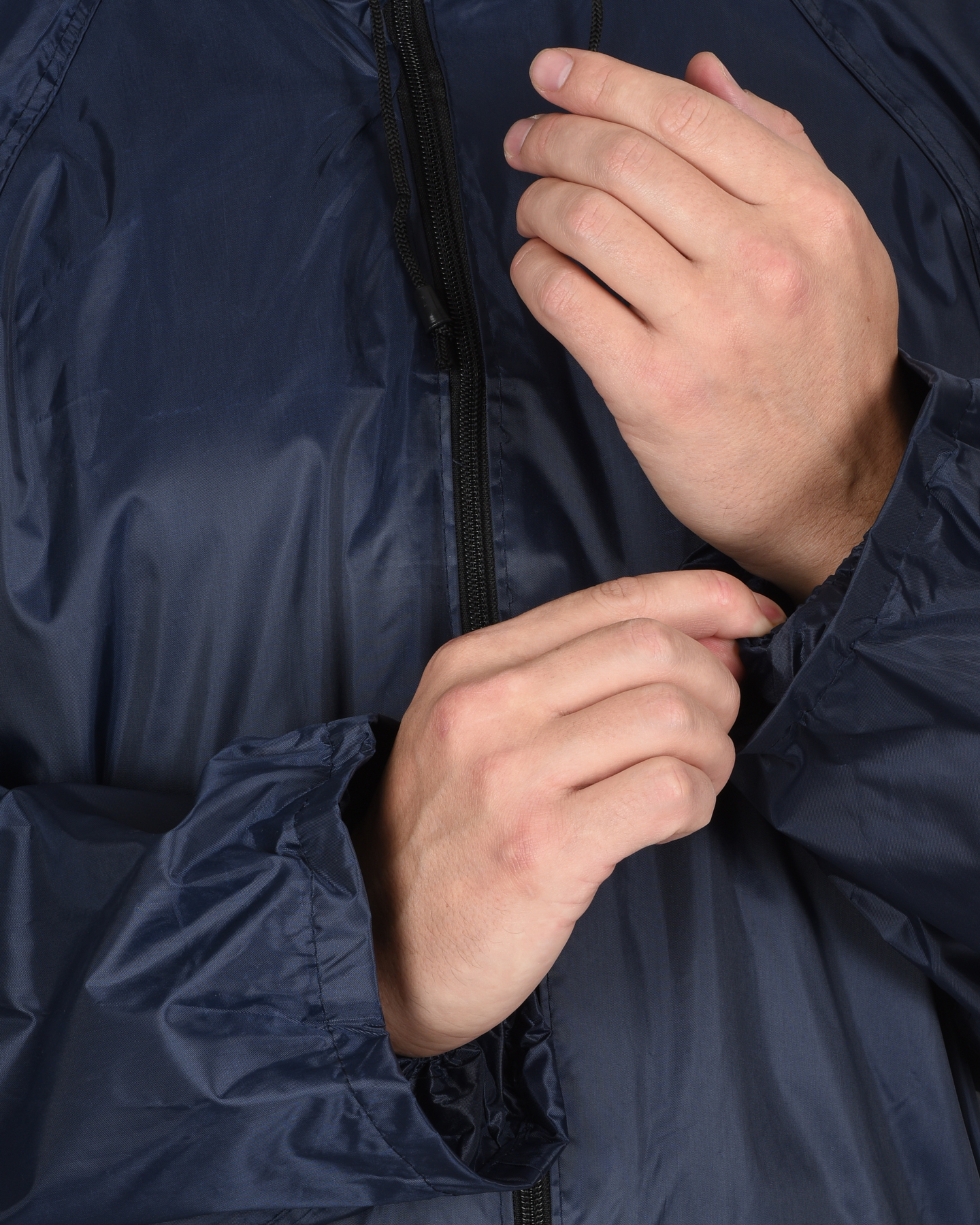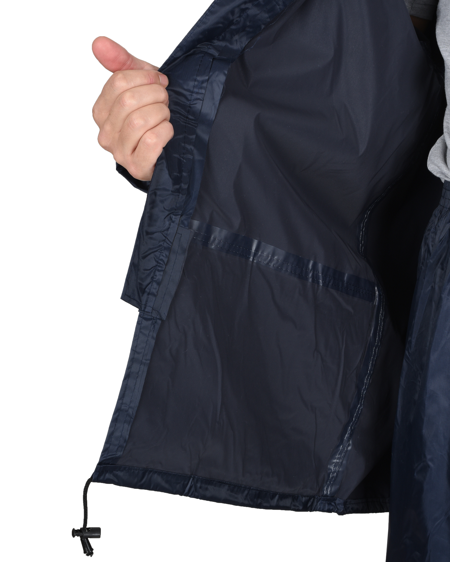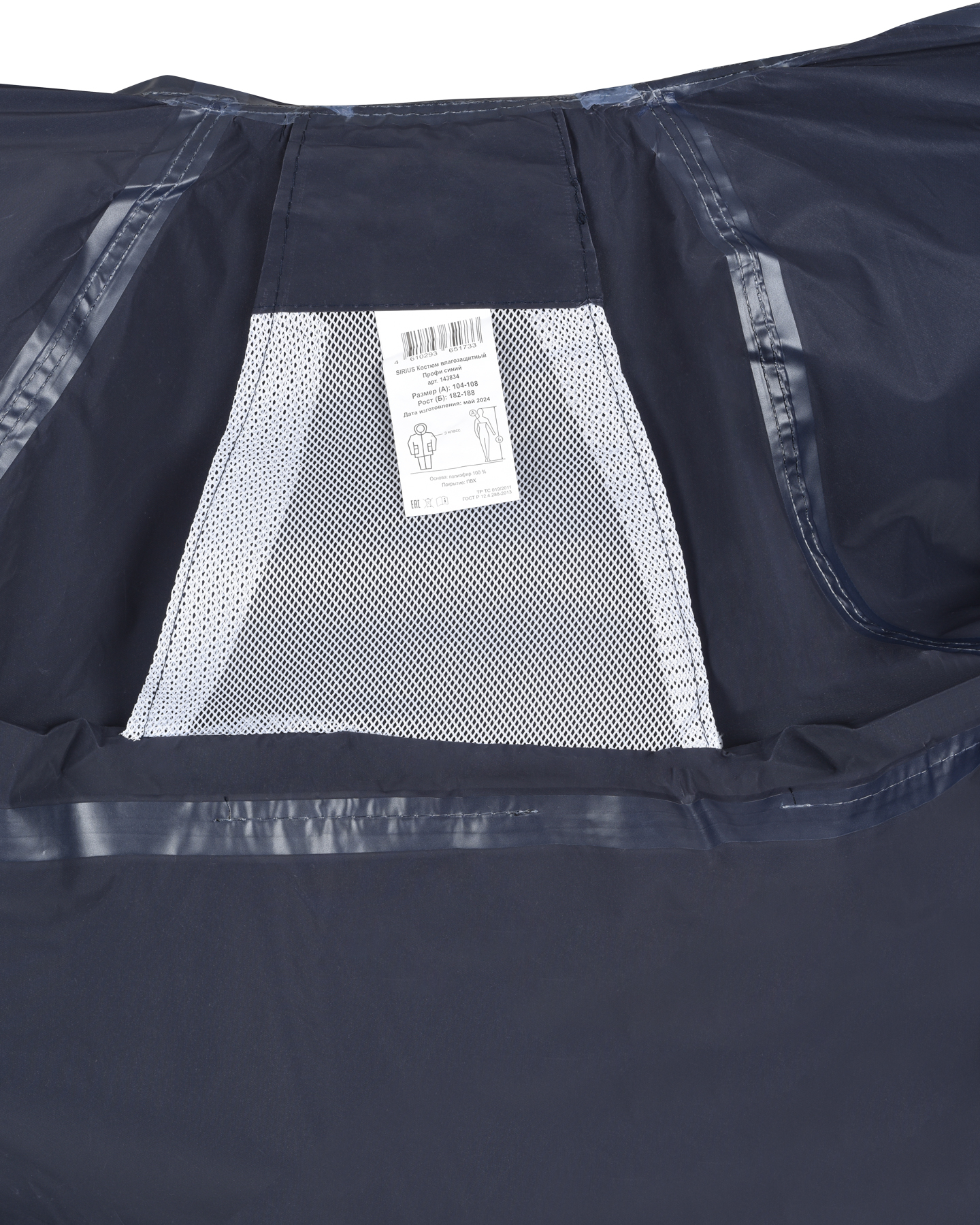 Костюм состоит из куртки и брюк. Куртка имеет два накладных кармана с клапанами. Центральная застежка на молнию со скрытой внутренней ветровой планкой. Все швы прошиты и склеены. Каждый костюм упакован в отдельный прозрачный пакет. Ткань: 190Т полиэфирная тафетта с ПВХ, 225 гр/м2, 2 кармана размер 20см*20см, передняя часть капюшона регулируется шнуром с фиксаторами.
