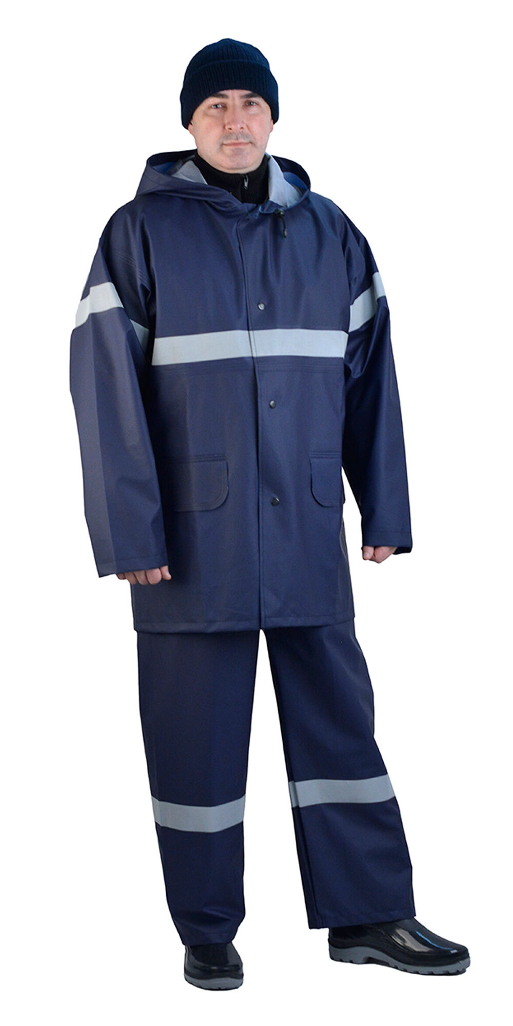 Костюм из прочного, но при этом мягкого и эластичного материала на трикотажной основе с покрытием ПВХ плотностью 280г и толщиной 0.33мм, с герметичными сварными швами. Конструкция костюма, материал, из которого он изготовлен, и сварные швы обеспечивают защиту от воды, ветра, сырой нефти и нефтепродуктов. Куртка на молнии и липах или кнопках. Под кокеткой на спине вентиляционные отверстия с перфорацией. Ширина рукавов регулируется кнопкой. Полукомбинезон, регулируемый по ширине. с карманом. Ширина штанин регулируется кнопкой. Швы герметизируются током ВЧ. Мягкий, эластичный, удобный в носке.