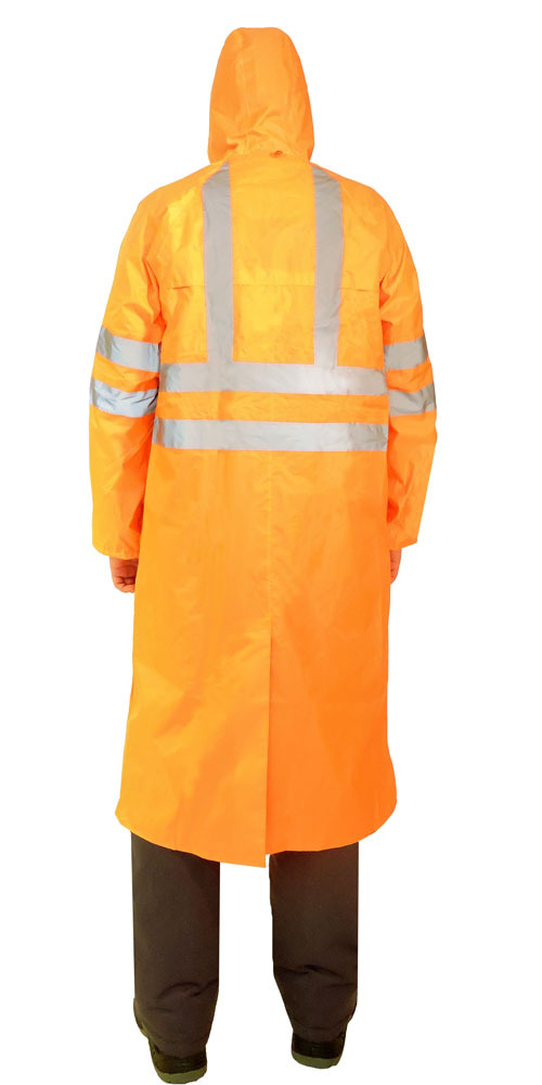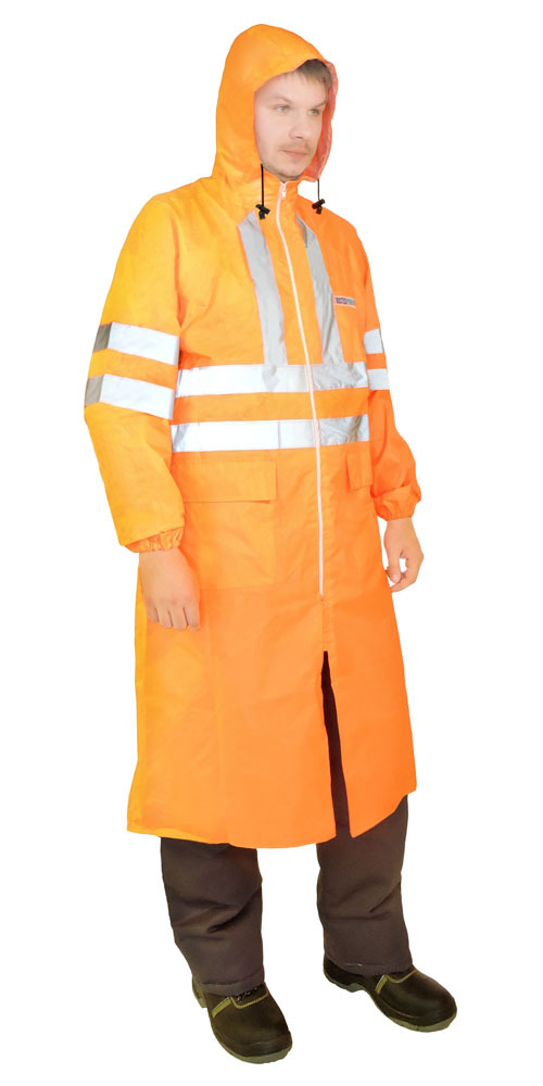 Плащ изготавливается из ткани ярко-оранжевого цвета. Имеет светоотражающие полосы. Соответствует 3-му классу по ГОСТ Р 12.4.219-99 «Одежда специальная сигнальная повышенной видимости». Удобная конструкция: плащ с застежкой на молнии, клапаном против ветра, капюшоном, двумя карманами с клапанами. Ткань: плащ изготовлен из прочной плащевой ткани с ПВХ покрытием. Вес ткани — 225 гр./метр.кв. Водоупорность ткани не менее 5000 мм водяного столба. Ткань экологична и соответствует европейскому стандарту по содержанию вредных веществ EN 71 PART3. Проклеенные швы: все швы костюма загерметизированы специальной лентой.