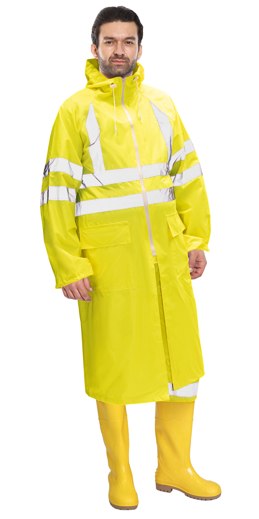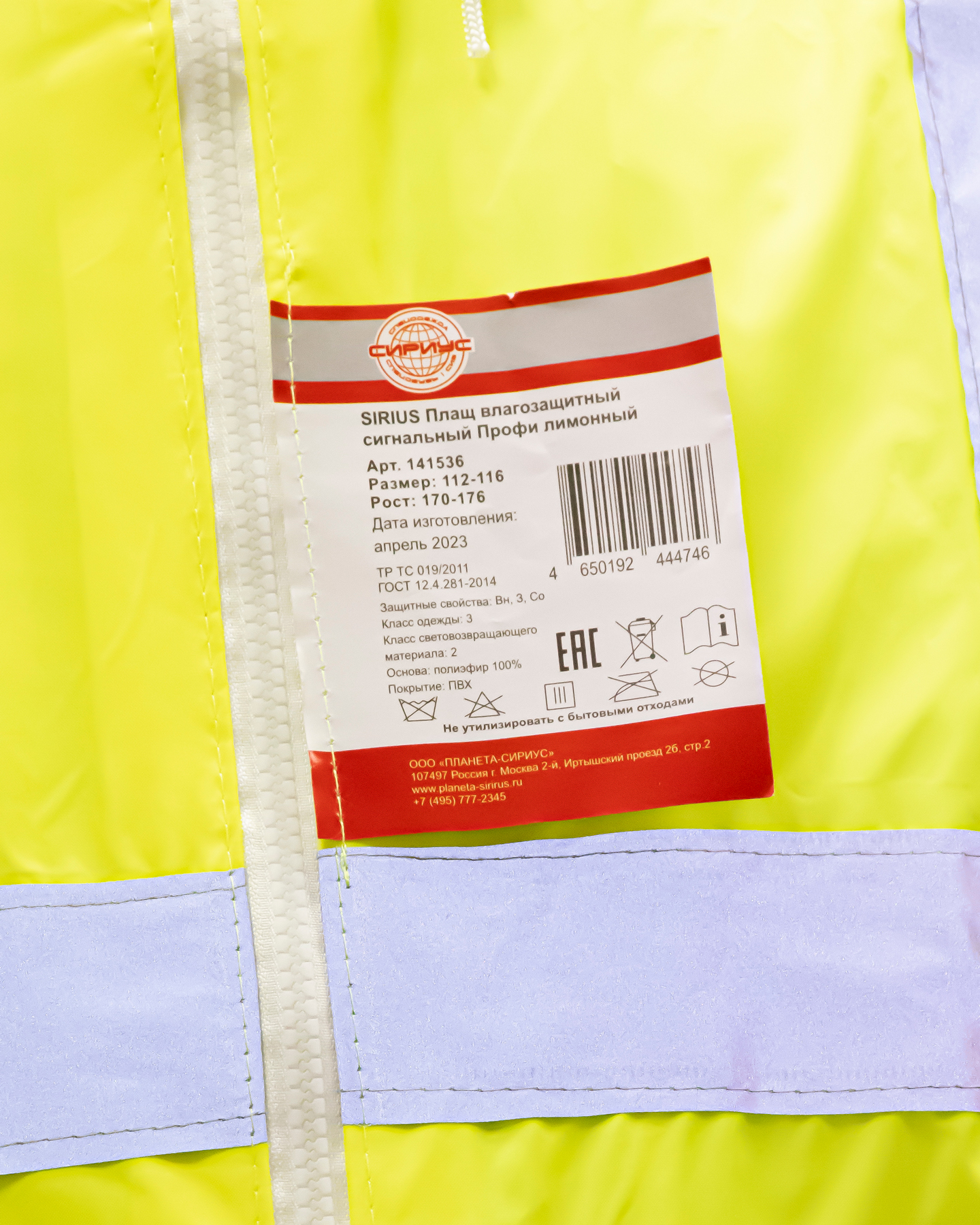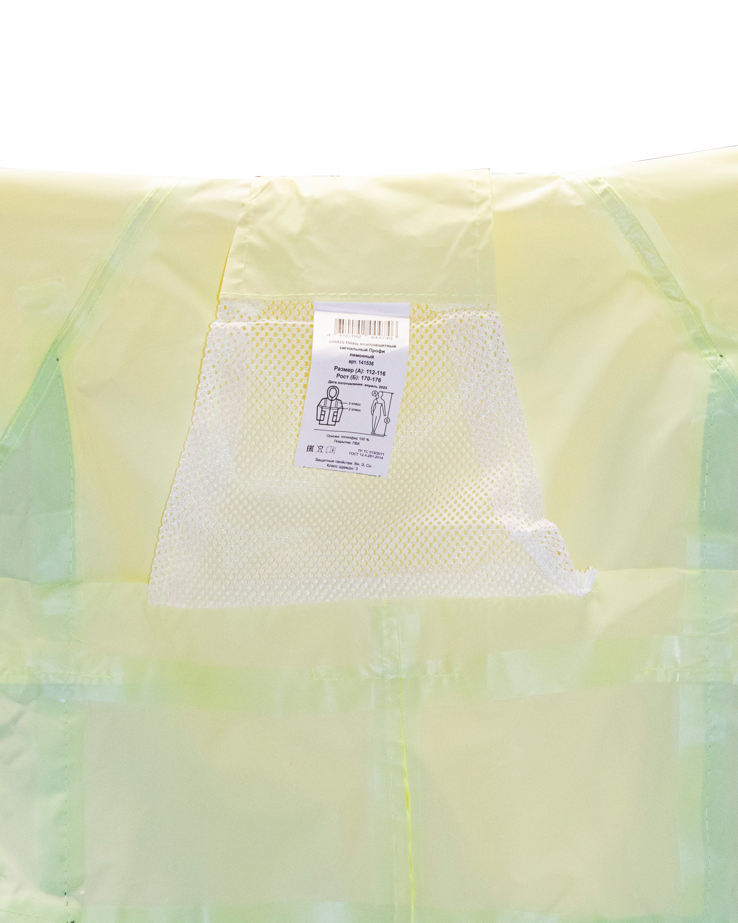 Плащ изготавливается из прочной плащевой ткани ярко-лимонного цвета с ПВХ покрытием. Вес ткани — 225 гр./метр.кв. Имеет светоотражающие полосы. Соответствует 3-му классу по ГОСТ Р 12.4.219-99 «Одежда специальная сигнальная повышенной видимости», 3-ий класс защиты от воды. - Плащ с застежкой на молнии с ветрозащитной внутренней планкой - Капюшон регулируется шнуром с фиксаторами - Два кармана с клапанами - Рукава с манжетами Каждый плащ упакован в отдельный пакет. Все швы прошиты и загерметизированы специальной лентой.