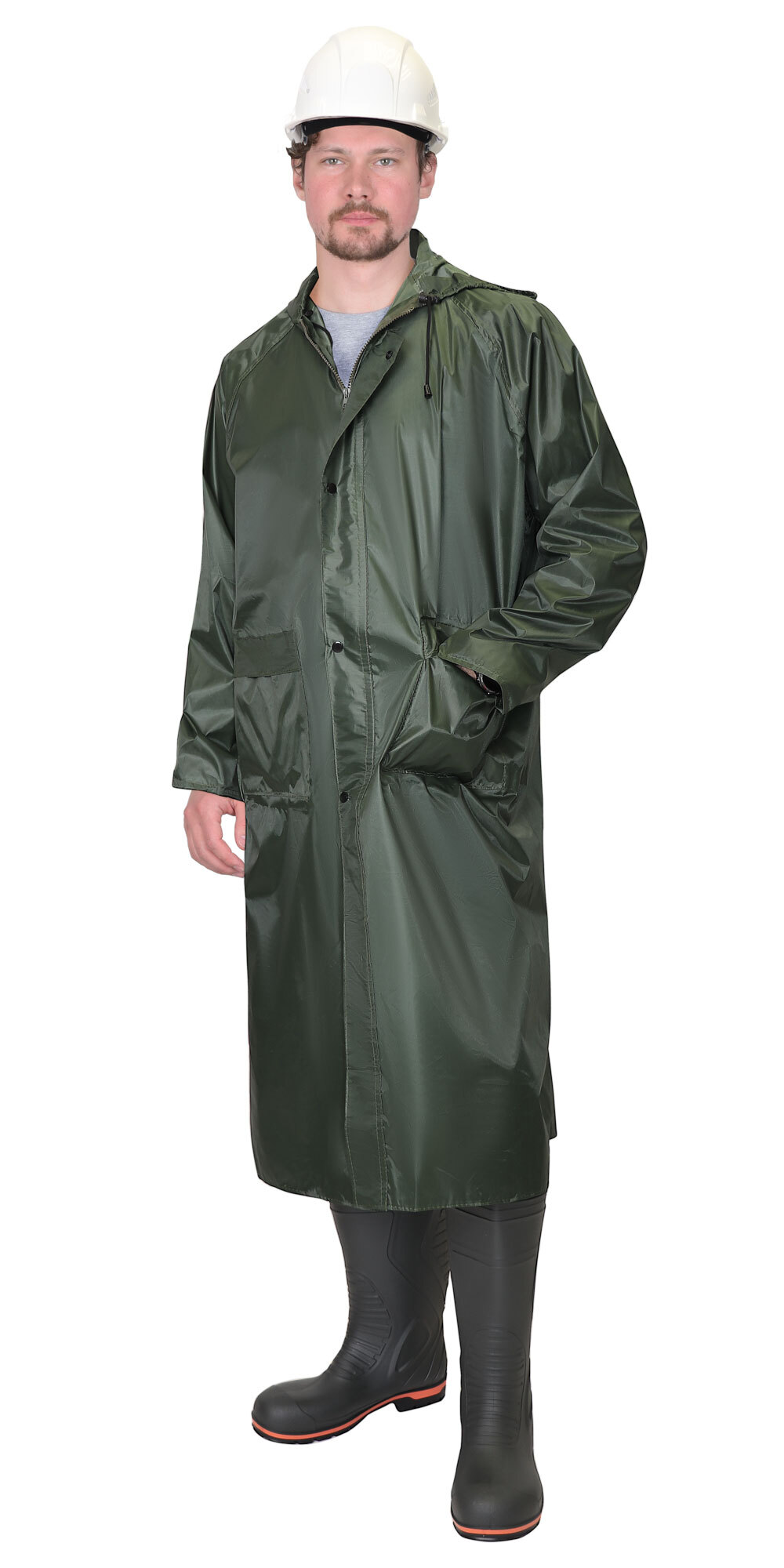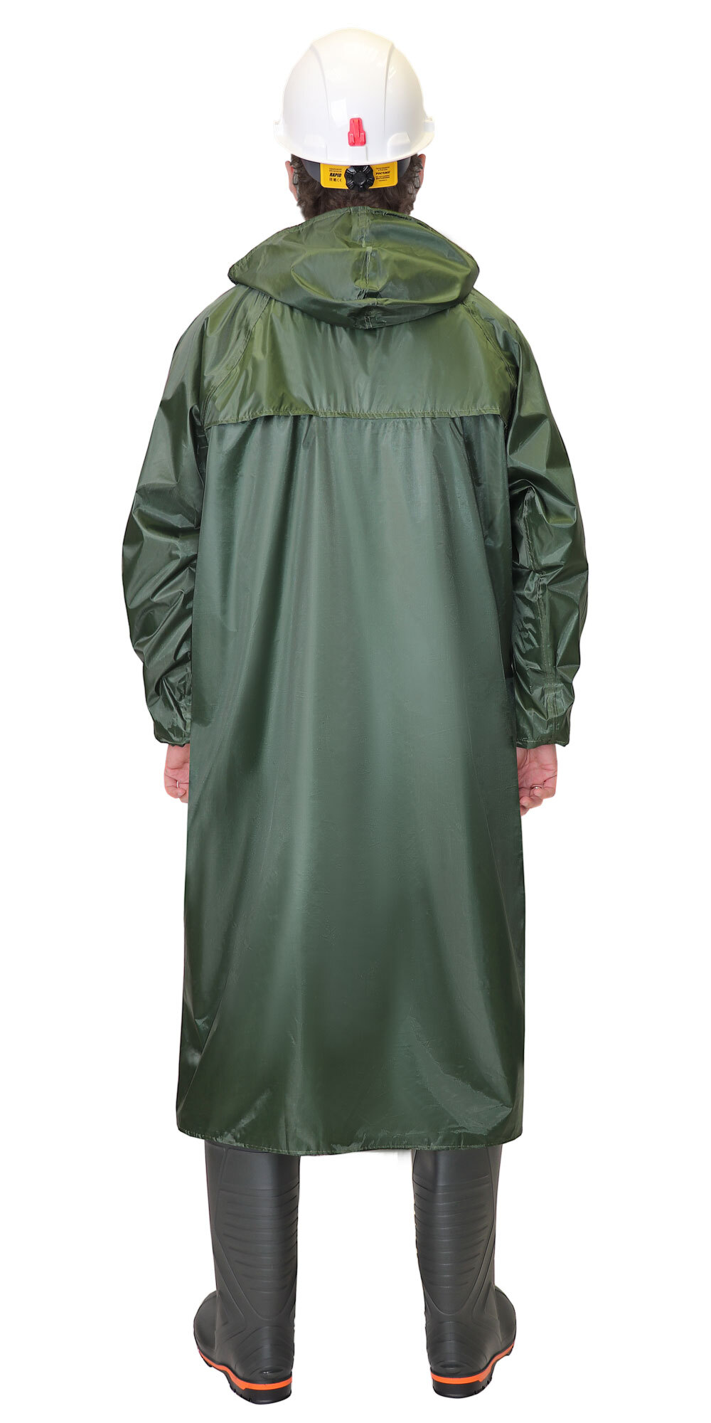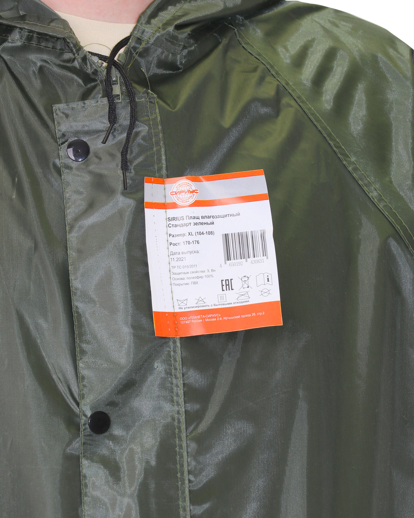 Влагозащитный плащ SIRIUS Стандарт для защиты от дождя, ветра, загрязнений и химических факторов (нефтяных масел). Изготовлен из плотной плащевой ткани с ПВХ покрытием плотностью 210 г/м.кв. Застежка на молнии с дополнительной ветрозащитной планкой на кнопках, что гарантирует высокую защиту от влаги. Проклеенные герметичные швы защищают от влаги и конденсата. Притачной капюшон с регулировкой шнуром. Манжеты на рукавах, обеспечивающие дополнительную защиту от протекания при работе. Вентиляционная кокетка на спине отводит избыточную влагу и создаёт комфорт при движении. Накладные карманы закрываются клапанами. Водоупорность: выше 5000 мм водного столба. -не стирать; -не отбеливать и не хлорировать; -сушить в подвешенном состоянии; -гладить запрещено; -сухая чистка и удаление пятен растворителем запрещены; -температура эксплуатации от +5 до +35.