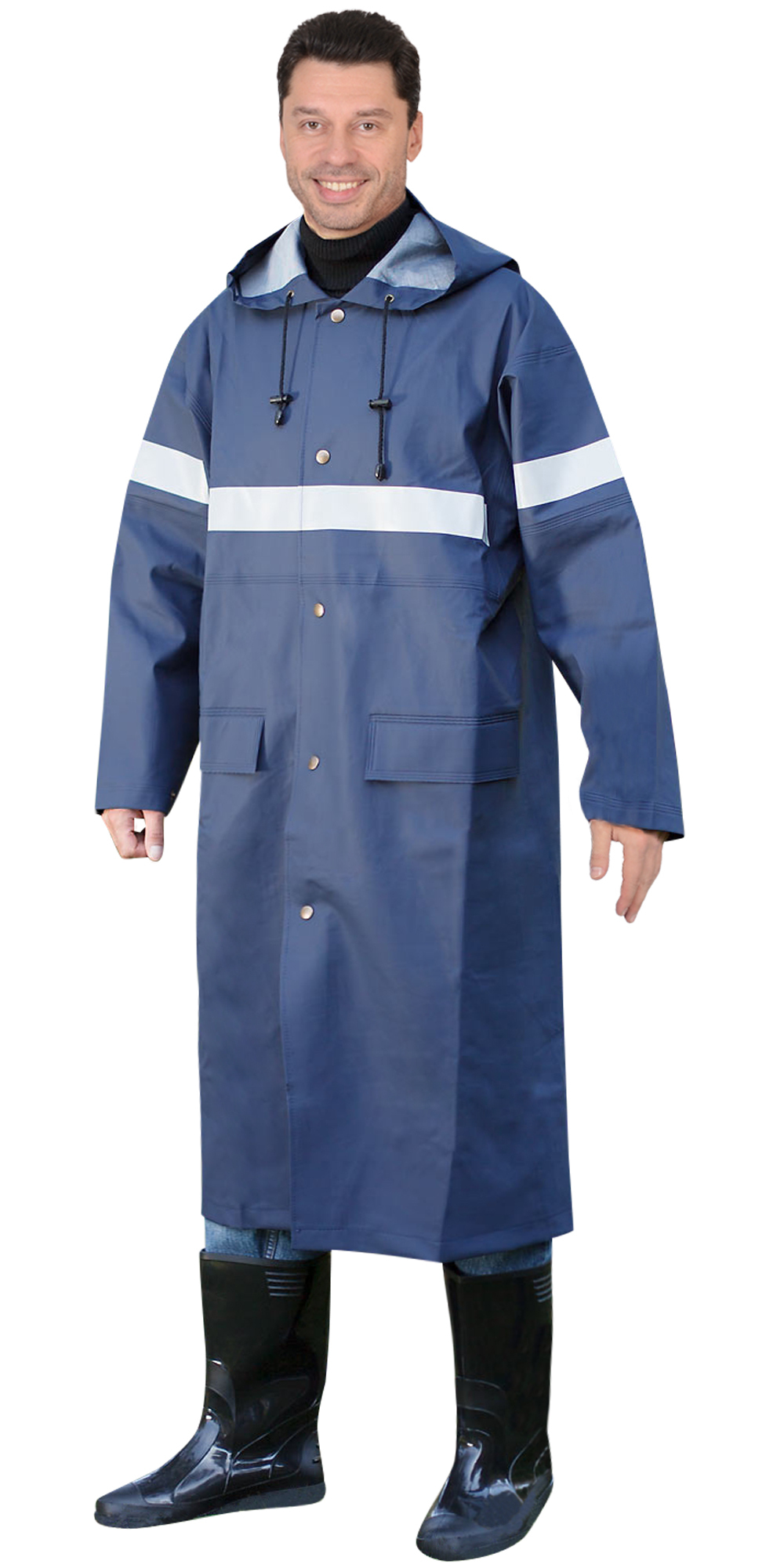 Плащ из прочного, но при этом мягкого и эластичного материала на полиэфирной основе с ПВХ-покрытием, с герметичными сварными швами. Конструкция плаща, материал, из которого он изготовлен, и сварные швы обеспечивают защиту от воды, ветра, сырой нефти и нефтепродуктов. Застежка на кнопки; боковые прорезные карманы с клапаном, вентиляционные отверстия на спинке и в области подмышечных впадин. Объем капюшона позволяет надевать его на каску; кнопка по низу рукава позволяет заузить рукав. Благодаря морозостойкости материала плащ можно носить при низких температурах. Материал: ПВХ-покрытие на полиэфирной основе. Сигнальные элементы: полосы из световозвращающего материала. Цвет: темно-синий.