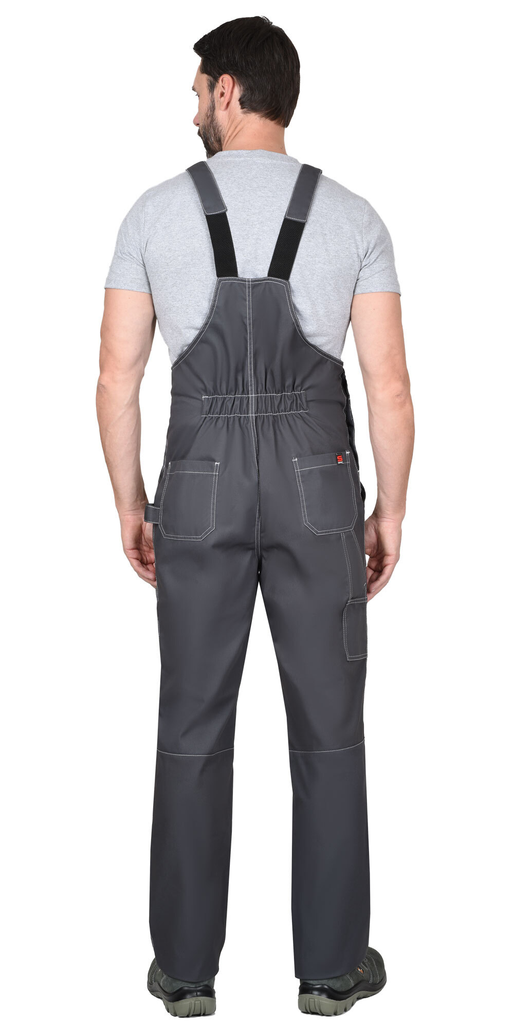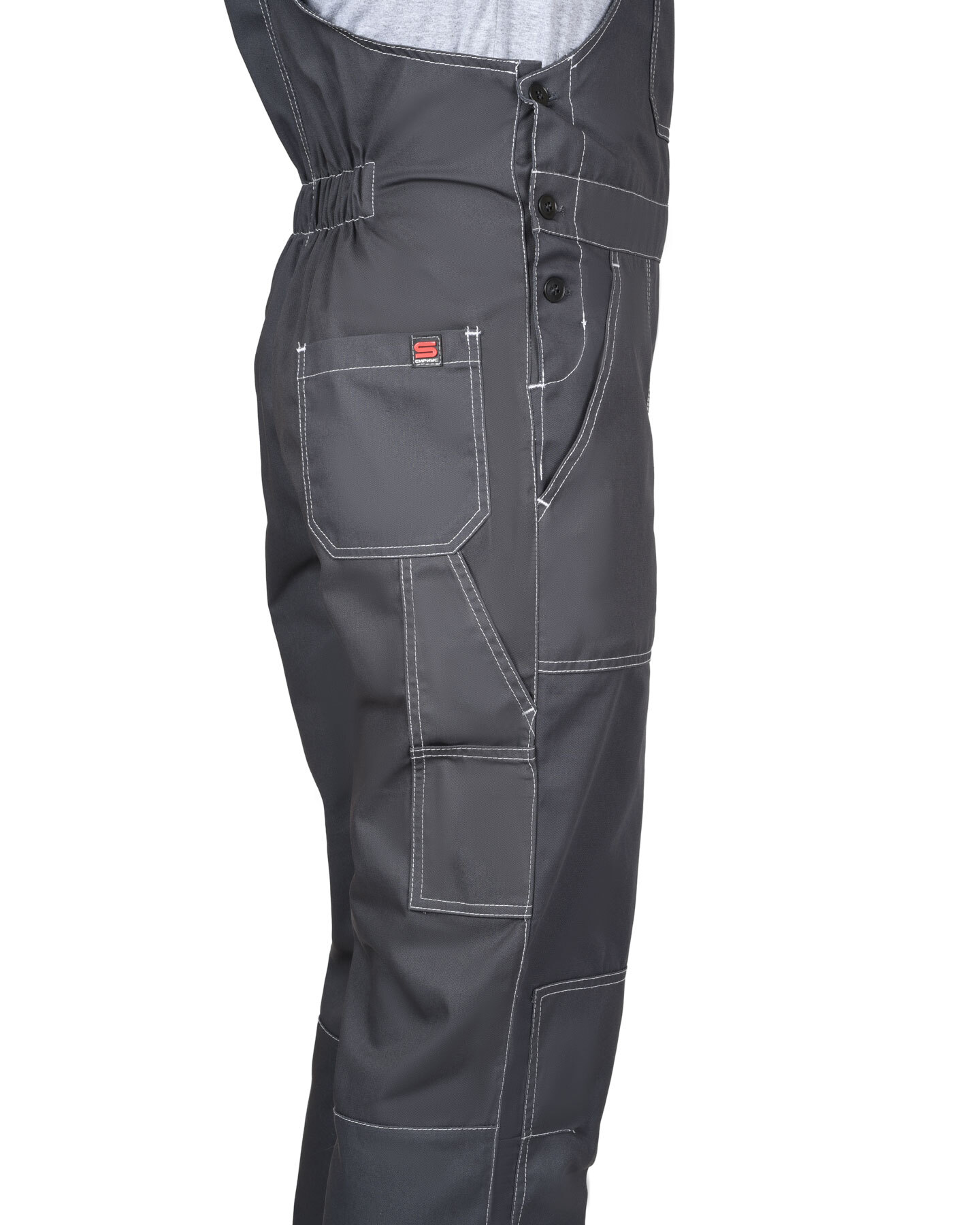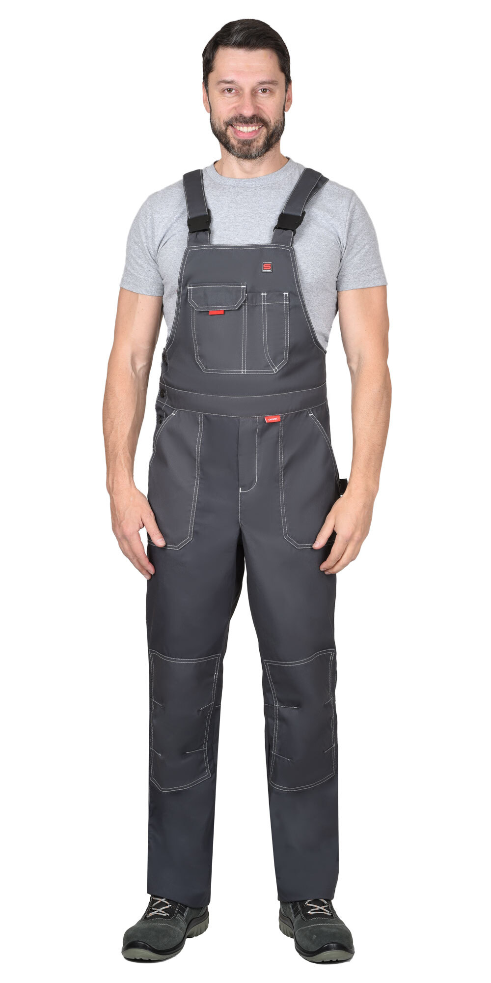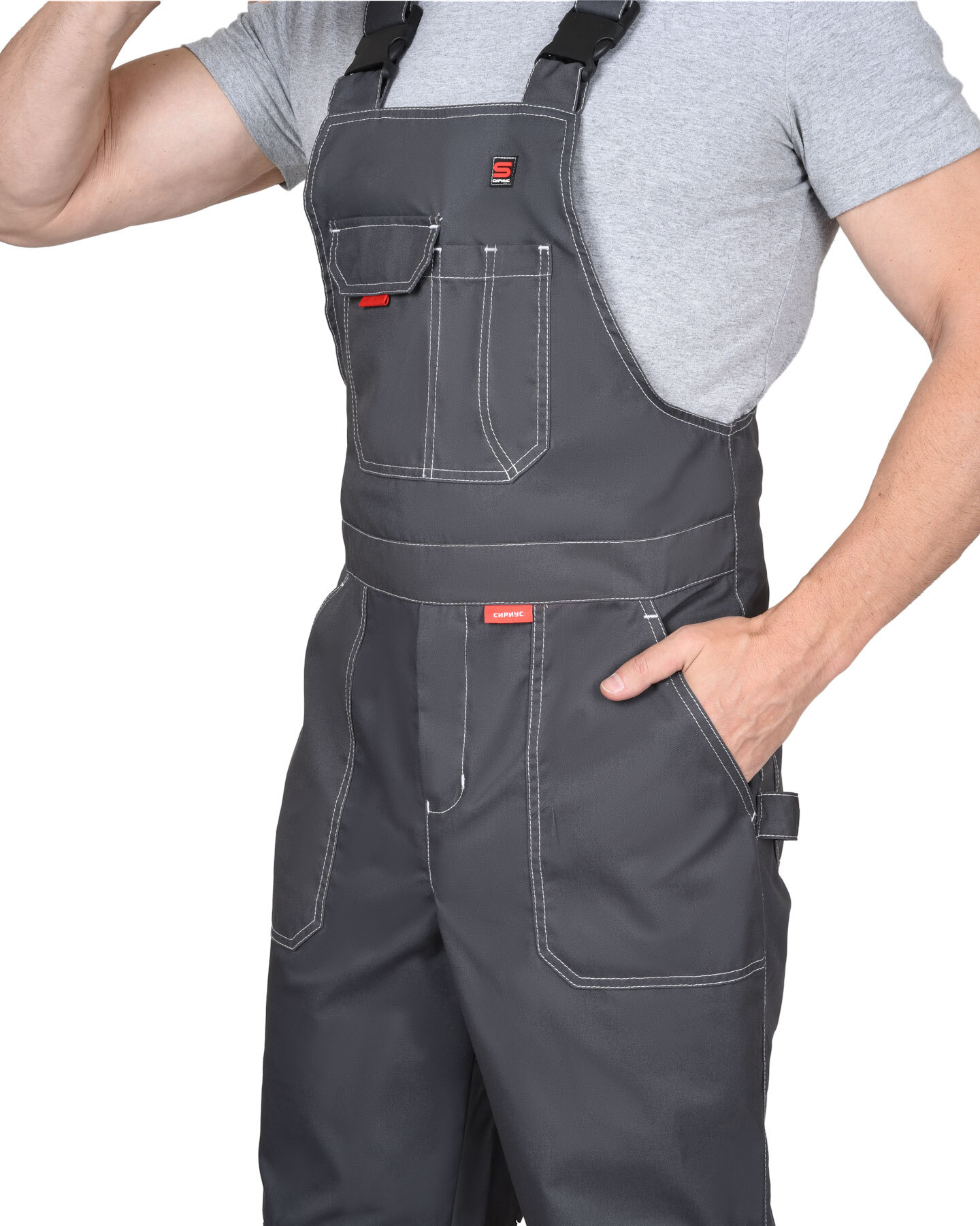 Полукомбинезон с застежкой спереди на однозамковую тесьму молния и в правом боковом шве на три обметанные петли и пуговицы; с различными многофункциональными карманами, объемными наколенниками; с регулируемыми за счет эластичной ленты и фастексов бретелями; с эластичной лентой по спинке, для лучшего прилегания.