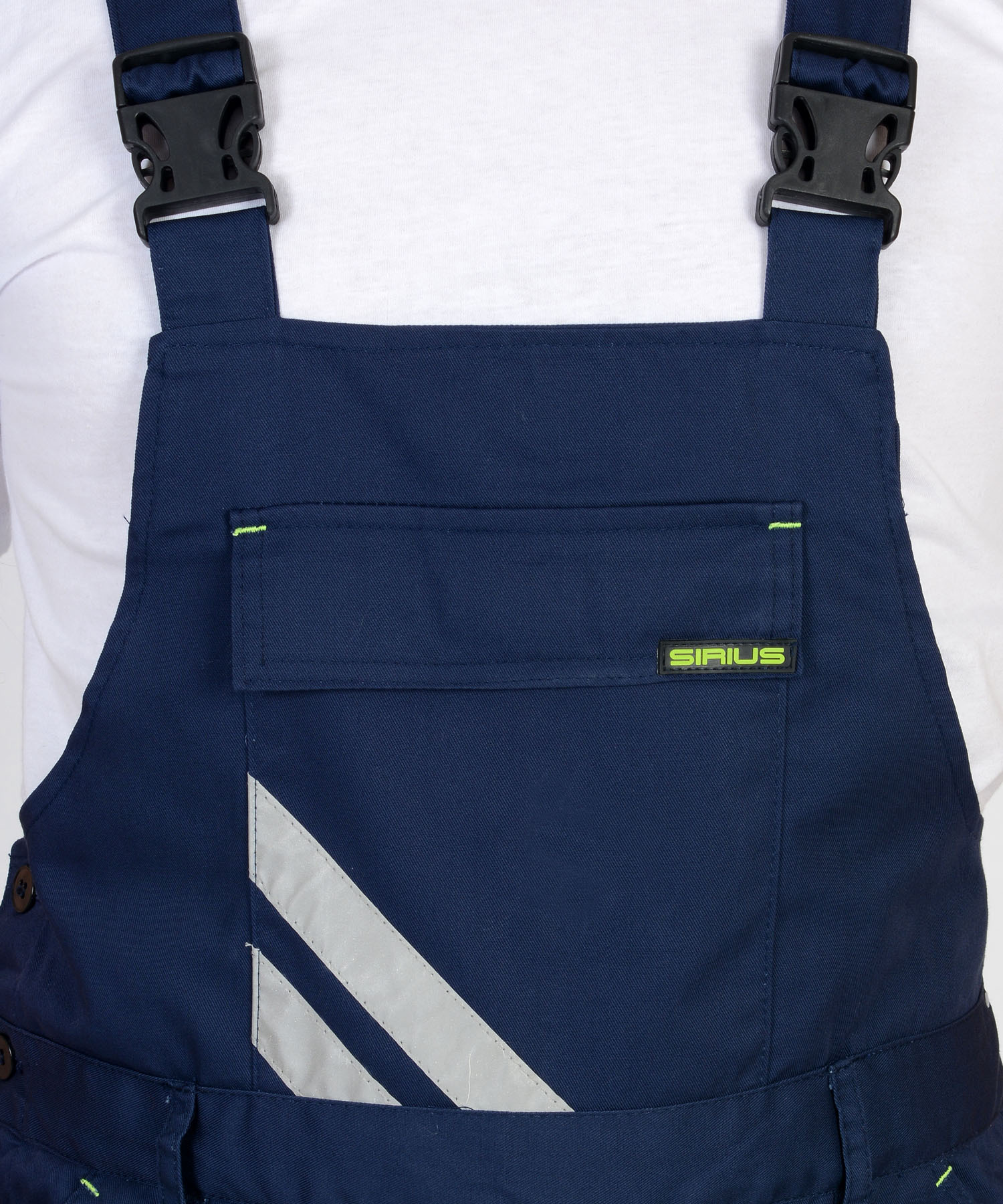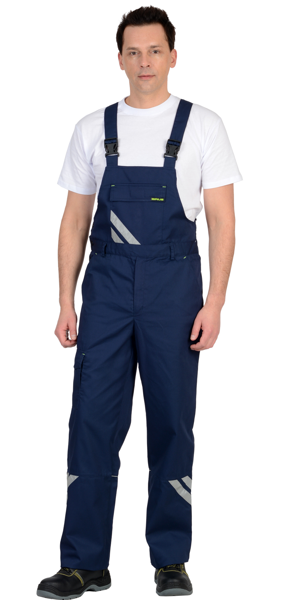 Полукомбинезон застежкой гульфика на тесьму - "молния" с боковой застежкой на пуговицы, с различными функциональными карманами, с элементами из СВ кант и СОП, обеспечивающие безопасность работы в условиях пониженной видимости. ГОСТ 27575-87