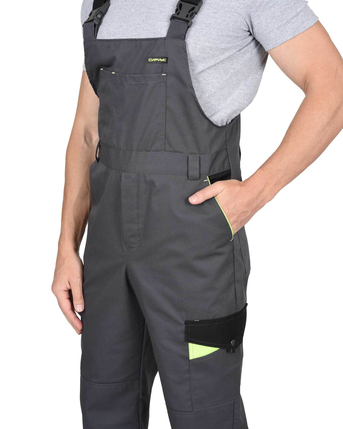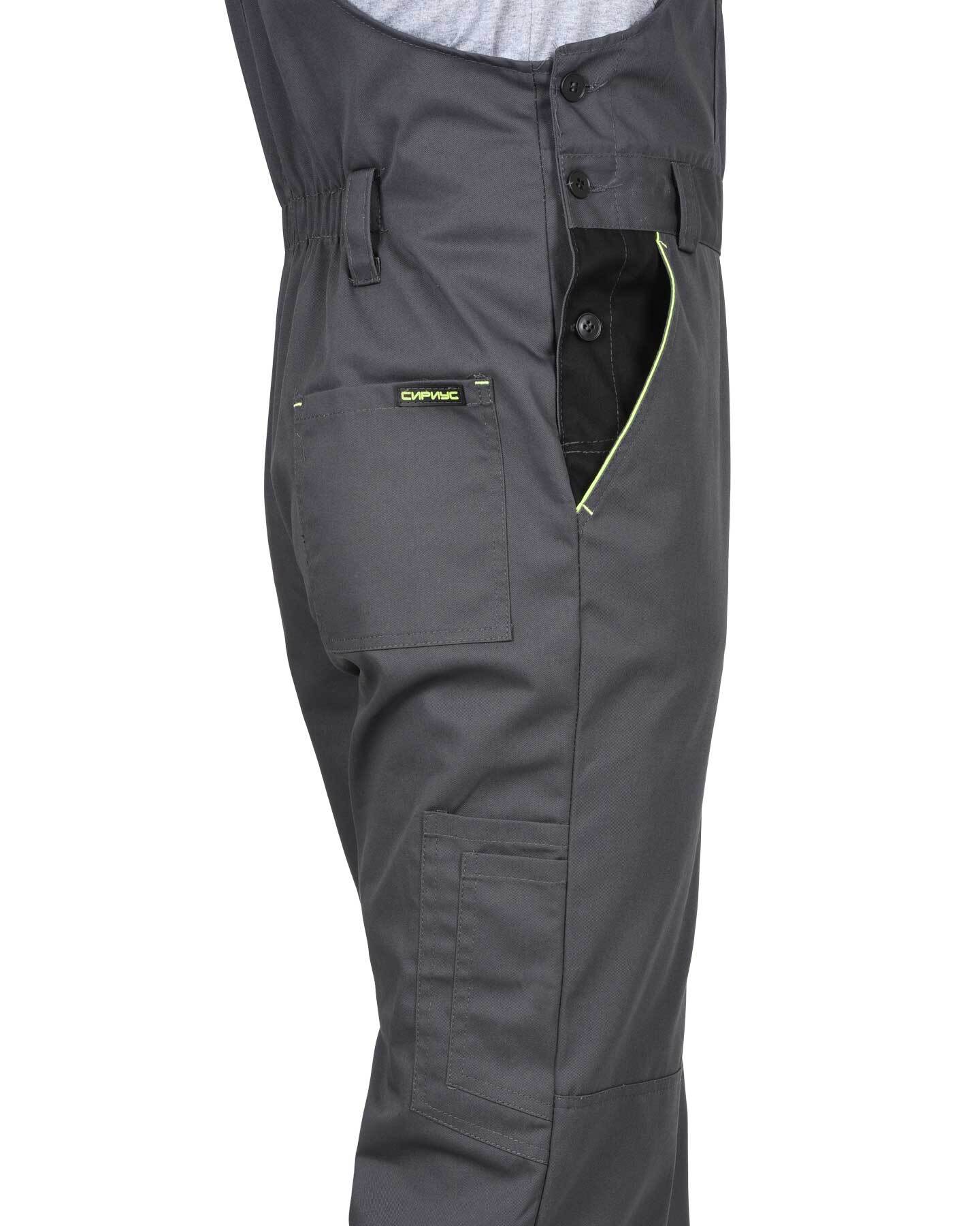 Полукомбинезон с застёжкой гульфика и застёжкой в правом боковом шве на пуговицы; с различными карманами; с наколенниками; по спинке вставлена резинка. ГОСТ 27575-87