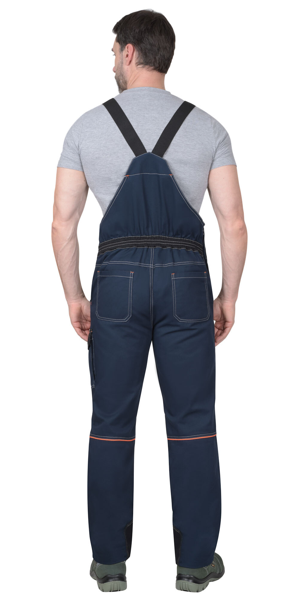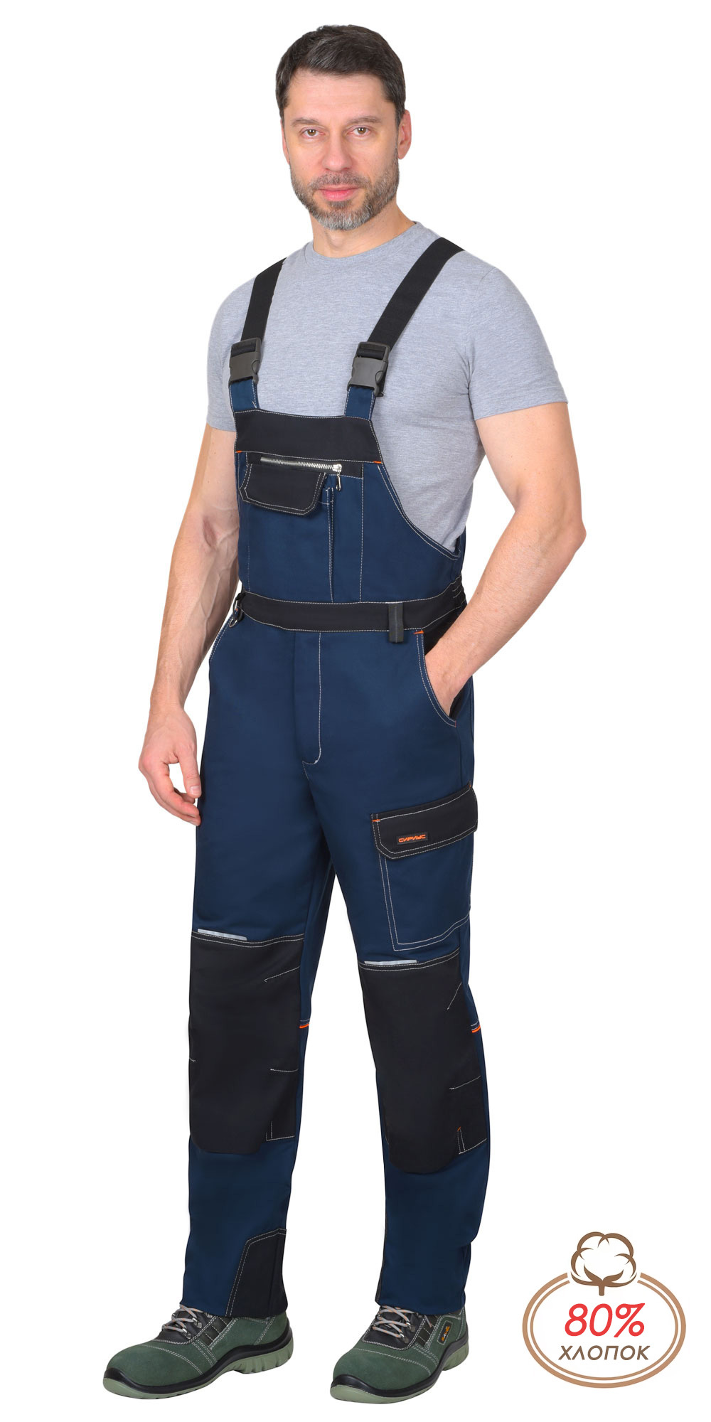 Полукомбинезон летний из смешанной ткани «Карелии-260» с водоотталкивающей пропиткой. Полукомбинезон с застежками: гульфик на молнию, левая боковая на кнопки. На грудке многофункциональный комбинированный карман с клапаном на липучку. Передние половинки с боковыми внутренними карманами и объемными наколенниками. На левом боковом шве накладной полуобъемный карман с фигурным клапаном на липучку. Задние половинки с кантом контрастного цвета, кокеткой и накладными фигурными карманами. По шаговым швам брюк усиленные фигурные накладки. Пояс брюк с широкими шлевками. По шаговым швам полукомбинезона усиленные фигурные накладки. По спинке на всю ширину резинка для лучшего прилегания. Полукомбинезон с бретелями из резинки, длина регулируется застежкой-фастексом. Материал основой: ткань смесовая с пропиткой ВО, пл. 260 г/м², состав 80 ХБ %, 20% ПЭ, цвет: синий Материал отделки: ткань смесовая с пропиткой ВО, пл. 260 г/м², состав 80 ХБ %, 20% ПЭ, цвет: чёрный Светоотражающий материал: лента СОП