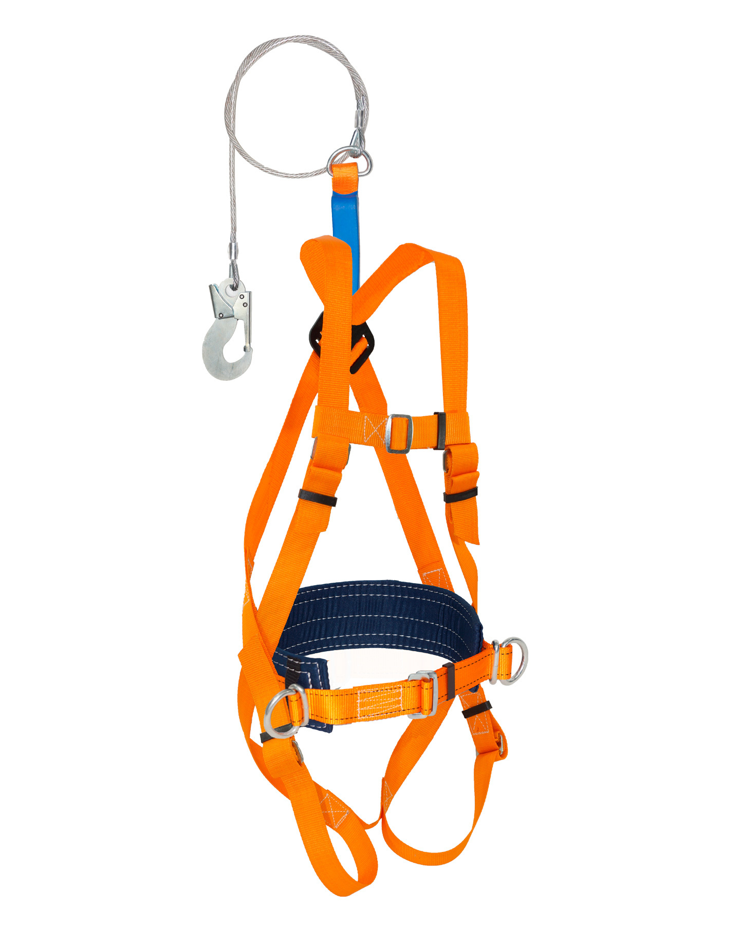 УС 2 аБЖ - Страховочная система с наплечными и набедренными лямками со стропом из металлического троса в ПВХ оболочке с амортизатором. Данная система является принадлежностью личного снаряжения, используется в качестве страховки рабочего на высоте в процессе производства строительных, монтажных, ремонтных и восстановительных работ. Применение: для останова падения работающего при срыве с высоты. Состоит из привязи ремня с пряжкой, наплечных и набедренных лямок, кушака, двух D-колец на поясе (для удержания и позиционирования) и одного на спине и страховочного стропа из металлического троса в ПВХ оболочке с амортизатором. Привязь упакована в водонепроницаемый пакет и содержит паспорт и инструкцию по применению. Соблюдать меры предосторожности, которые могут повлиять на работу стропа и системы, например: электропроводность, абразивные или климатические воздействия, химические реактивы, маятниковые падения. Название по отмененному ГОСТ Р 12.4.184-95: Пояс предохранительный ПП-2аБЖ Статическая нагрузка: не менее 15 кН (1500 кгс) ГОСТ Р ЕН 363-2007 ГОСТ Р ЕН 358-2008 Обхват пояса: 740-1440 мм