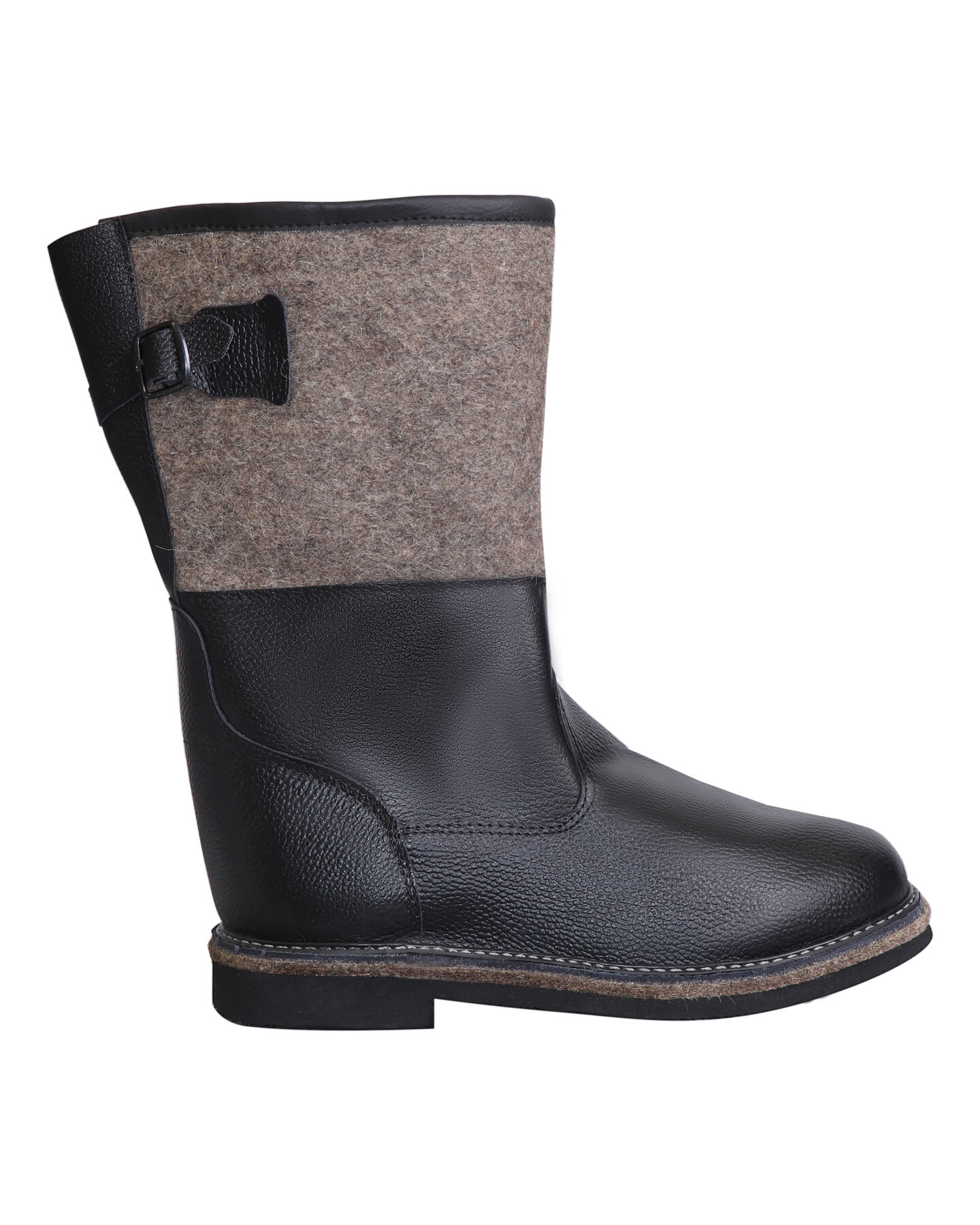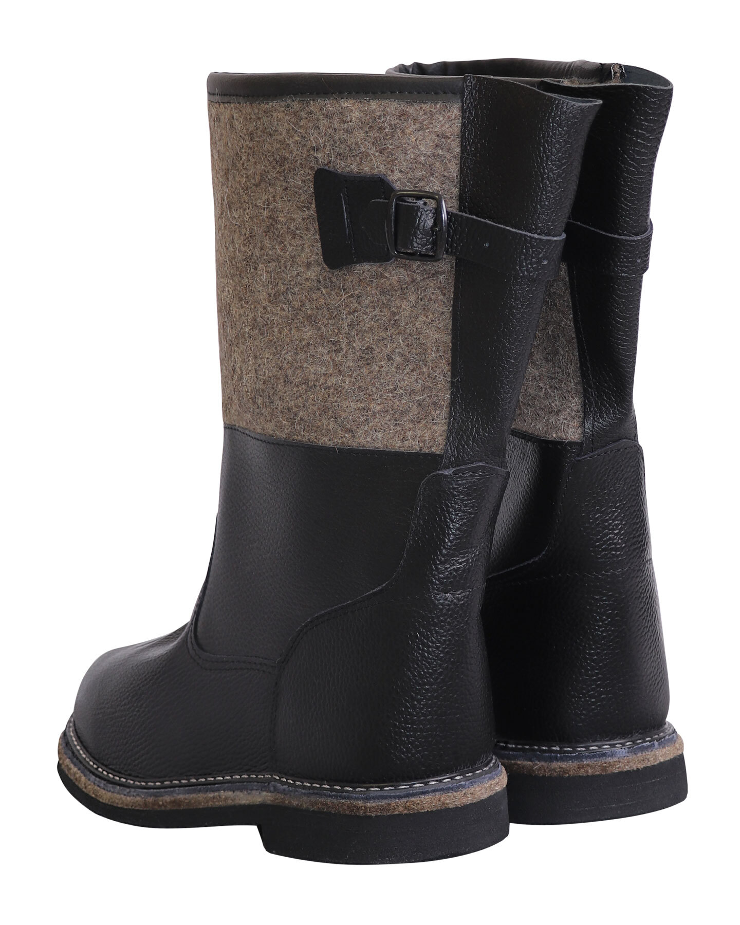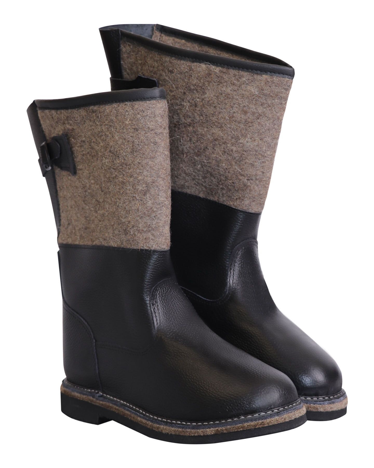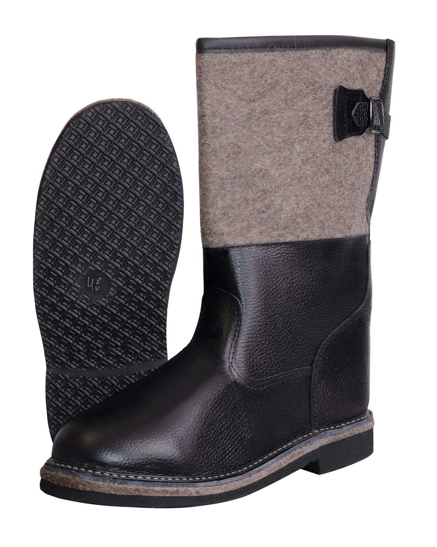 Эта модель – альтернатива валяной обуви, потому что сочетает теплоизолирующие свойства валенок (вся внутренняя часть сапог из войлока) и в то же время отлично защищает ноги от воздействия влаги (союзка и внешняя нижняя часть сапог выполнены из натуральной водостойкой кожи). Верх сапог – комбинация материалов (кожа и войлок), утеплитель – войлок. Усиленный подносок из термопласта - надежно защищает стопу от механических повреждений. Метод крепления подошвы - рантопрошивной. Голенище регулируется по ширине исключая проникновение снега, воды и грязи внутрь обуви. Эти сапоги идеально подойдут для лесников, строительных, погрузочно-разгрузочных работ, для монтажников металлоконструкций, а также для различных отраслей сельского хозяйства и промышленности при работе в зимнее время.