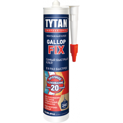 Tytan professional gallop fix клей монтажный предназначен для внутренних и наружных работ в сухих и влажных помещениях, обеспечивая надежное соединение древесины, камня, керамики, металла.