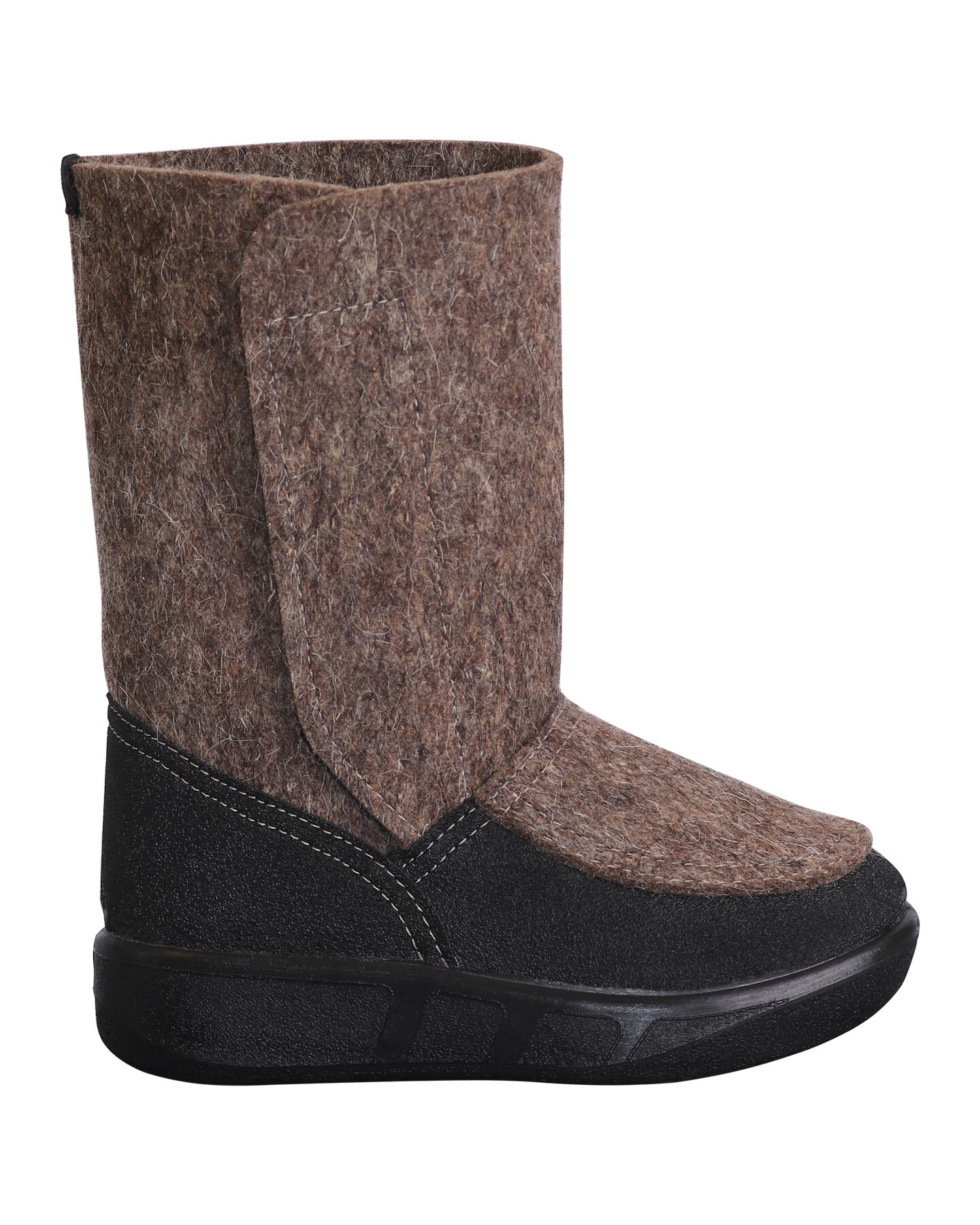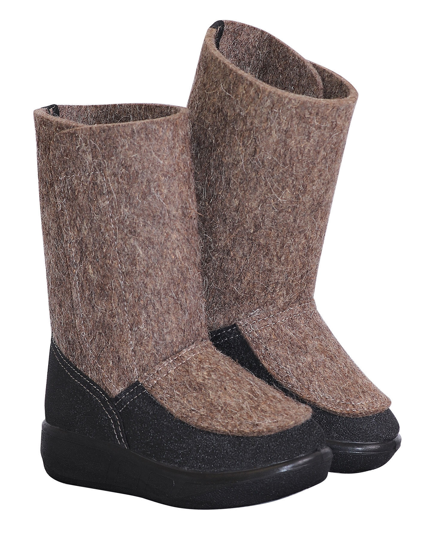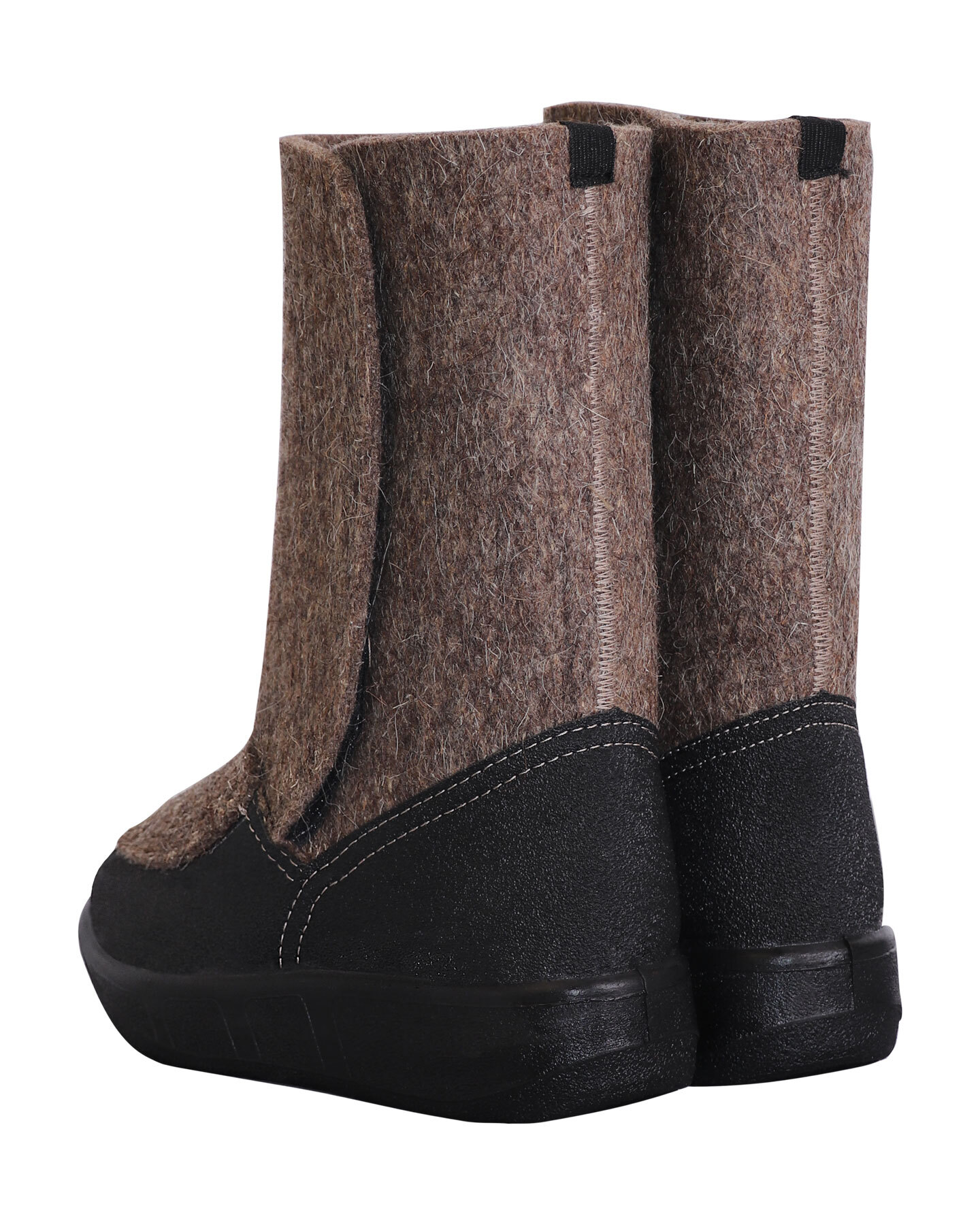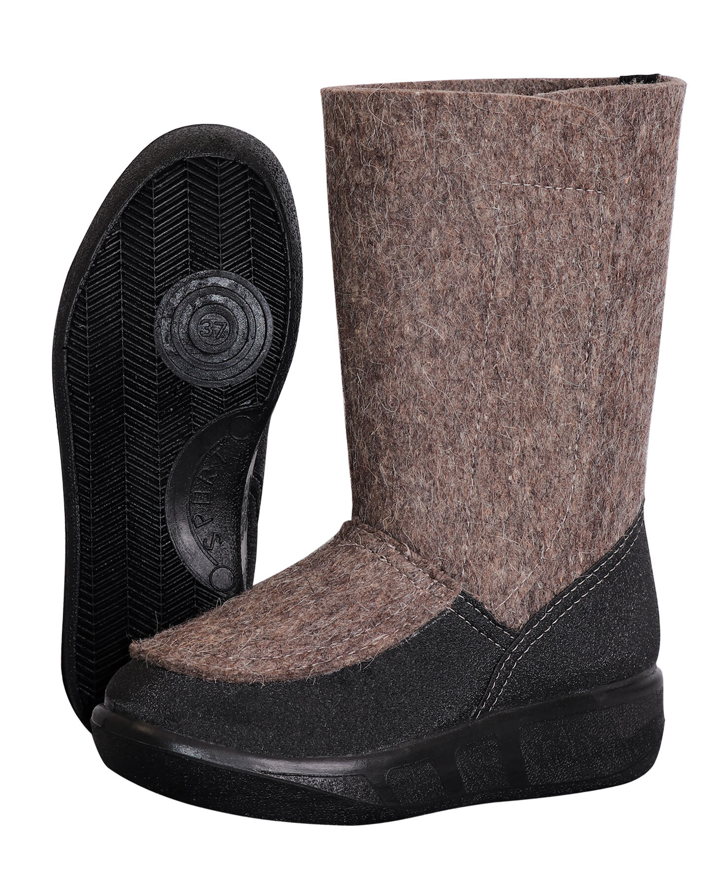 Валенки полусапоги имеют удобную колодку и оптимальный дизайн. Они выполнены из натурального войлока, а потому отлично сохраняют тепло. В такой обуви не страшны даже сильные морозы. Серо-кофейный цвет делает изделия практичными. На них не будут видны следы от пыли и жира. Уход за валенками предельно прост: достаточно чистить их жесткой щеткой. Качественная отстрочка и дополнительная черная обсоюзка по низу позволяют обуви выдерживать значительные нагрузки, не теряя первоначального вида. Высокая литая подошва выполнена из ПУ (полиуретана). Она хорошо гнется, но не трескается в процессе эксплуатации, защищает ноги от промерзания, не пропускает влагу внутрь. Противоскользящий протектор позволяет уверенно передвигаться по ледяной и заснеженной дороге.