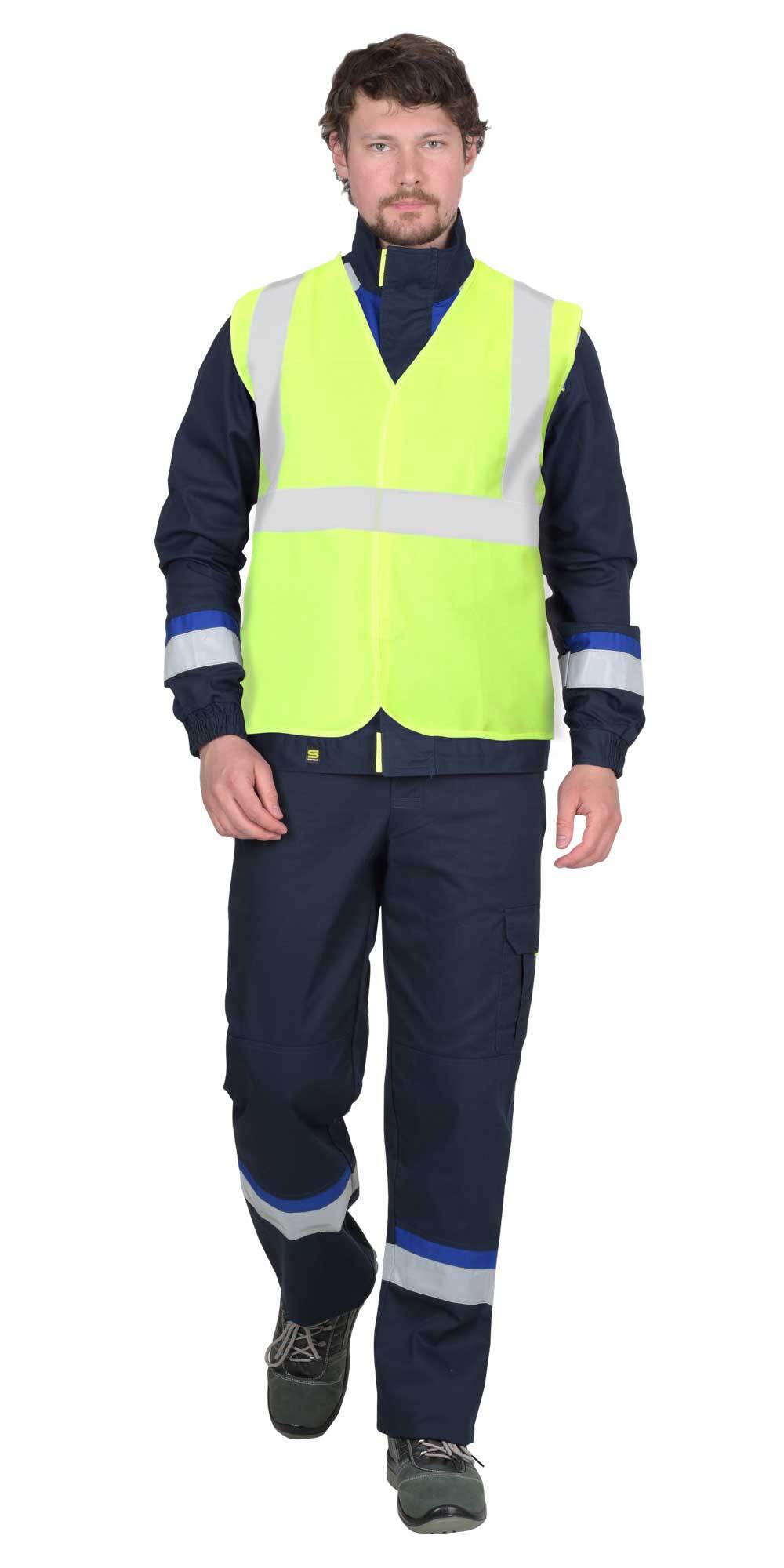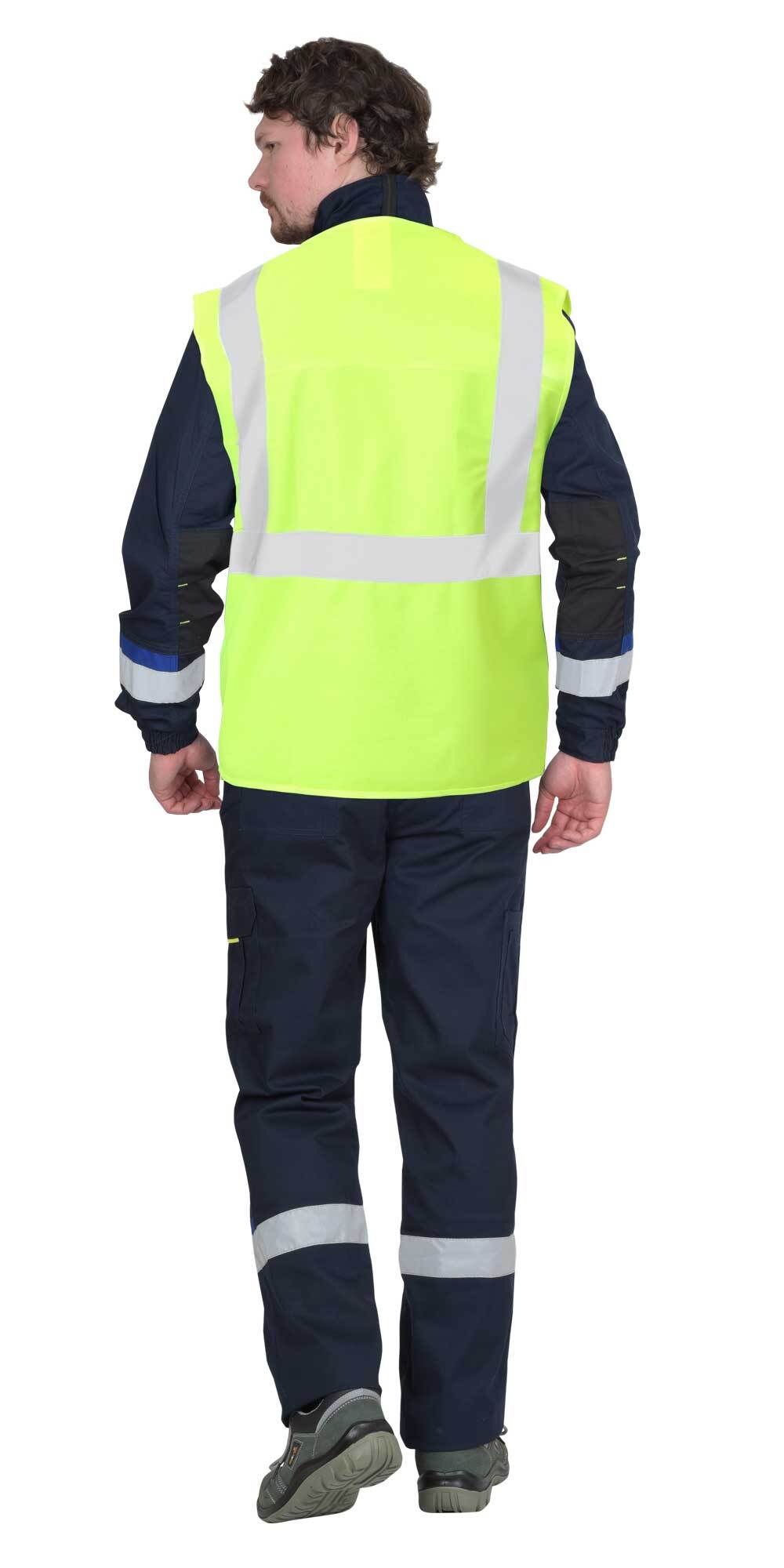 Жилет сигнальный SIRIUS повышенной видимости для безопасности сотрудников в дневное и темное время суток. 1 класс защиты. Изготовлен из трикотажного полотна плотностью 100 г/кв.м с 1 горизонтальной и 2 вертикальными лентами СОП (ширина 50 мм) и центральной застежкой на липкую ленту велькро.
