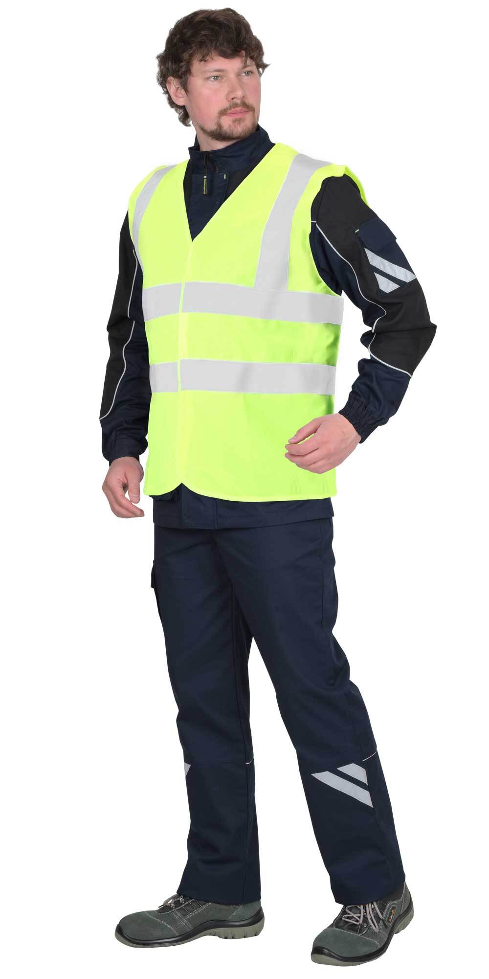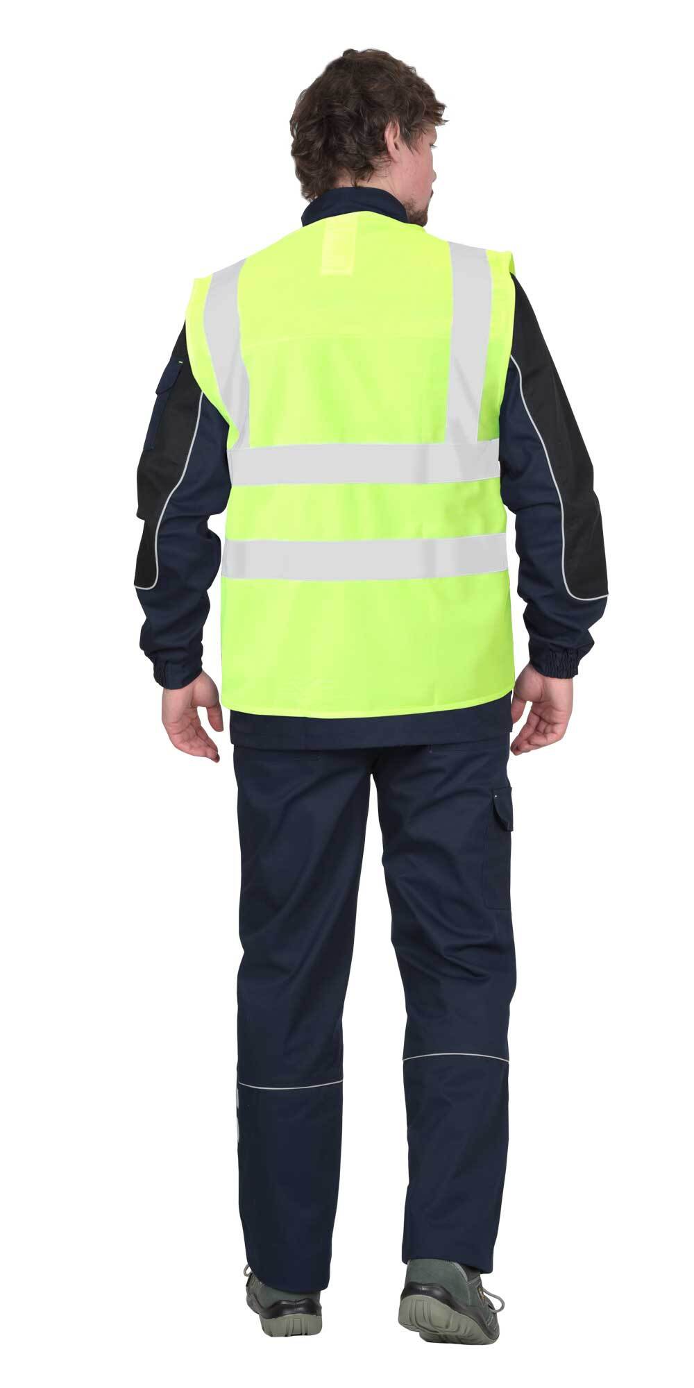 Жилет сигнальный SIRIUS повышенной видимости для безопасности сотрудников в дневное и темное время суток. 1 класс защиты. Изготовлен из трикотажного полотна плотностью 100 г/кв.м с 2 горизонтальными и 2 вертикальными лентами СОП (ширина 50 мм) и центральной застежкой на липкую ленту велькро.