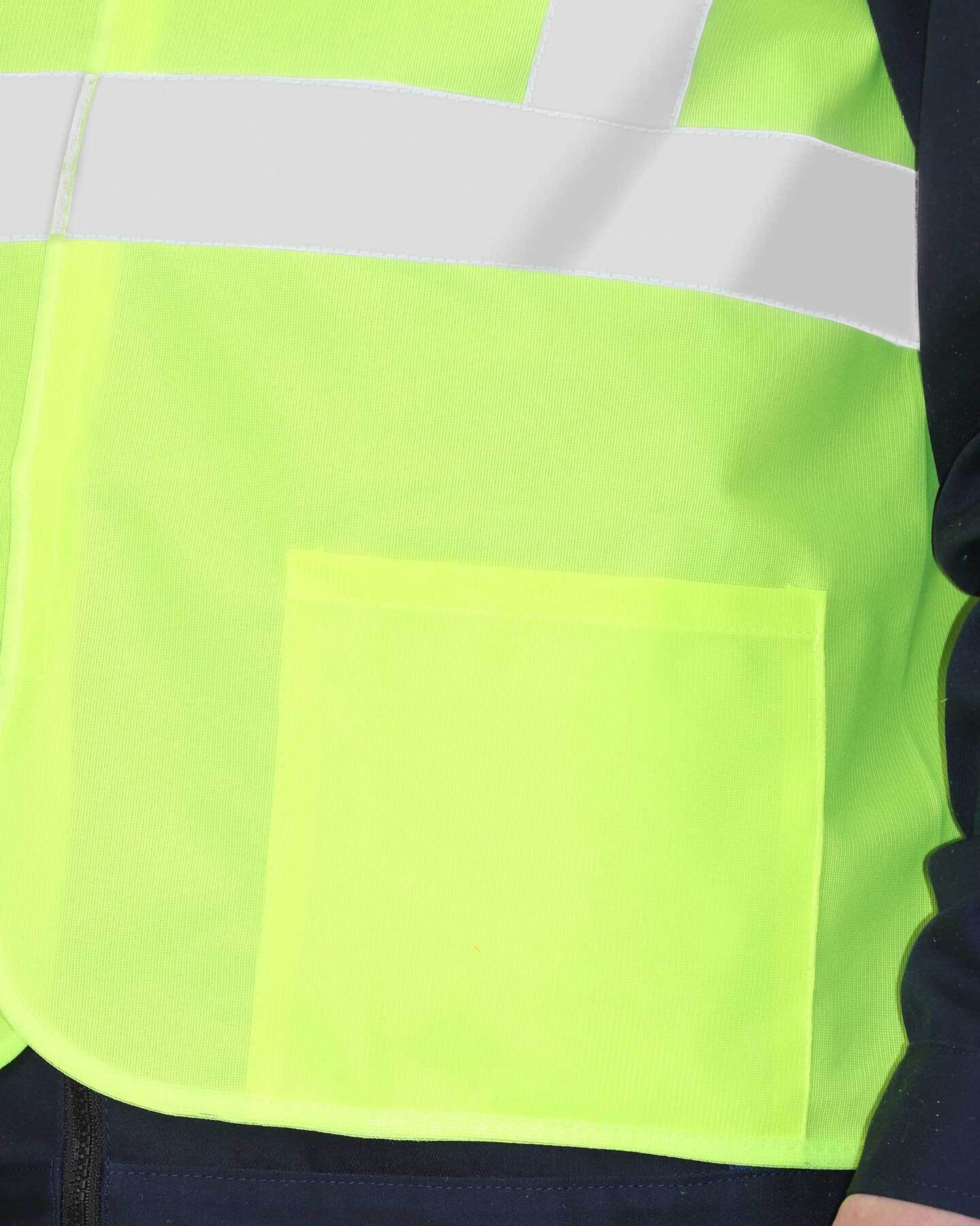 Жилет сигнальный SIRIUS повышенной видимости для безопасности сотрудников в дневное и темное время суток. 2 класс защиты. Изготовлен из трикотажного полотна плотностью 120 г/кв.м с 1 горизонтальной и 2 вертикальными лентами СОП (ширина 50 мм) и центральной застежкой на липкую ленту велькро. Наличие боковых карманов.